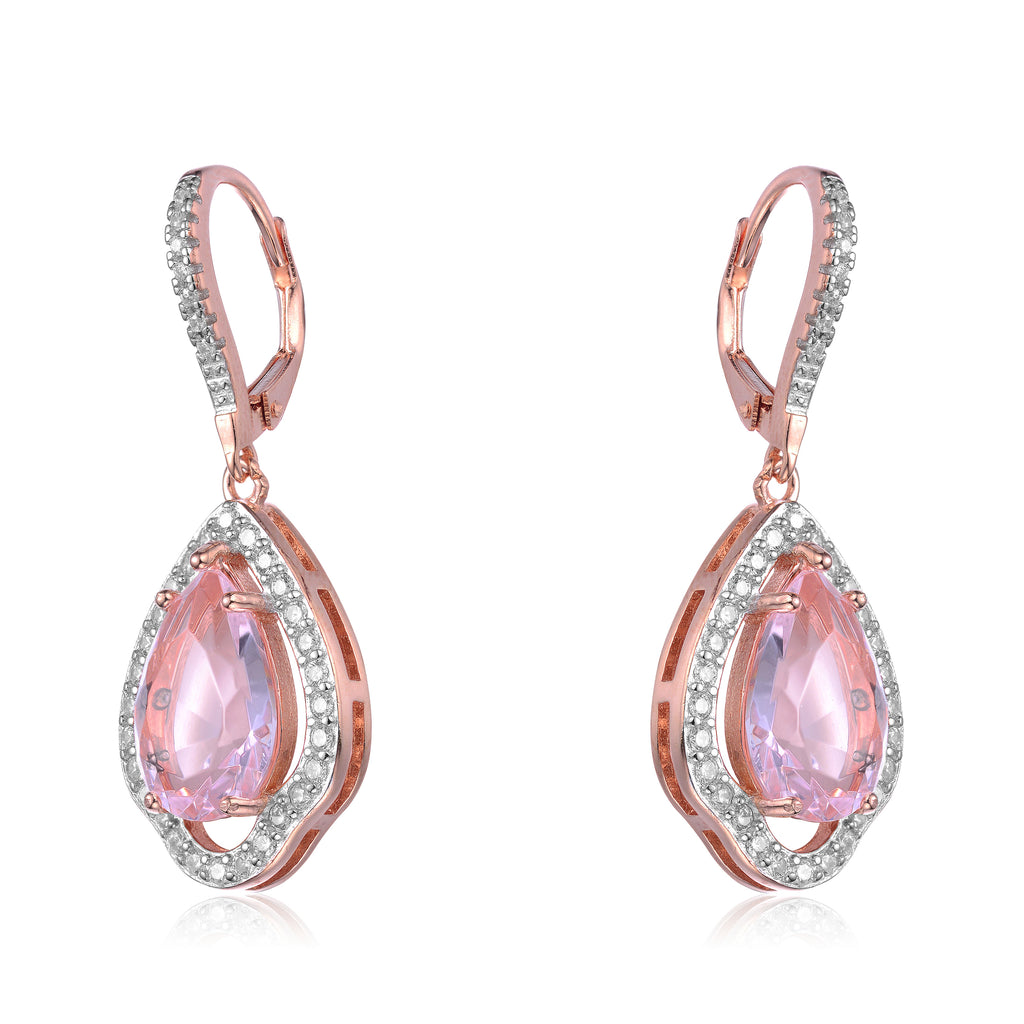 Beautifully crafted drop earrings with a pear shaped light purple cubic zirconia accents in the centerpiece. These sterling silver drop earrings are plated with rose gold and secured with leverback clasp.