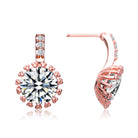 Refined and timeless, these sterling silver earrings are beautifully finished with luxurious 18K rose gold plating and adorned with shimmering clear round cubic zirconia accents. A brilliant solitaire center stone is secured by elegant triple prongs, creating a classic silhouette that exudes sophistication and grace. Designed with a comfortable butterfly backing, this essential style is perfect for everyday elegance or special occasions. Available in your choice of Rose, White, or Morganite.