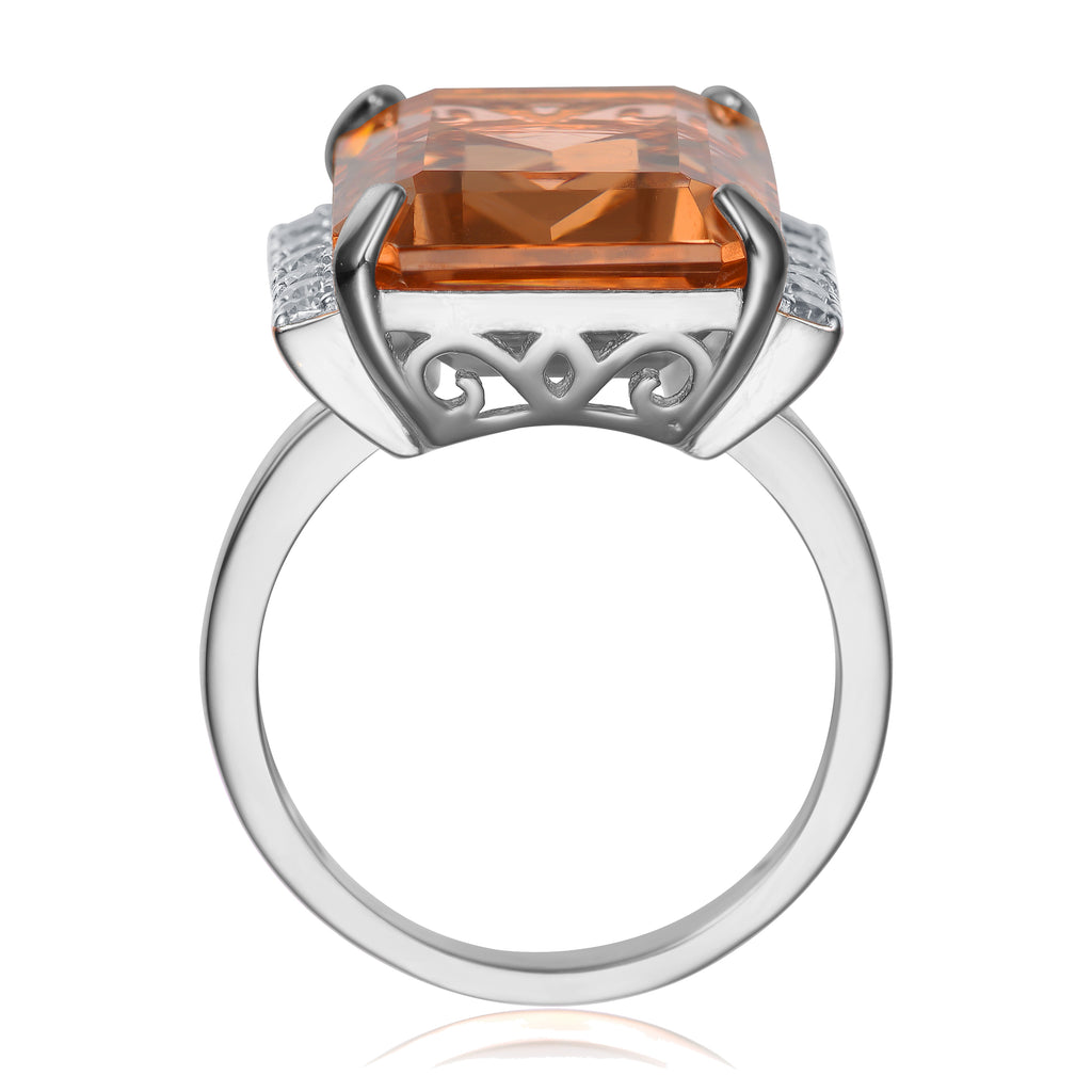 Large, well-cut orange cubic zirconia with small white cubic zirconia on both sides. This fashionable ring is made from sterling silver plated with rose gold that compliments the ring style.