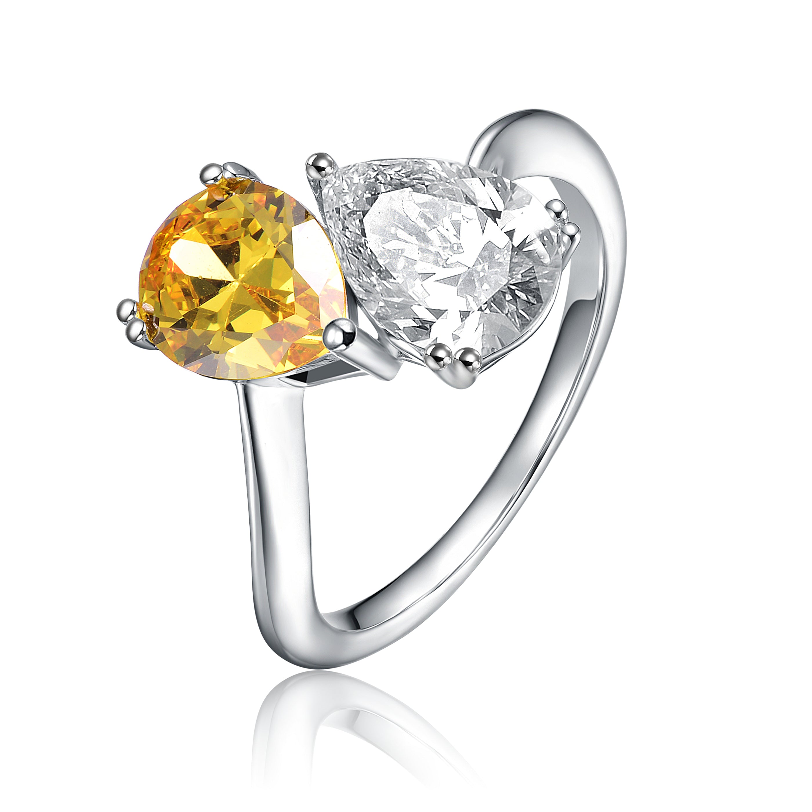 Stylish Sterling Silver Rhodium Plated Clear and Yellow Cubic Zirconia Bypass Ring . This one of a kind item features a design made out of two bands made out of solid gold, one ending with large yellow pear and the other with clear pear cubic zirconia stone. Crafted of Sterling Silver with Rhodium Plating and it is available in size 6,7 or 8. Perfect piece of jewelry for stylish combinations. This item also makes a sensational gift.