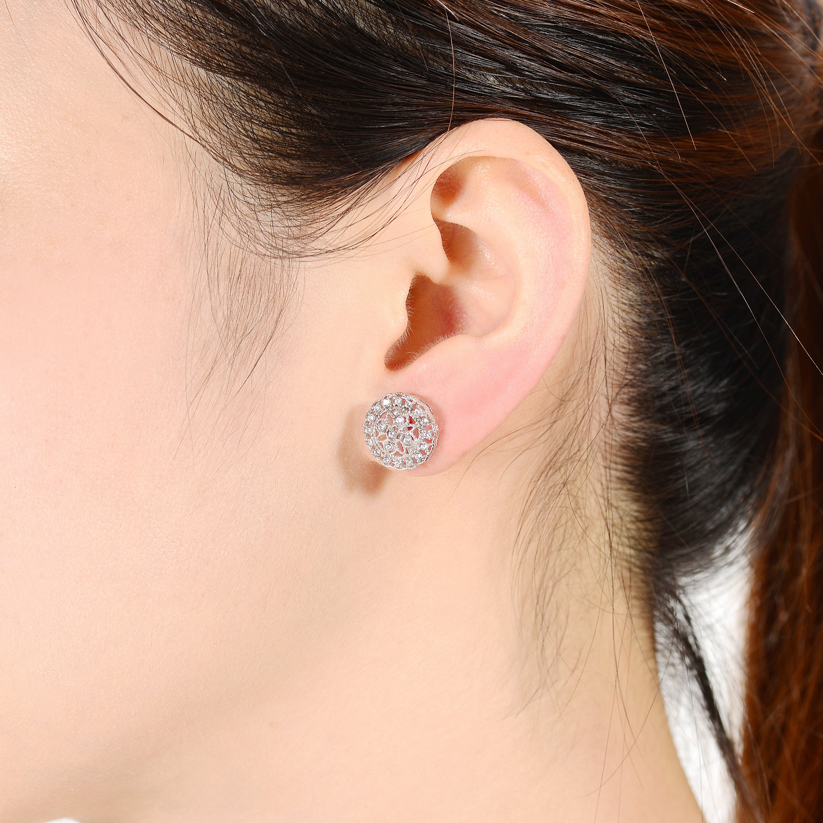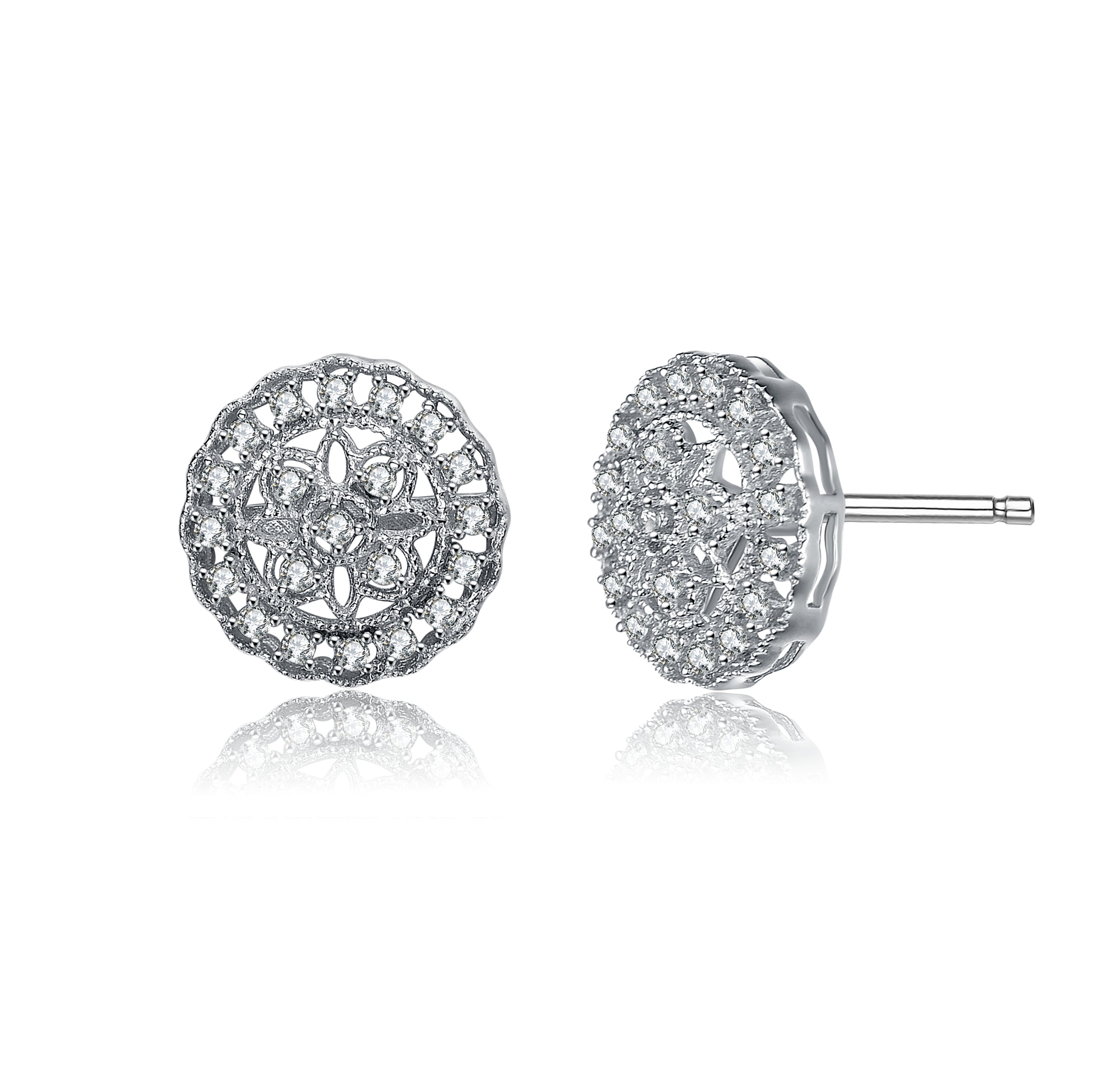 Stylish .925 Sterling silver cubic zirconia floral stud earrings. These earrings feature interesting design made out of clear round cubic zirconia stones paved on the curvy metal frame and on the inside as well forming a flower shape. Crafted of .925 Sterling silver with rhodium plating and secure with butterfly closure.