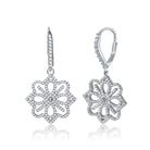 Elegant .925 Sterling silver cubic zirconia flower drop earrings. These dainty earrings feature clear round cut cubic zirconia stones decorating fancy flower shape. Crafted of .925 Sterling silver in rhodium plating and secure with lever back clasps.