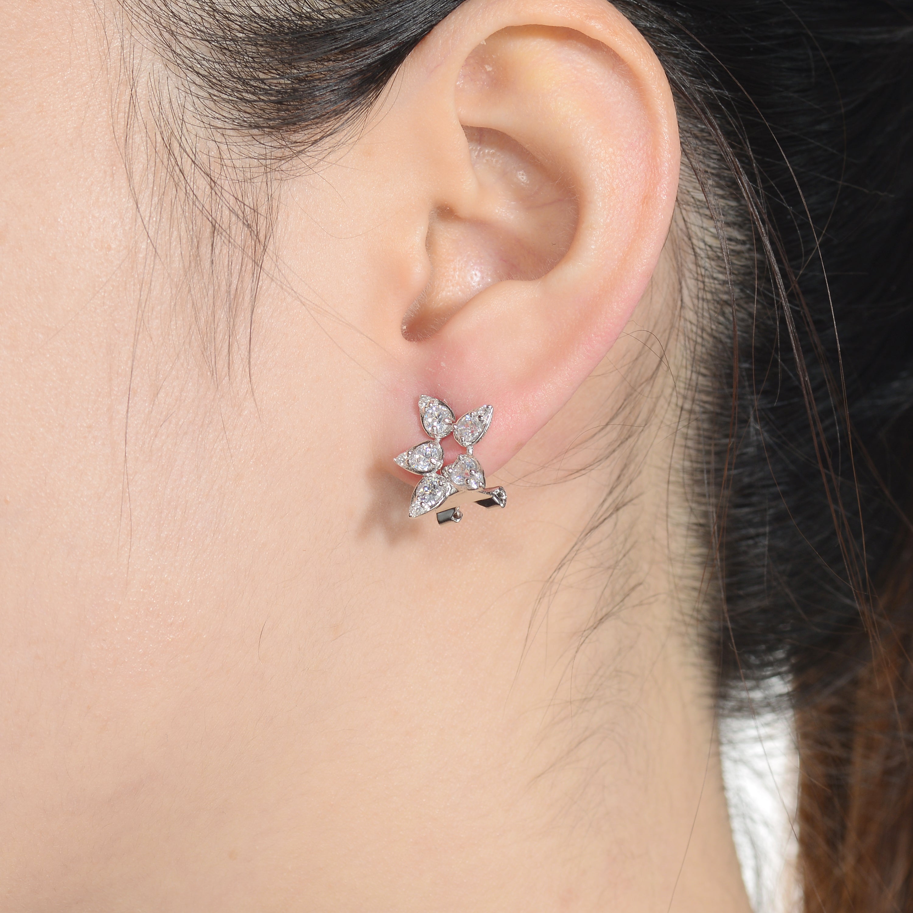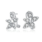 Classy .925 Sterling silver cubic zirconia leaf stud earrings. These earrings feature clusters of small and large clear round cubic zirconia stones that make the leaf shaped design. Crafted of .925 Sterling silver in rhodium plating and secure with omega closure.