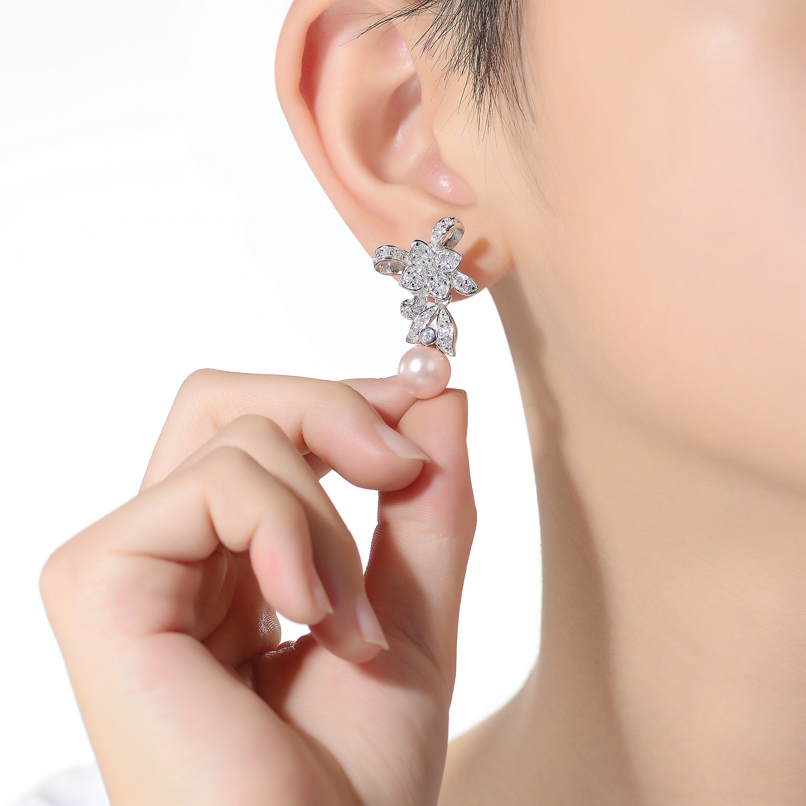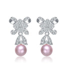 These romantic sterling silver earrings are fit for a princess. They feature clear cubic zirconia stones With a pink Pearl Hanging down.