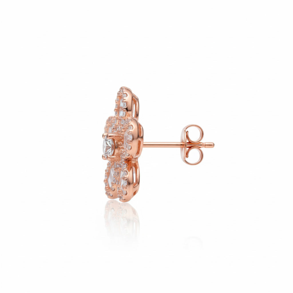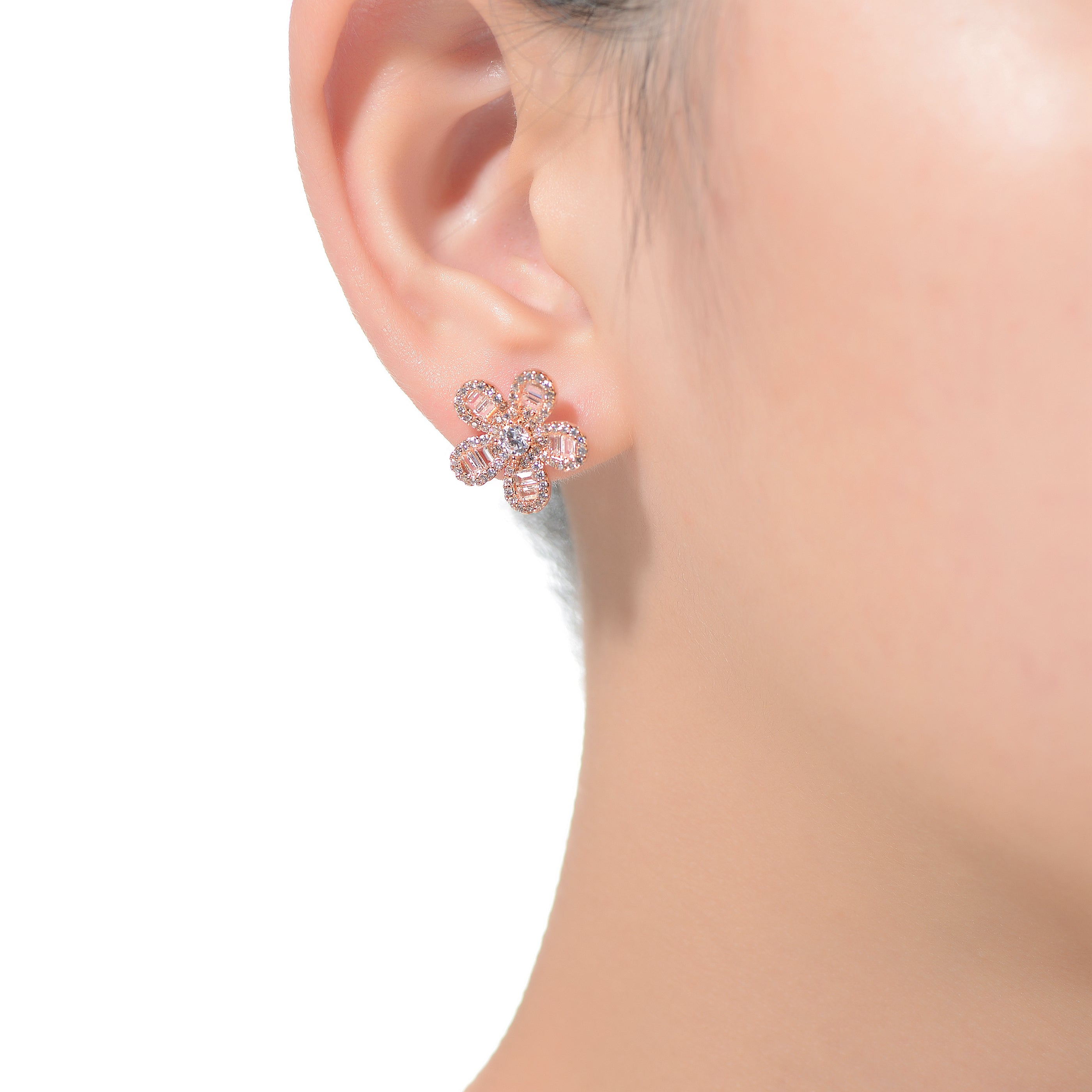 Stylish Sterling Silver 18K Rose Plated Clear Cubic Zirconia Flower Stud Earrings. This pair of earrings features interesting flower design. The petal frame is paved with small clear round cubic zirconia stones, accented with large clear round cubic zirconia stone in the center. Each petal features trapped baguette stones within the frame. Crafted of Sterling Silver with 18K Rose Plating and it is secured with butterfly closure. Perfect piece of jewelry for stylish combinations. This item also makes a sensational gift.