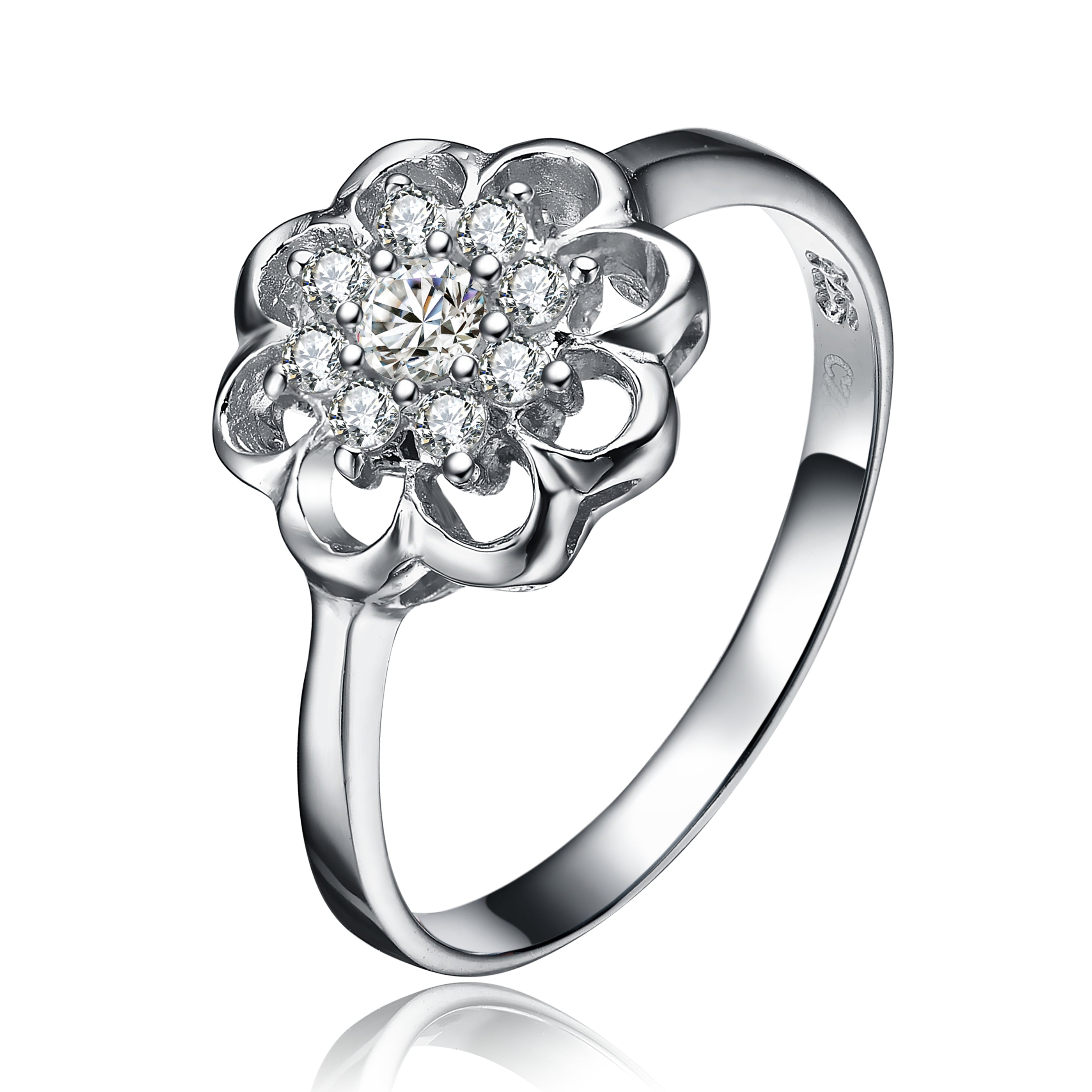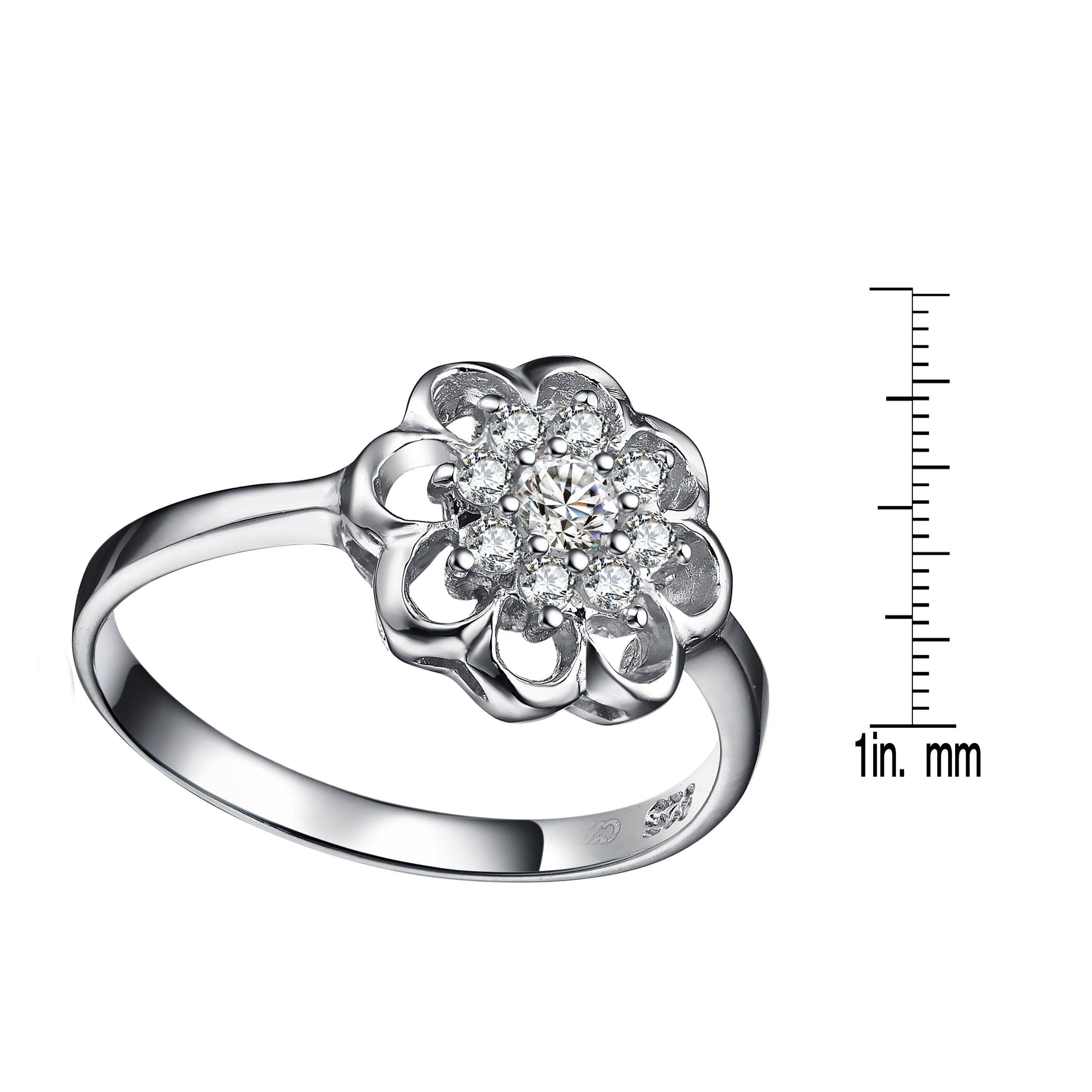 This charming flower ring features a delicate arrangement of round-cut cubic zirconia stones. The floral design adds a soft yet eye-catching aesthetic to the polished band. Finished with rhodium plating, the sterling silver maintains a bright and reflective surface. Each stone is carefully set to enhance brilliance and symmetry. The graceful silhouette makes it suitable for everyday wear or gifting. This ring blends playful elegance with classic craftsmanship.