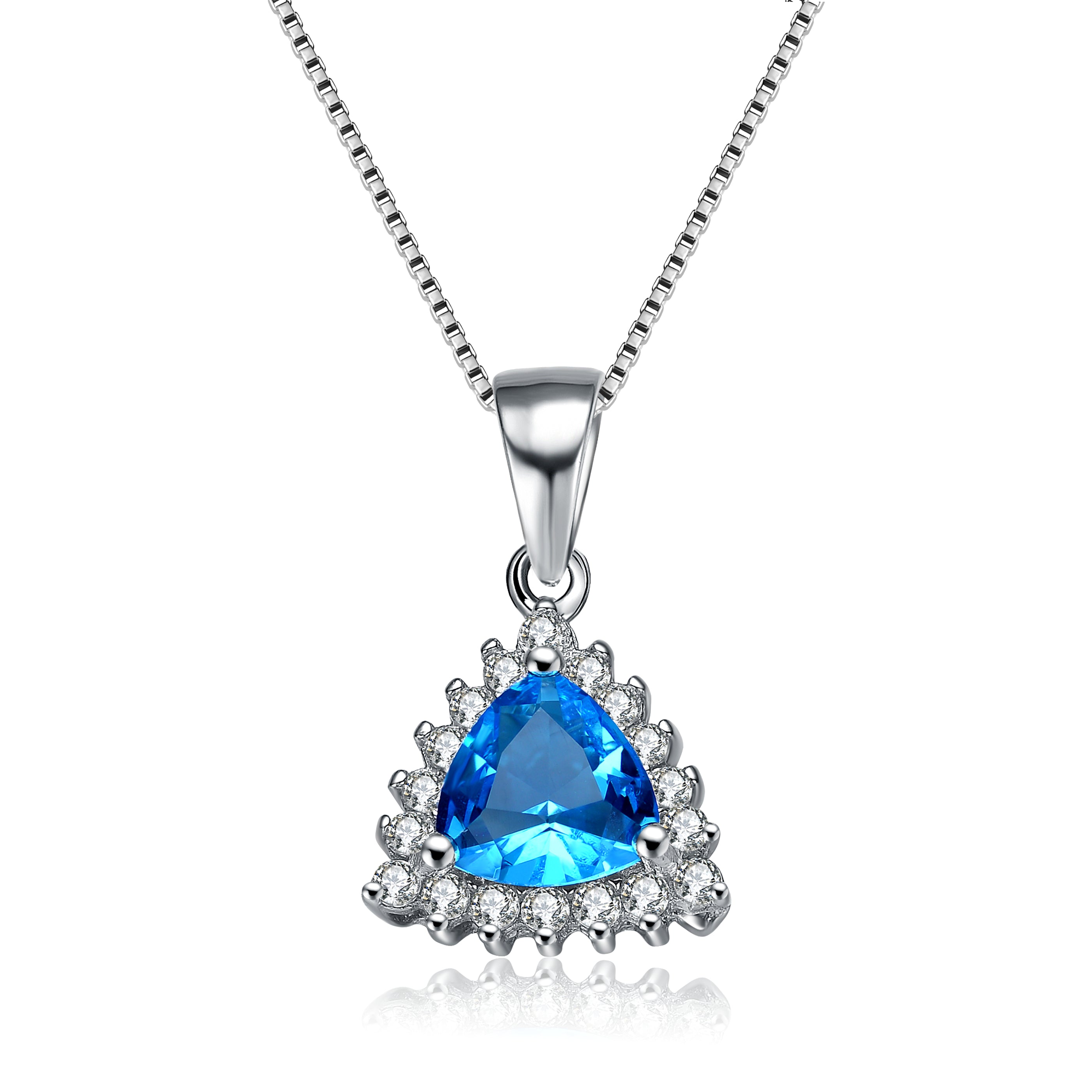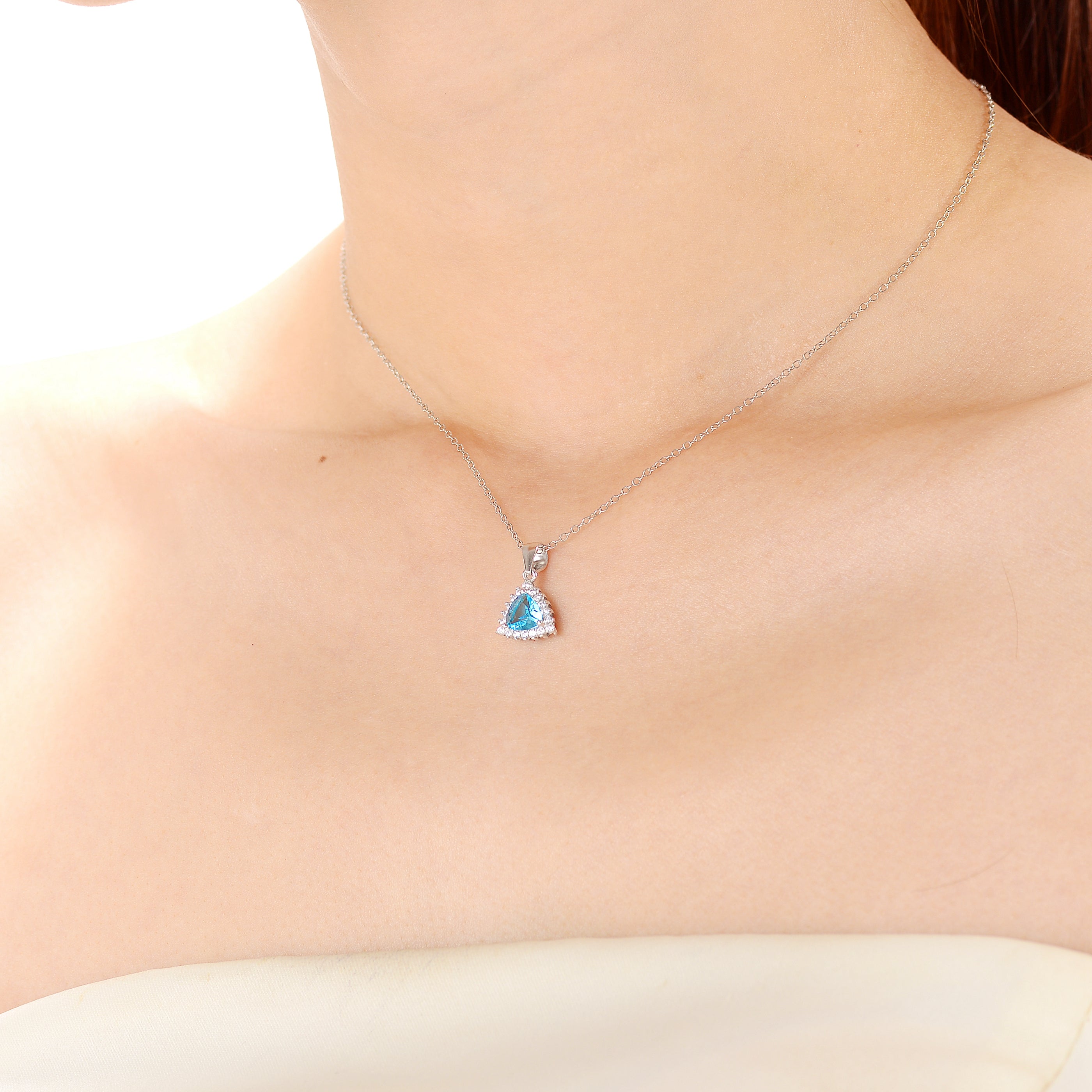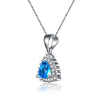 This refined necklace highlights a luminous crystal blue cubic zirconia framed by a sparkling halo of clear stones. The cool-toned color palette delivers a fresh and elegant aesthetic. Crafted in polished sterling silver, the pendant offers lasting shine and durability. Its sleek silhouette makes it ideal for formal occasions or elevated everyday wear. The balanced design draws attention without overpowering your look. This necklace brings timeless elegance with a modern touch.