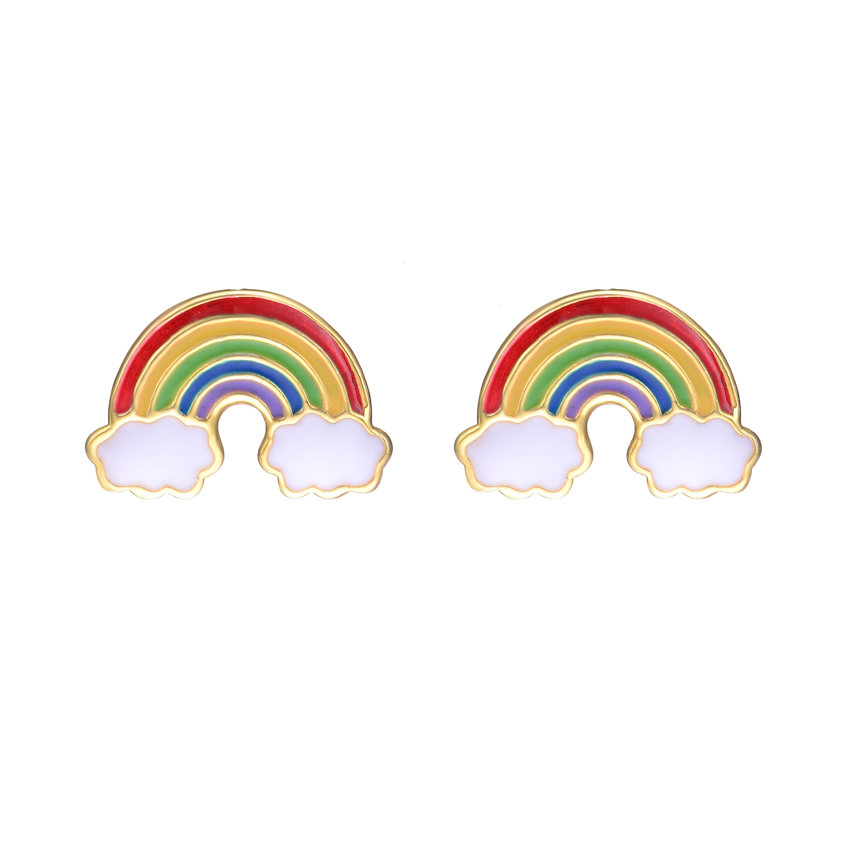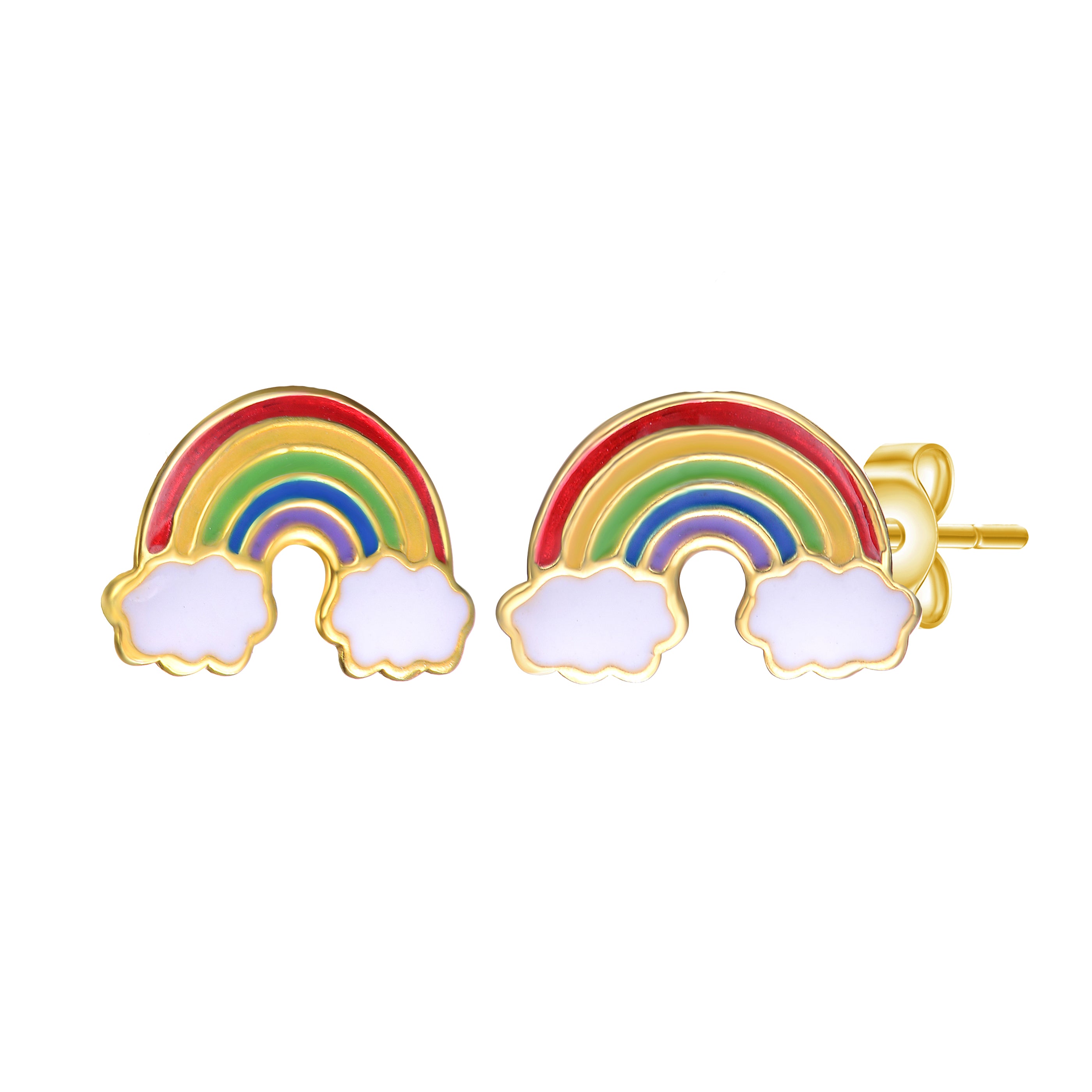 14k Gold Plated Colorful Rainbow Enamel & White Cloud Stud Earrings. These joyful 14k gold plated stud earrings feature a colorful rainbow and bright white clouds, all designed in a rich, high-quality enamel, adding cheerfulness to your day or night wardrobe. There is also happiness and abundance of hope and laughs at the end of every rainbow! Butterfly backs keep these eye-catching earrings in place, making them easy to slip on and off the ears.