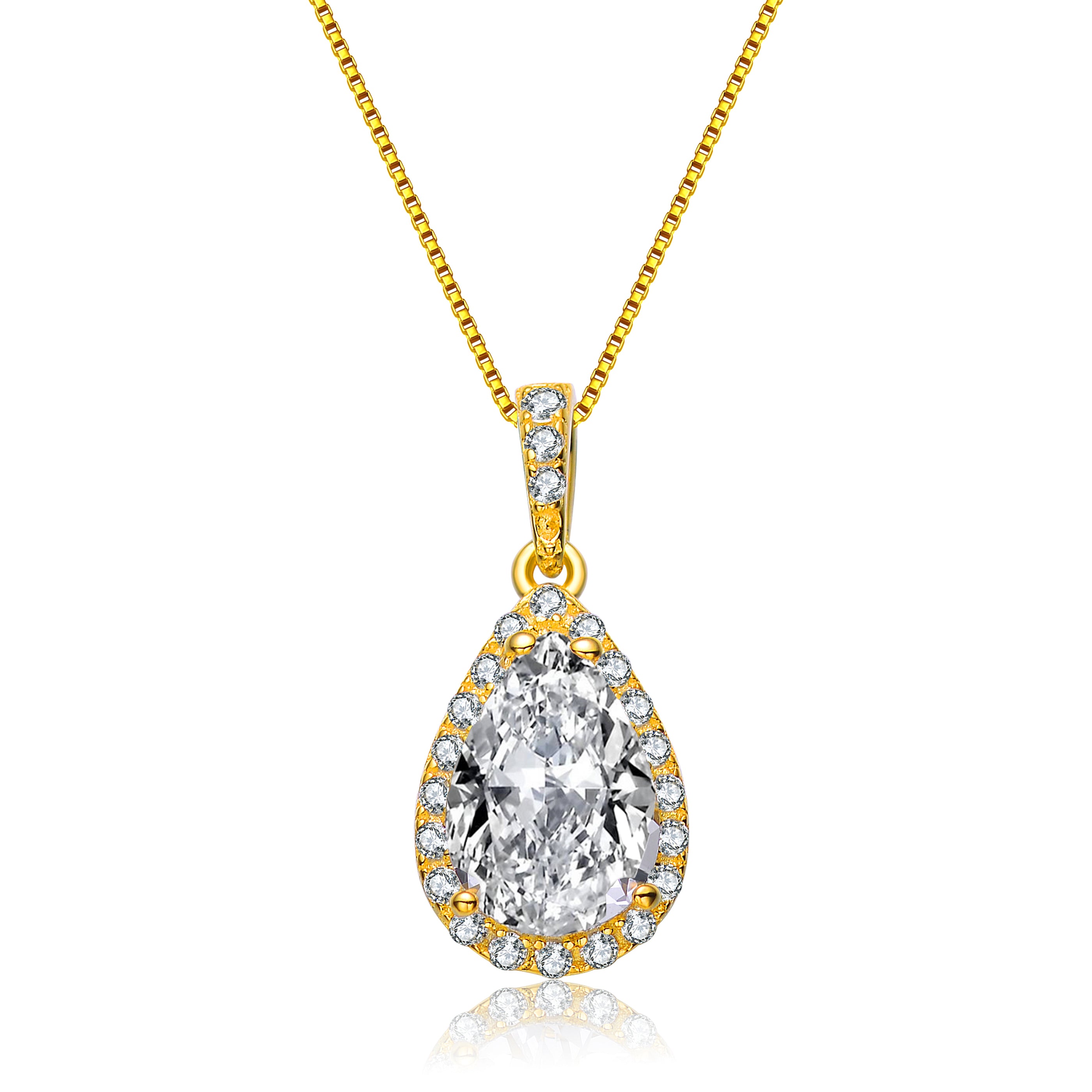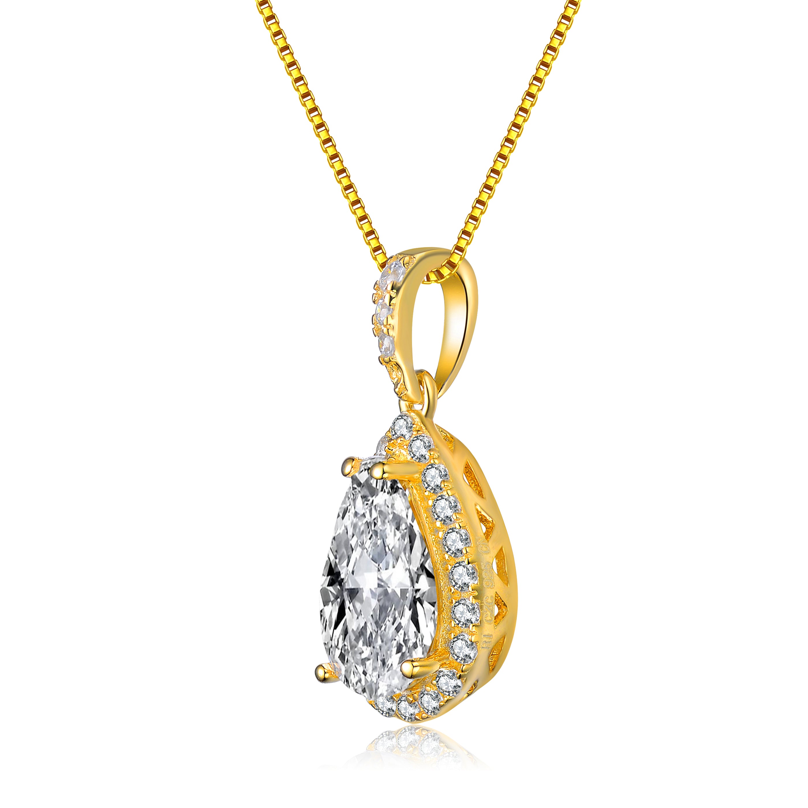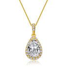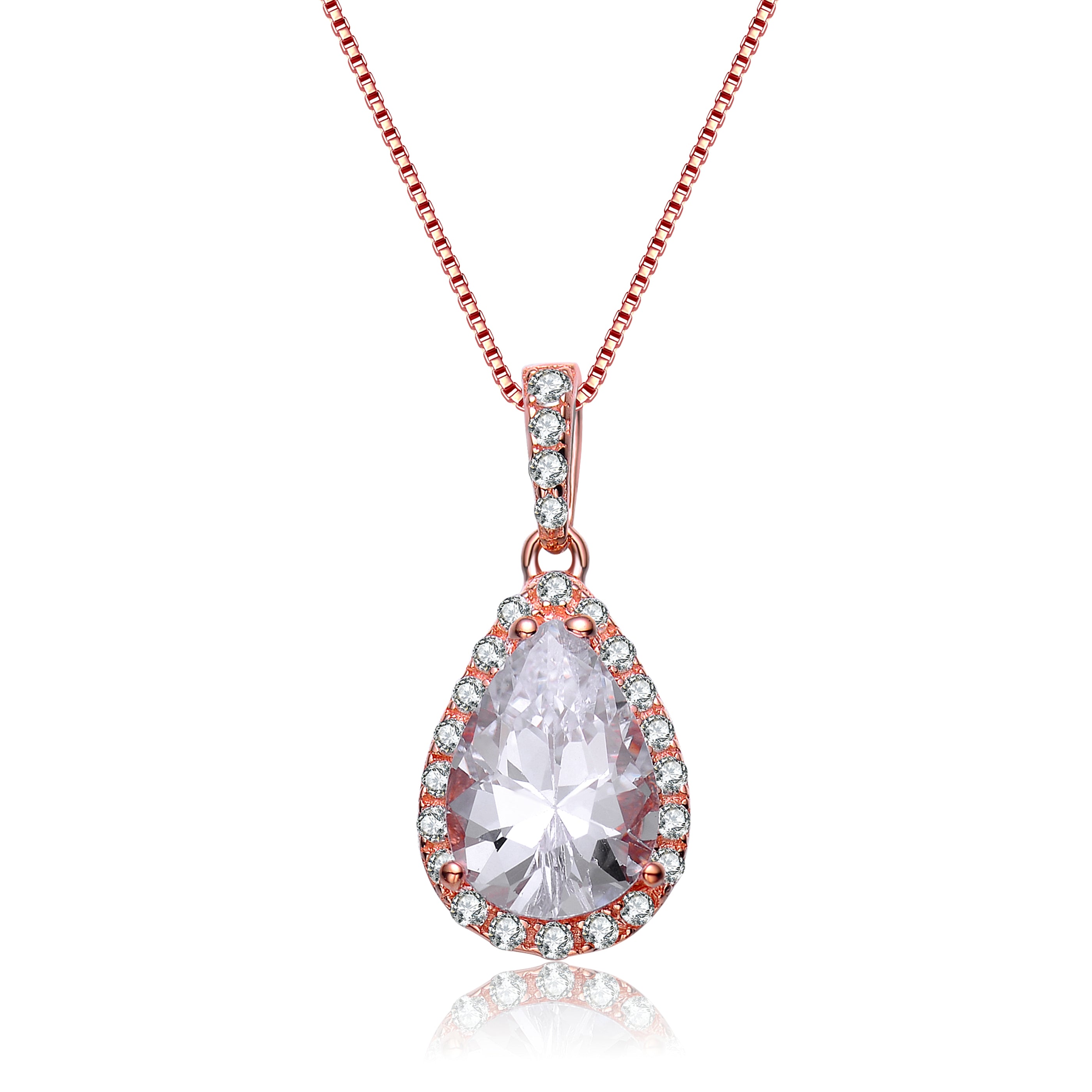 This sophisticated pendant features a pear-shaped cubic zirconia centerpiece, exquisitely framed by smaller round cubic zirconias set in a rose gold-plated sterling silver mount. The pendant is suspended from a matching rose gold-plated chain adorned with similar sparkling stones, creating an overall look of timeless elegance and luxury. This piece of jewelry is interesting for its intricate design and the contrast between the clear cubic zirconia and the warm hue of the rose gold plating, making it a captivating accessory for various occasions.