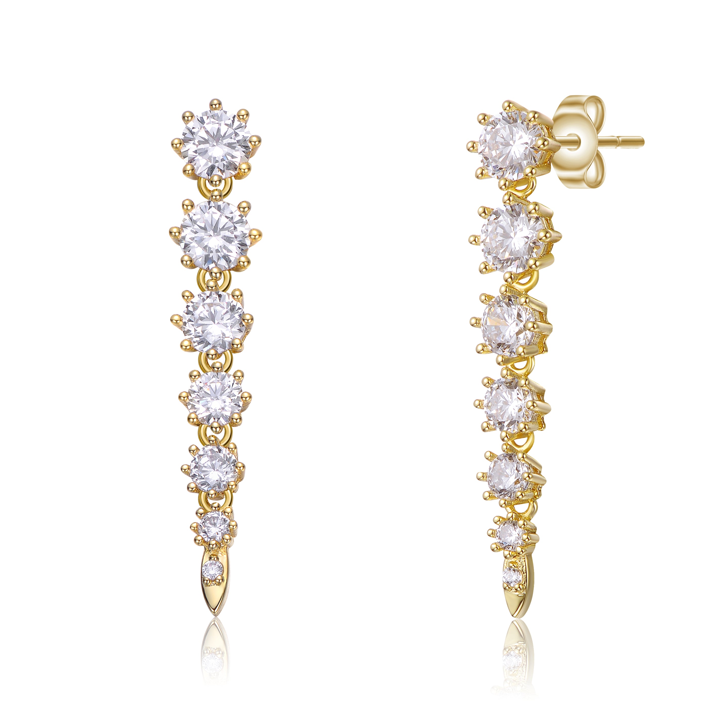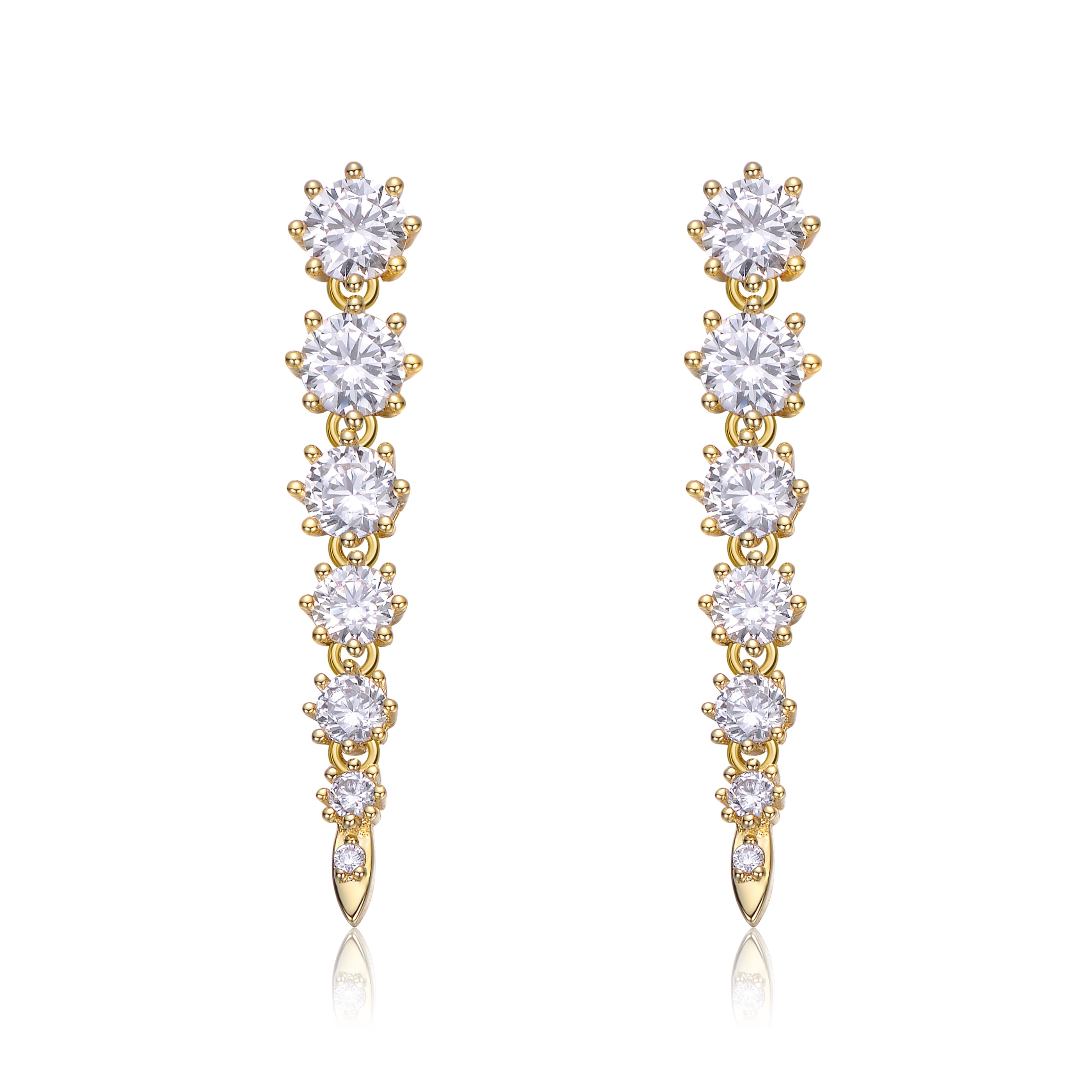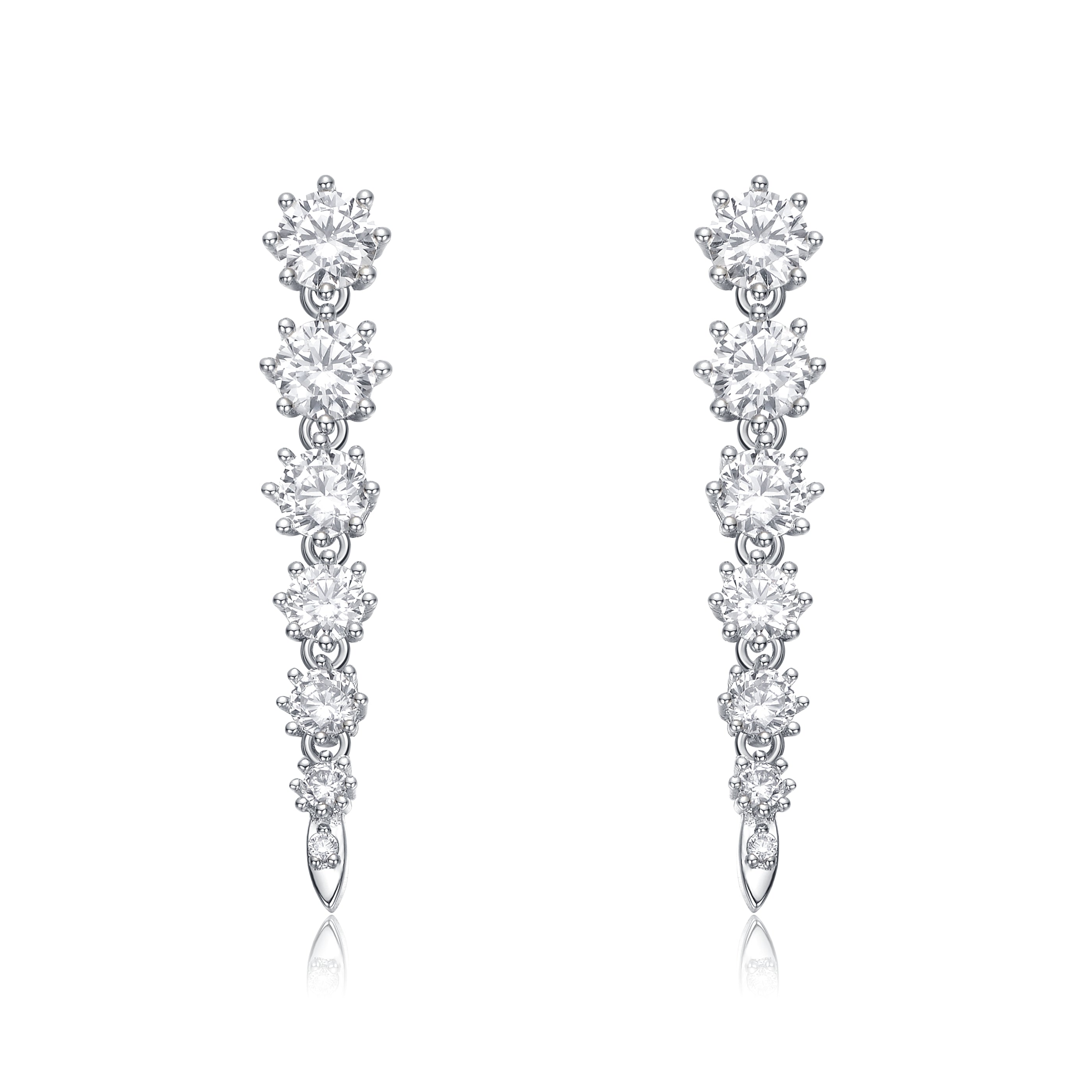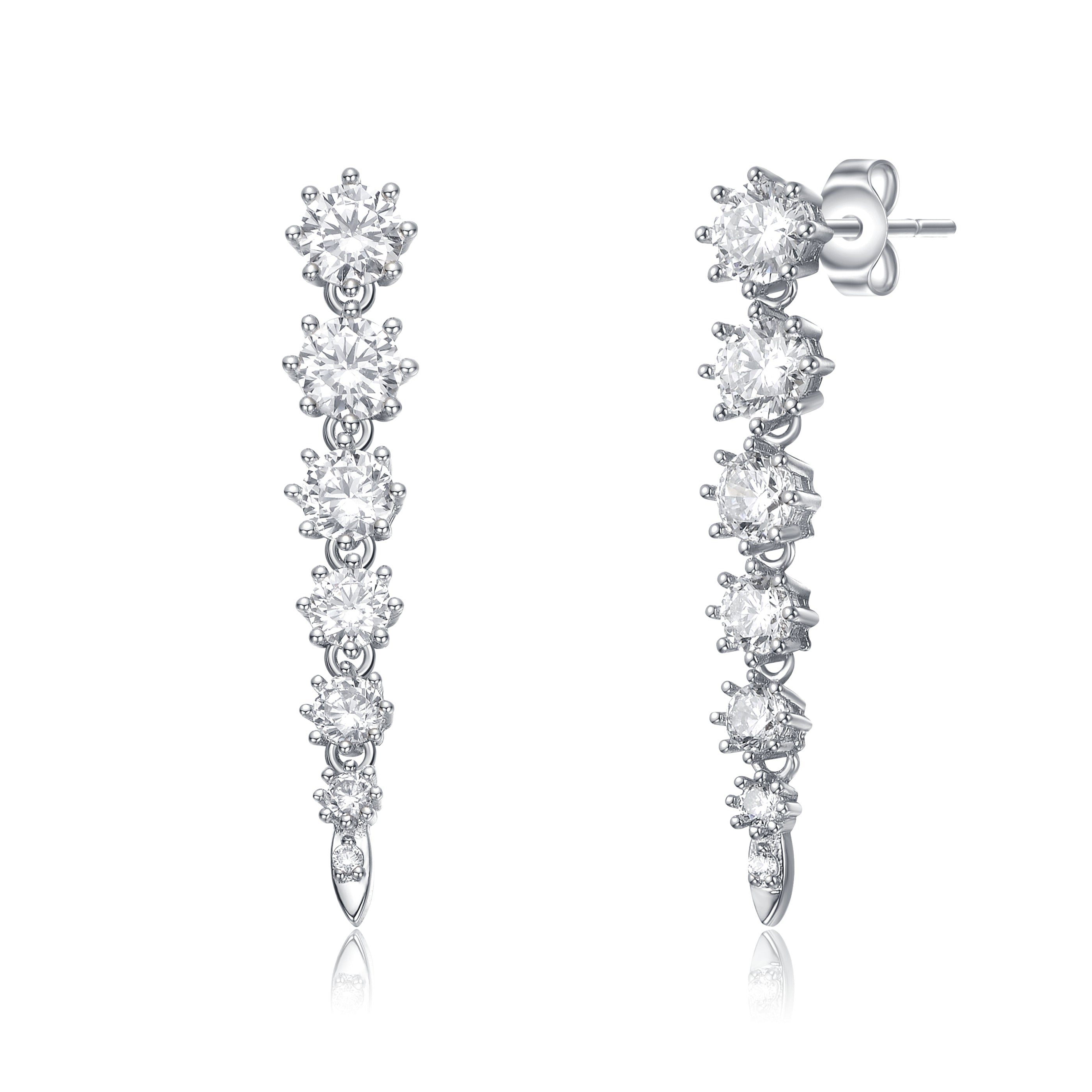 Sterling Silver Cubic Zirconia Linear Fringe Icicle Earrings. Icy and fire! These beautiful sterling silver linear earrings feature graduated-size round brilliant cut cubic zirconia prong set in round basket settings, giving them a vintage flair with added detail and shine. Butterfly backs keep these dangle earrings in place, adding gorgeous movement and eye-catching swing as they nestle on the ears.