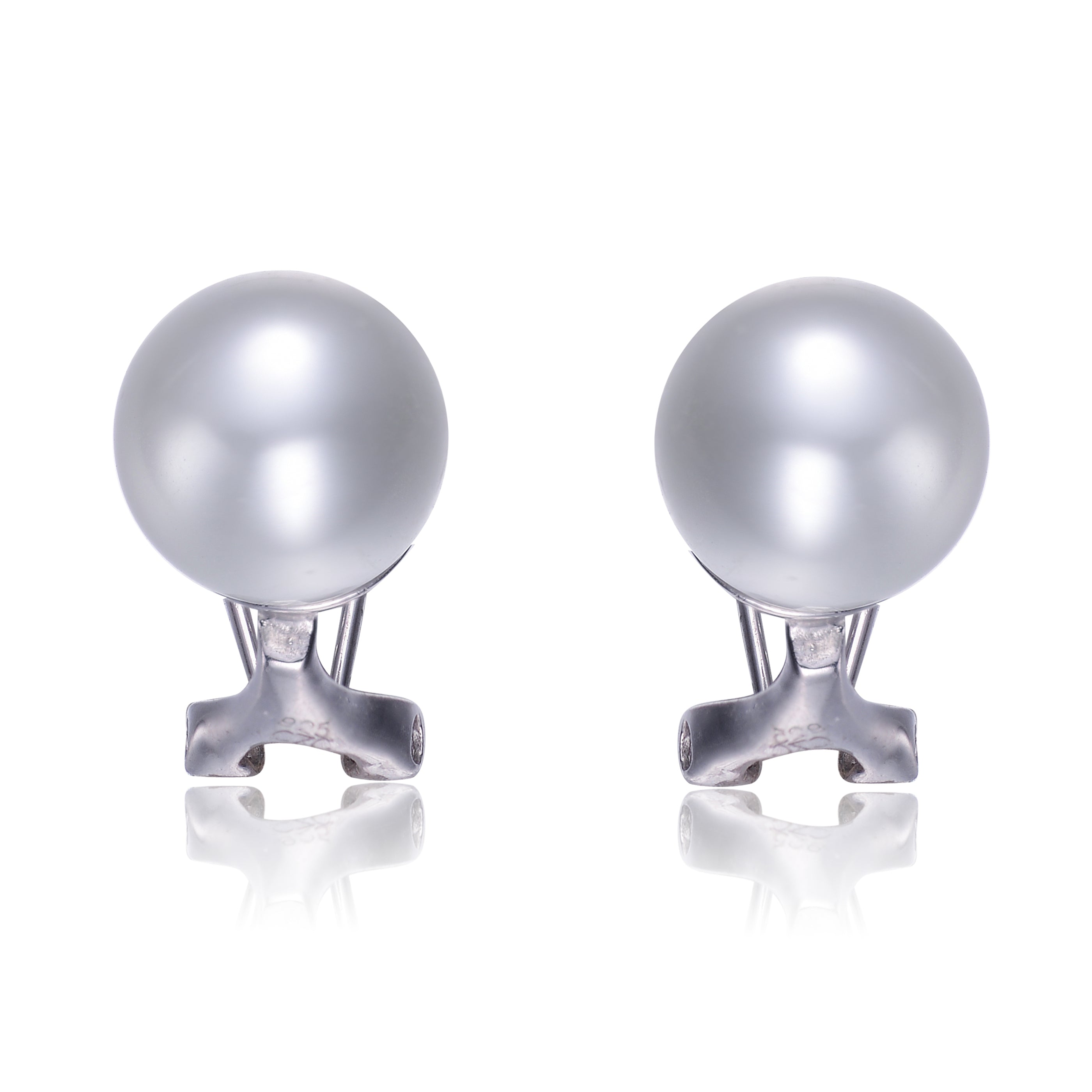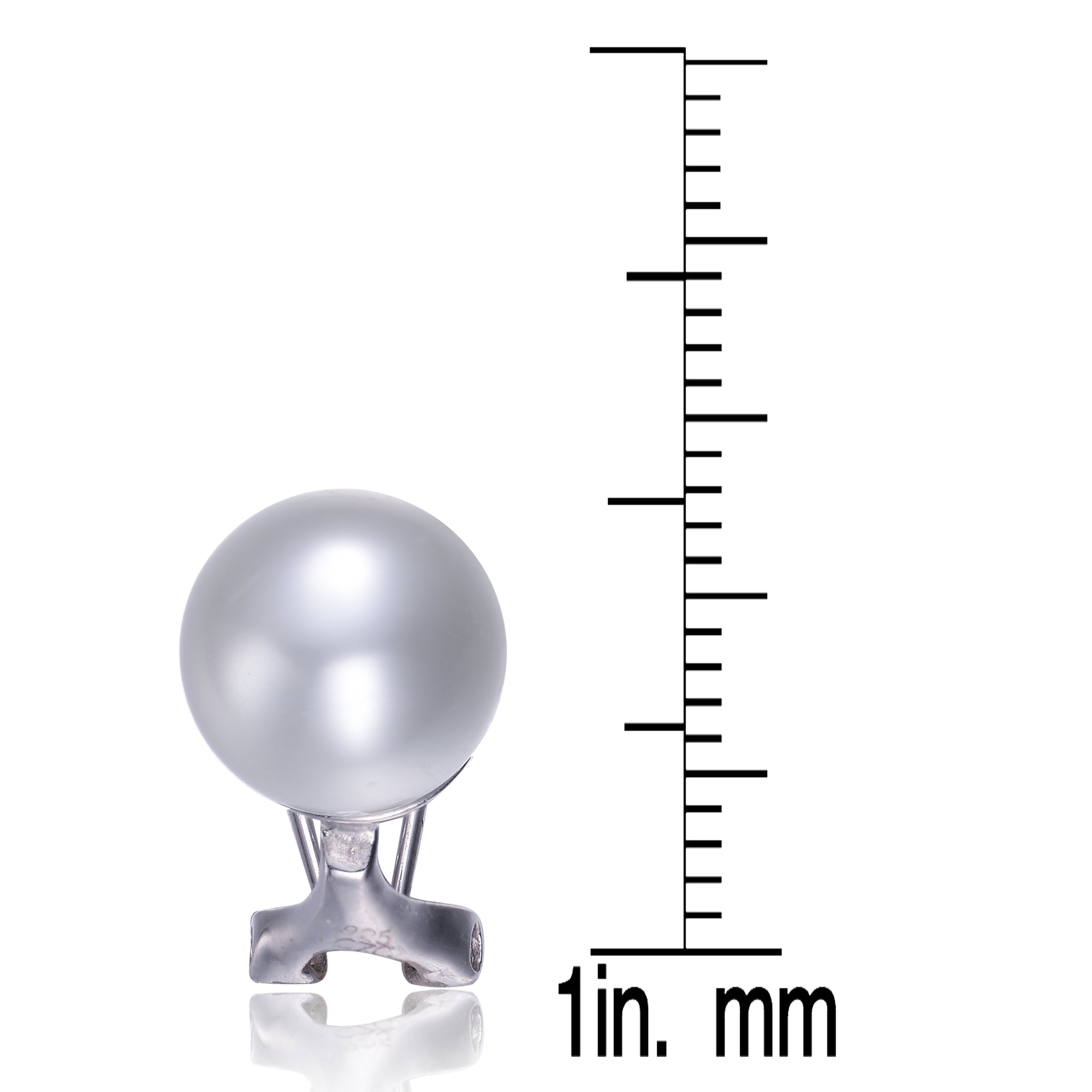 These fine earrings feature 14mm faux pearls. Crafted of .925 sterling silver, the earrings secure with omega clasps.