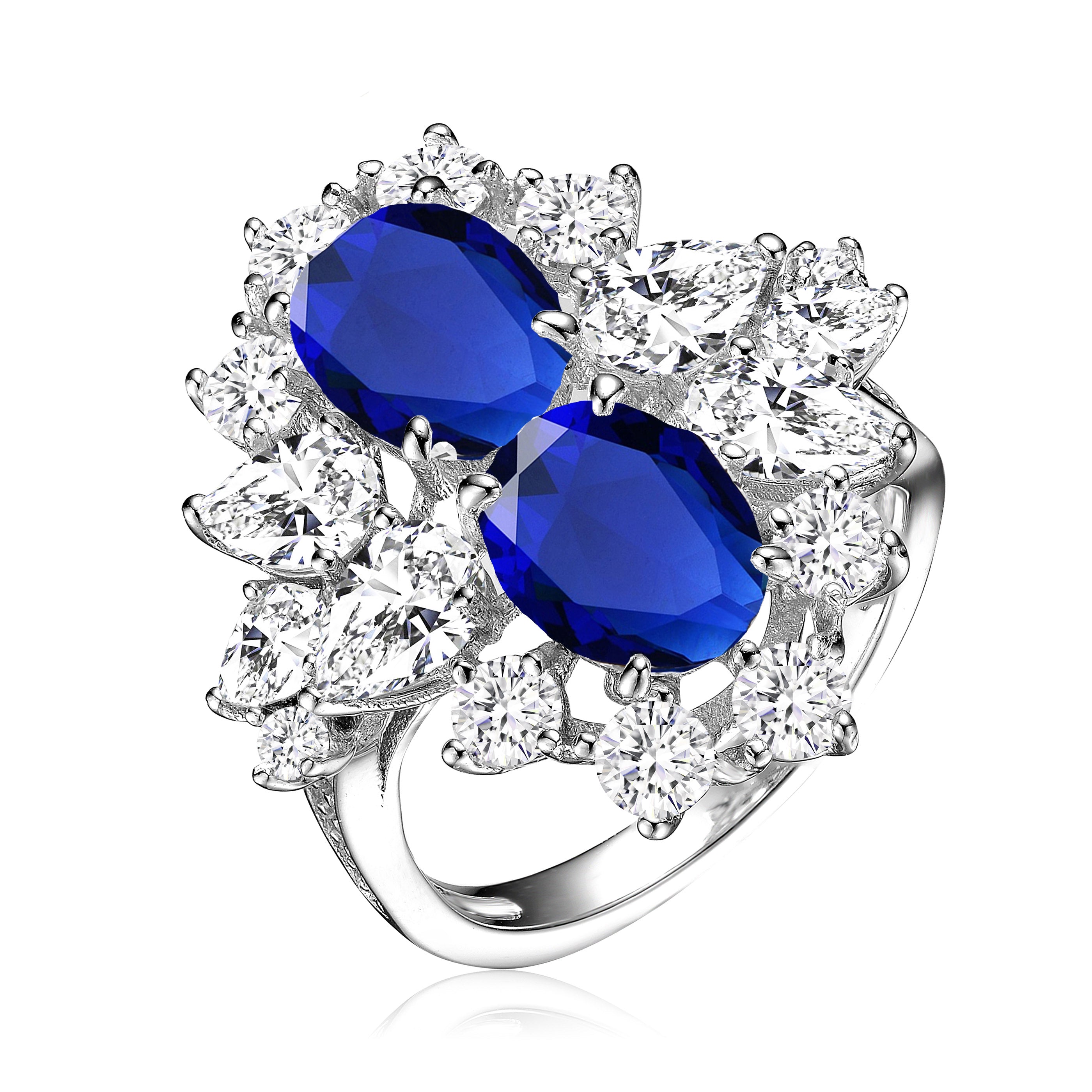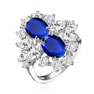 This ring features a unique design that features two Sapphire oval Cubic Zirconia clustered with clear pear and round Cubic Zirconia. This ring is perfect for a daytime hangout with friends or for a casual gathering. It is set in Sterling silver with Rhodiumn plated and this is available in size 5-9.