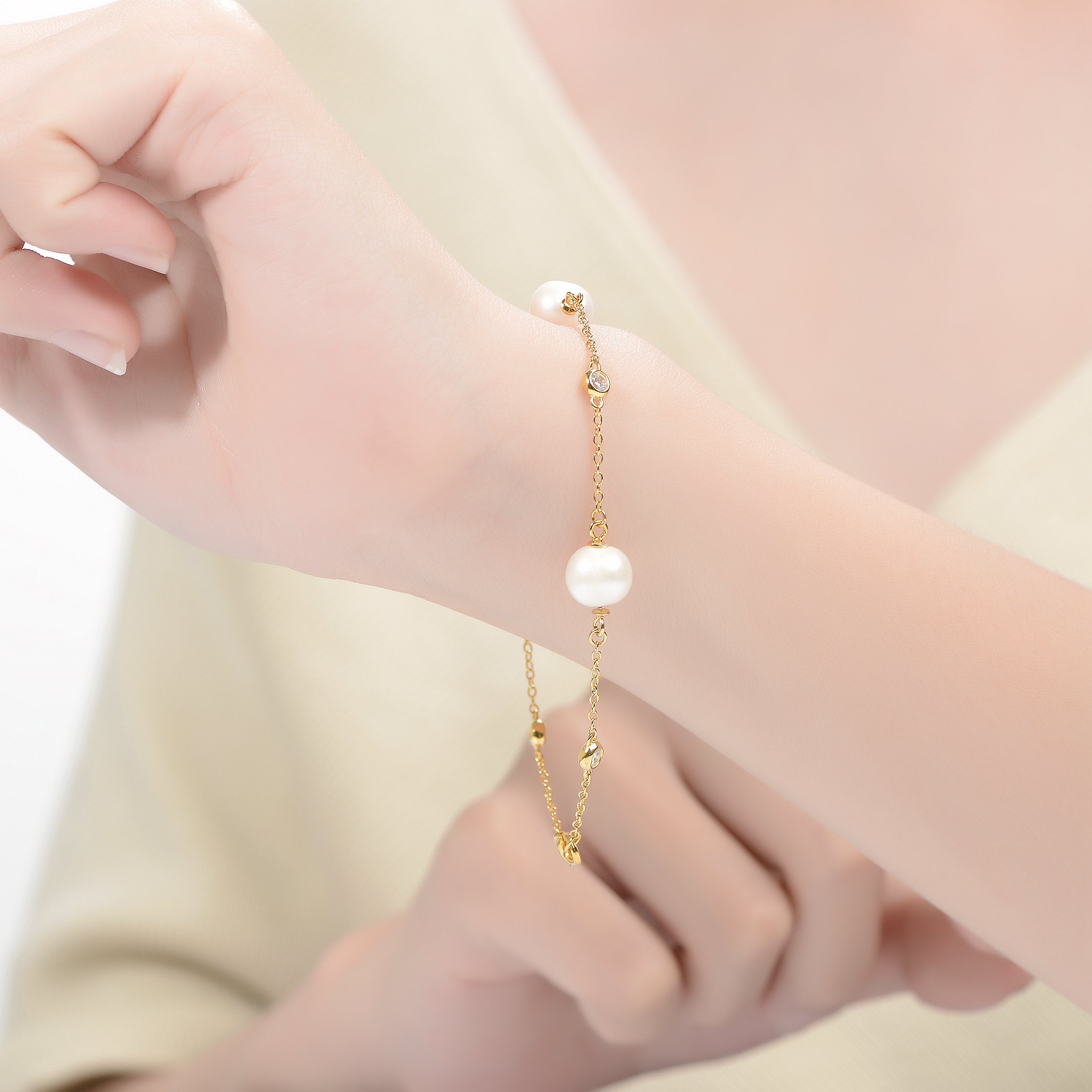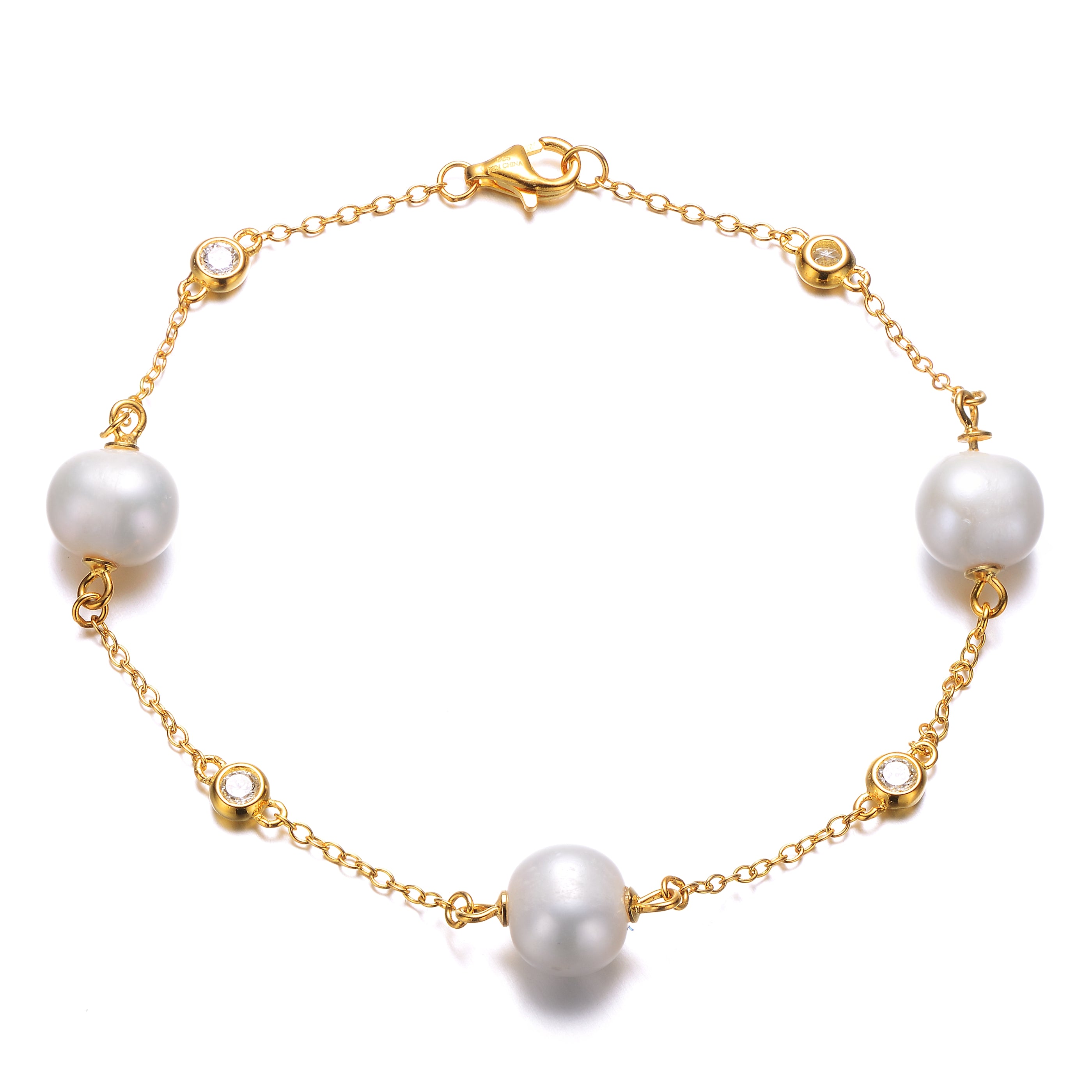14k Yellow Gold Plated with Freshwater Pearl & Cubic Zirconia Bezel Station Bracelet