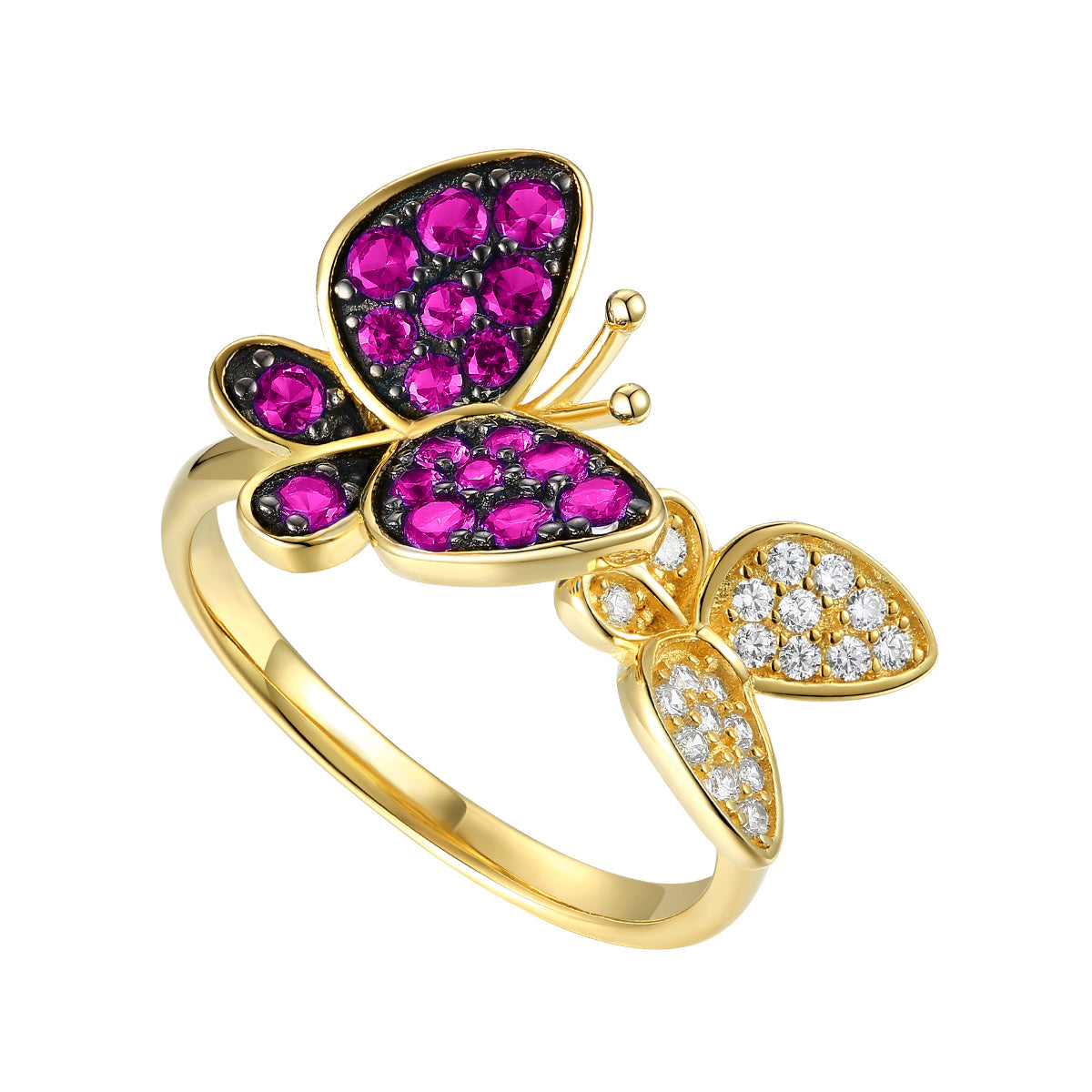 14k Gold Plated Sterling Silver with Ruby & Diamond Cubic Zirconia Double Butterfly Stacking Ring