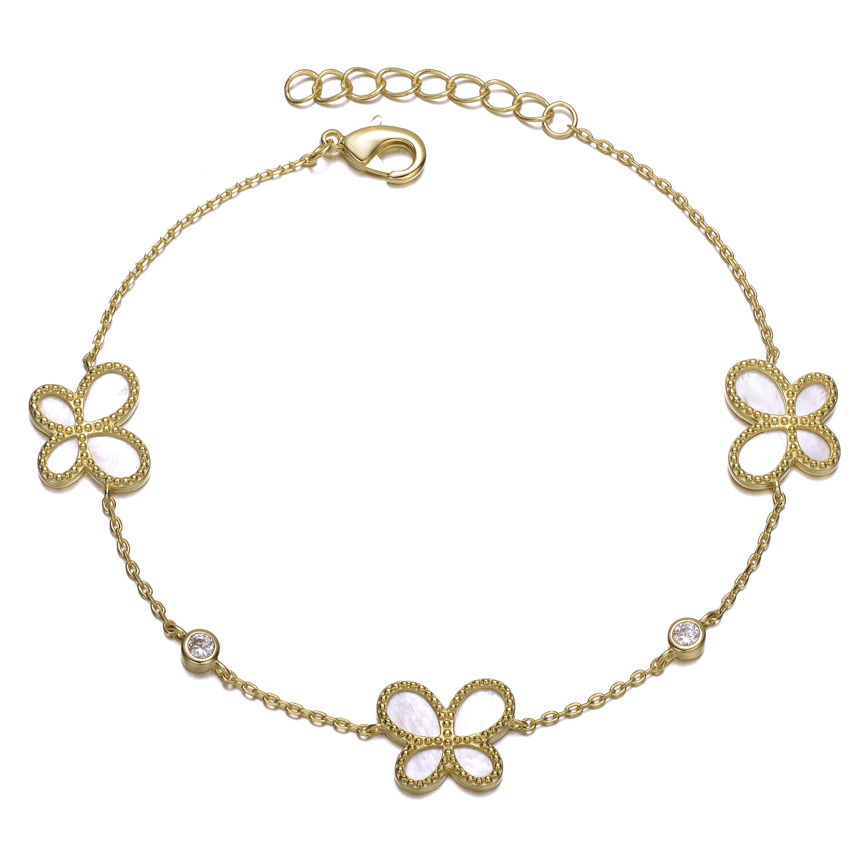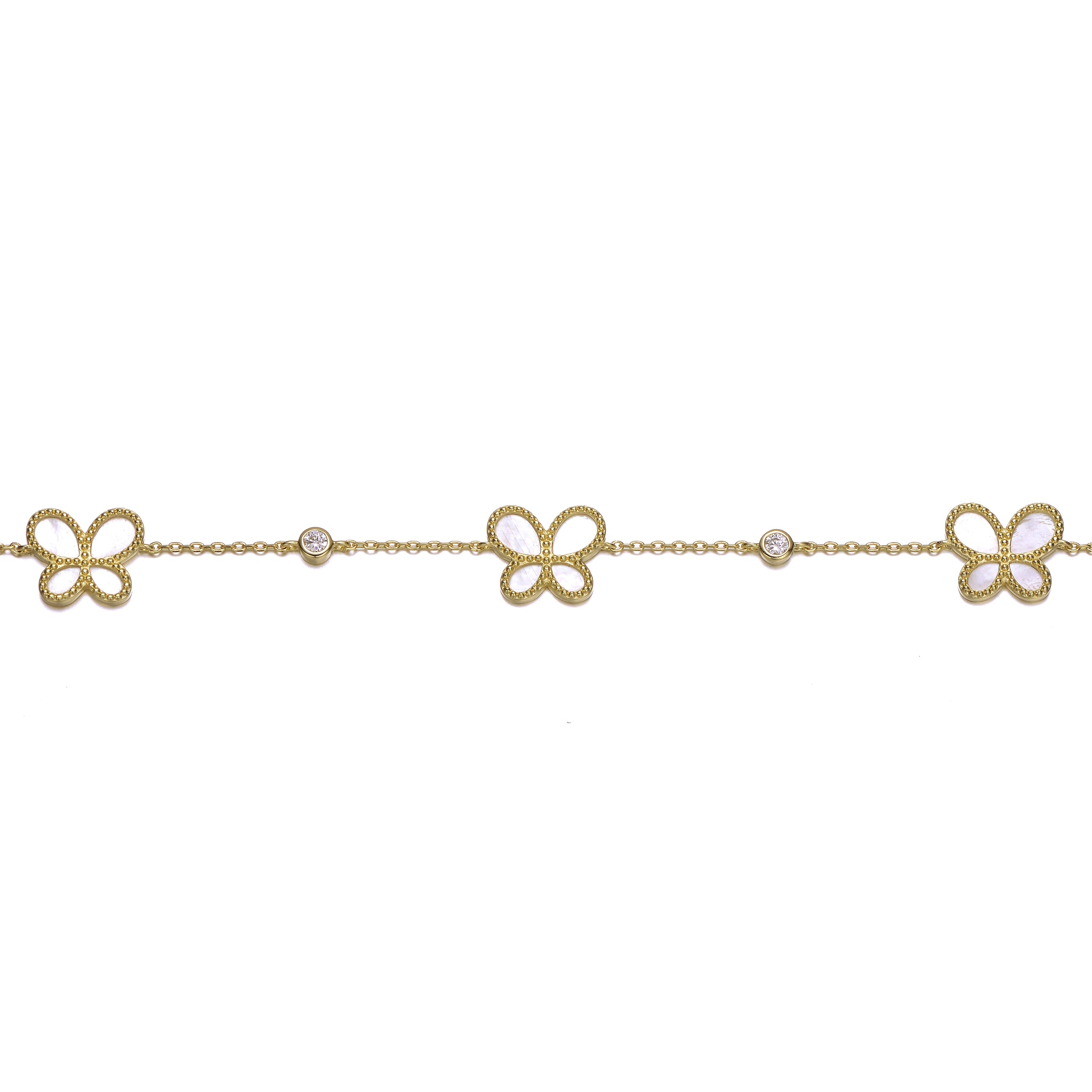 Adorn your wrist with elegance and charm with this stunning 14k gold plated mother of pearl dainty link butterfly bracelet. Featuring a 7+1 adjustable design, this bracelet is artfully crafted with three mother of pearl butterflies, each exquisitely spaced apart. Enhanced by cubic zirconia stones in a bezel setting between each butterfly, this piece radiates joy, love, and happiness. Perfect for layering and an uplifting addition to your bracelet collection, this versatile piece is an ideal gift for summer or year-round elegance.
