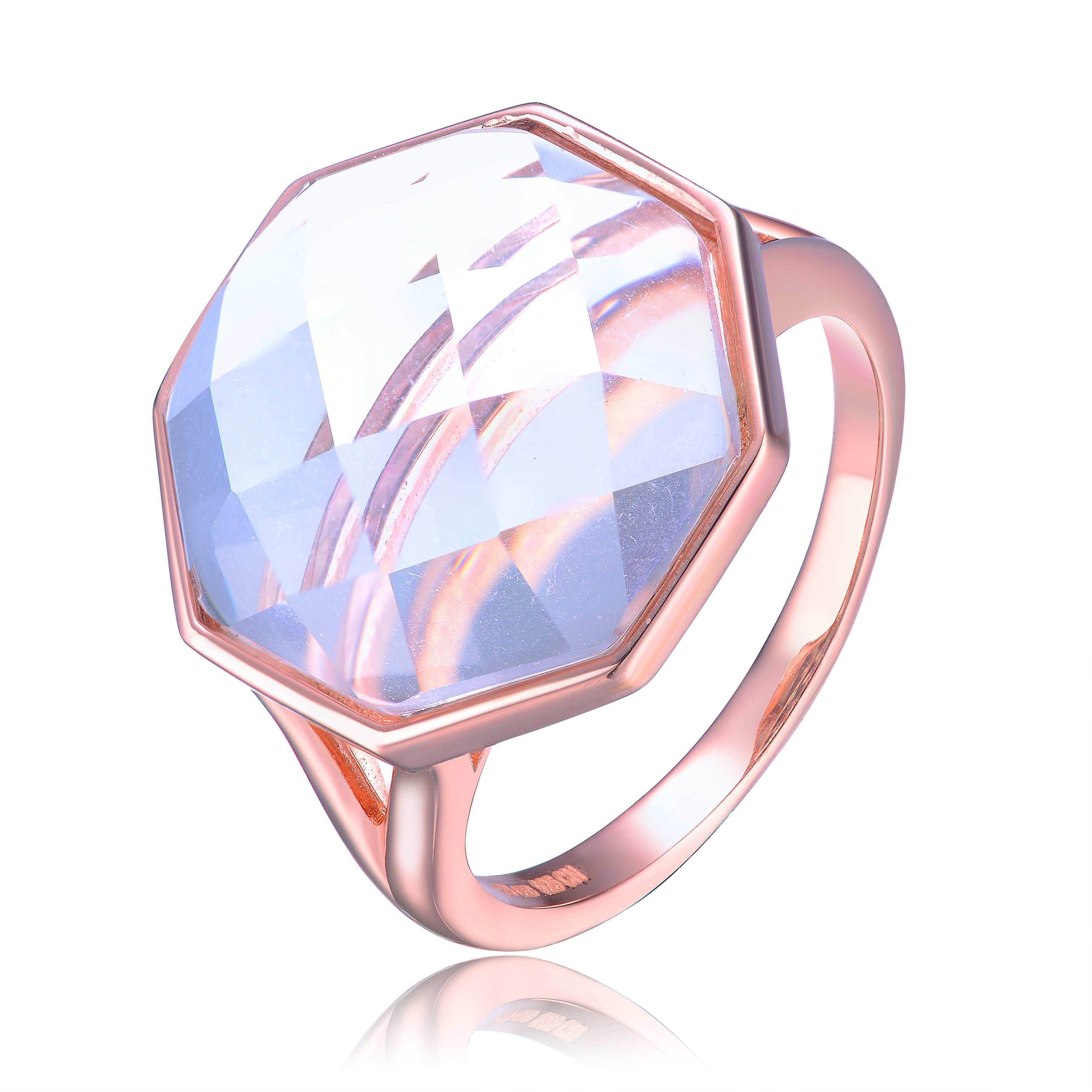 Stylish .925 Sterling silver rose gold plated white quartz cubic zirconia cocktail ring. This ring features a large octagon white quartz cubic zirconia solitaire, set in the center in bezel frame adding sophistication to your fingers. Crafted of .925 Sterling silver with rose gold plating and it is available in sizes 6, 7, 8.