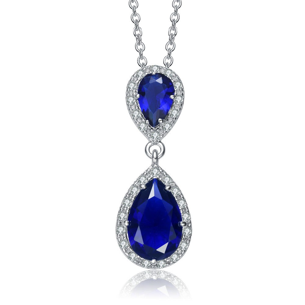 This vibrant colored pendant features two large sapphire blue pear cubic zirconia outlined with small clear round cubic zirconia. A classic design that suits any style every time. Crafted in .925 Sterling silver with rhodium plated the necklace secures with a spring ring clasp.