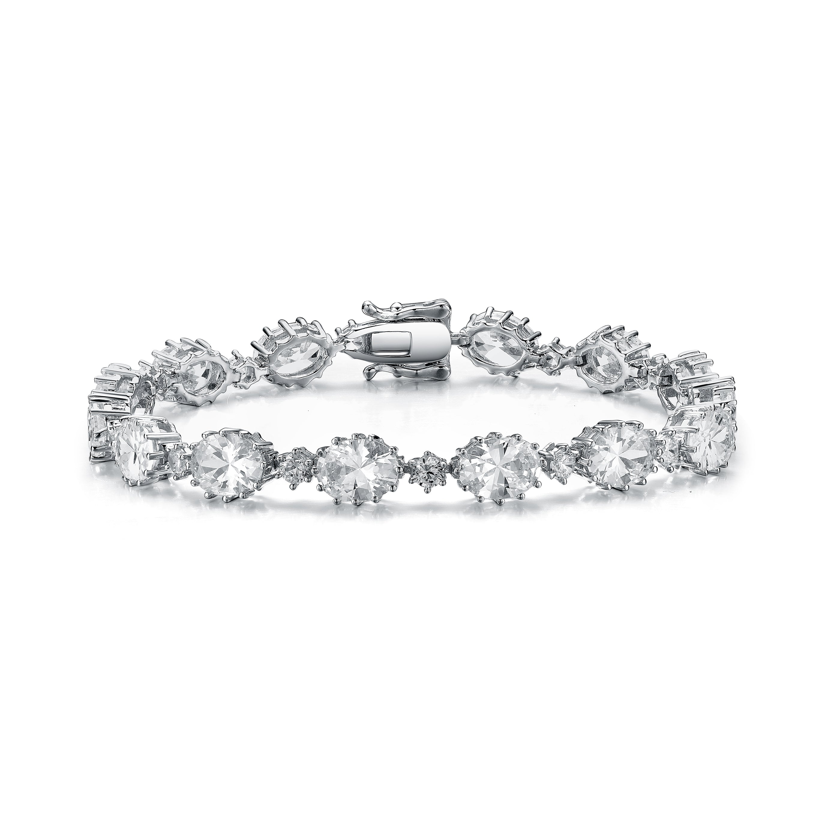 Elegant Sterling Silver Rhodium Plated Clear Cubic Zirconia Bracelet.This magnificent bracelet is decorated with clear oval Cubic Zirconia set in basket and round-cut cubic zirconia stones changing alternatly. Crafted of Sterling Silver with Rhodium Plating, this stunning bracelet secures with a box clasp. Makes a great gift as well.