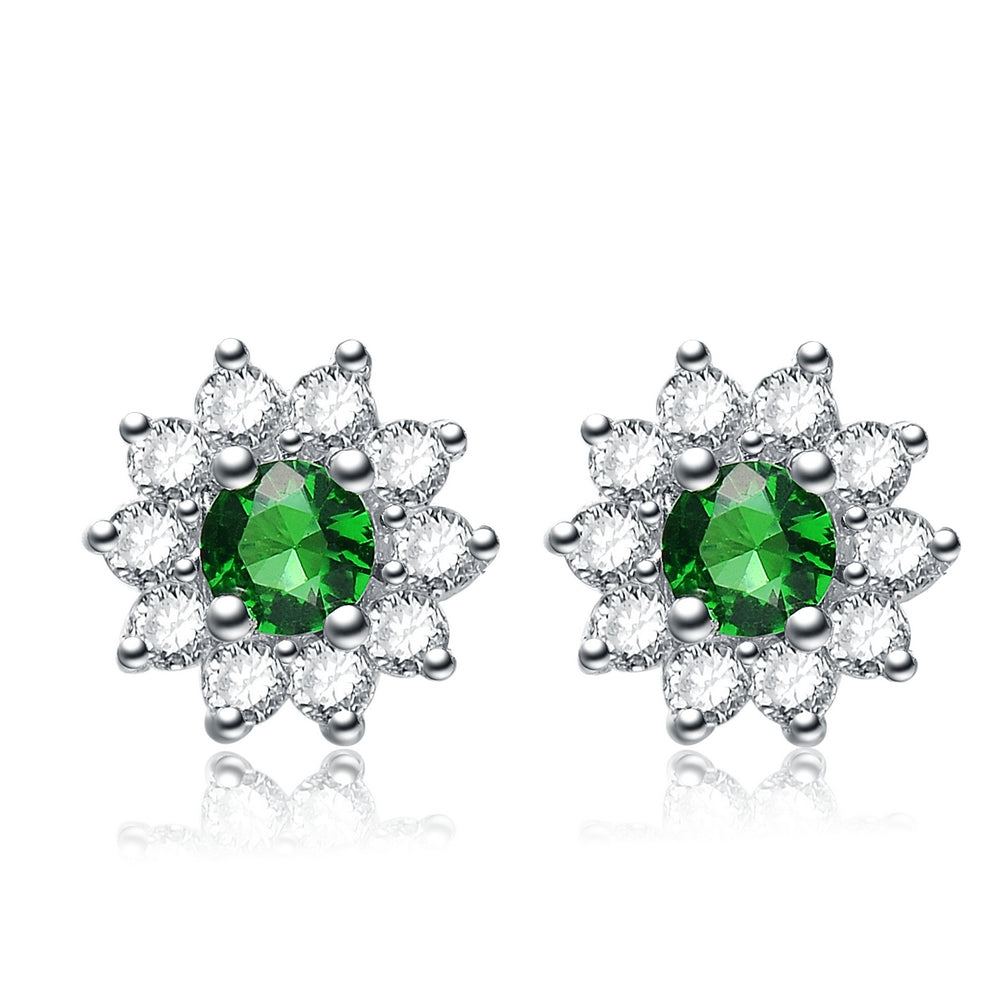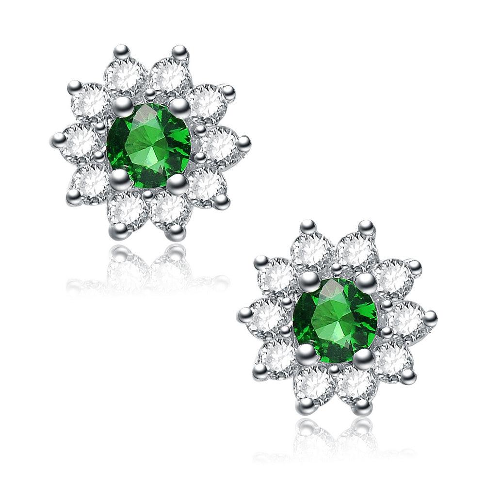 These dainty flower stud earrings showcase green round-cut cubic zirconia stones outlined with white smaller ones. Crafted of 0.925 sterling silver, the earrings secure with butterfly clasps