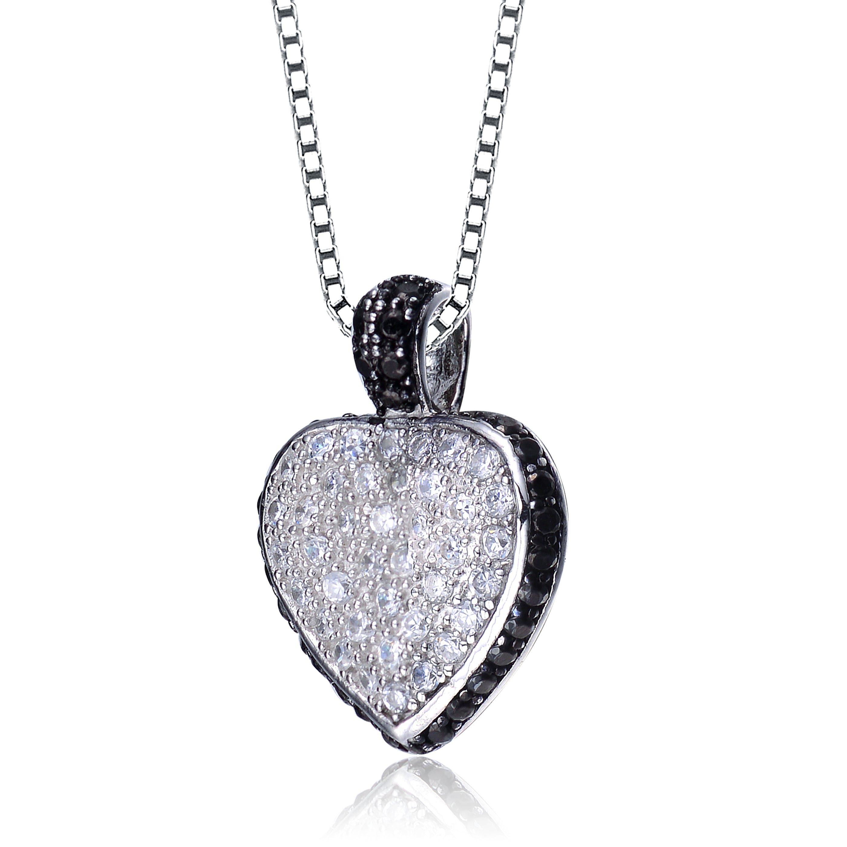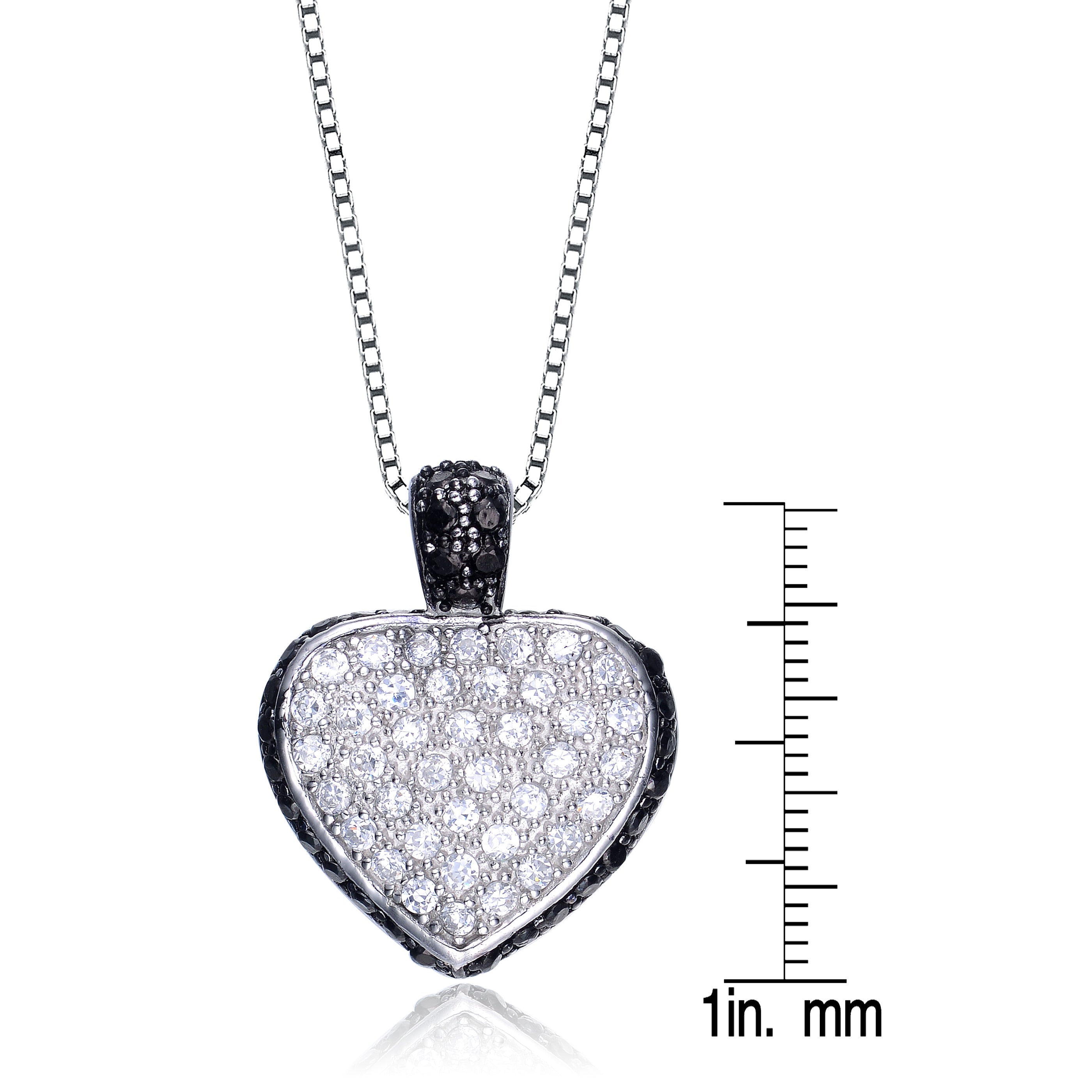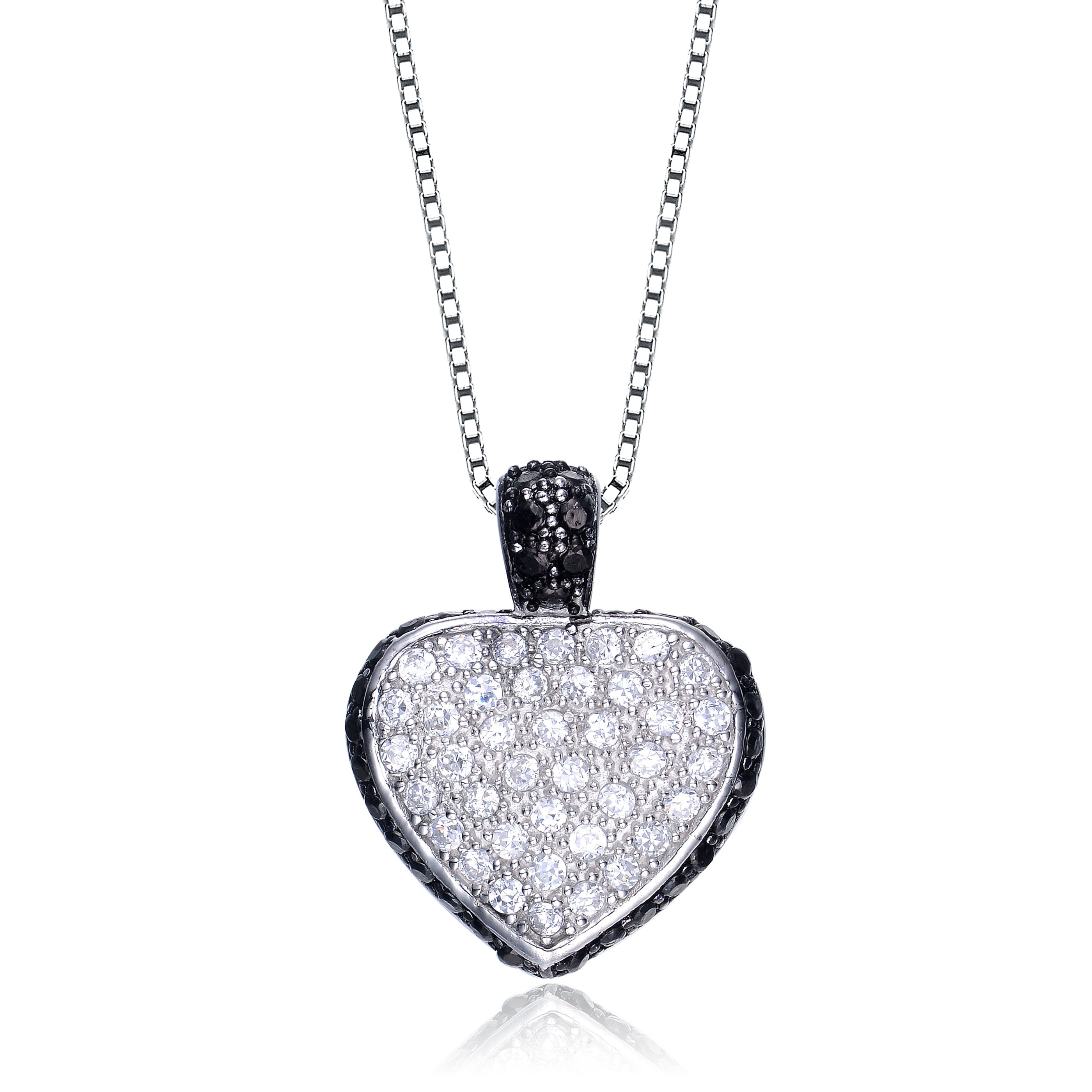 This stunning necklace showcases a heart shape set with clear cubic zirconia in the center and shimmering black cubic zirconia around the edges and bail. Crafted of .925 sterling silver with rhodium plating, the pendant dangles from a cable chain