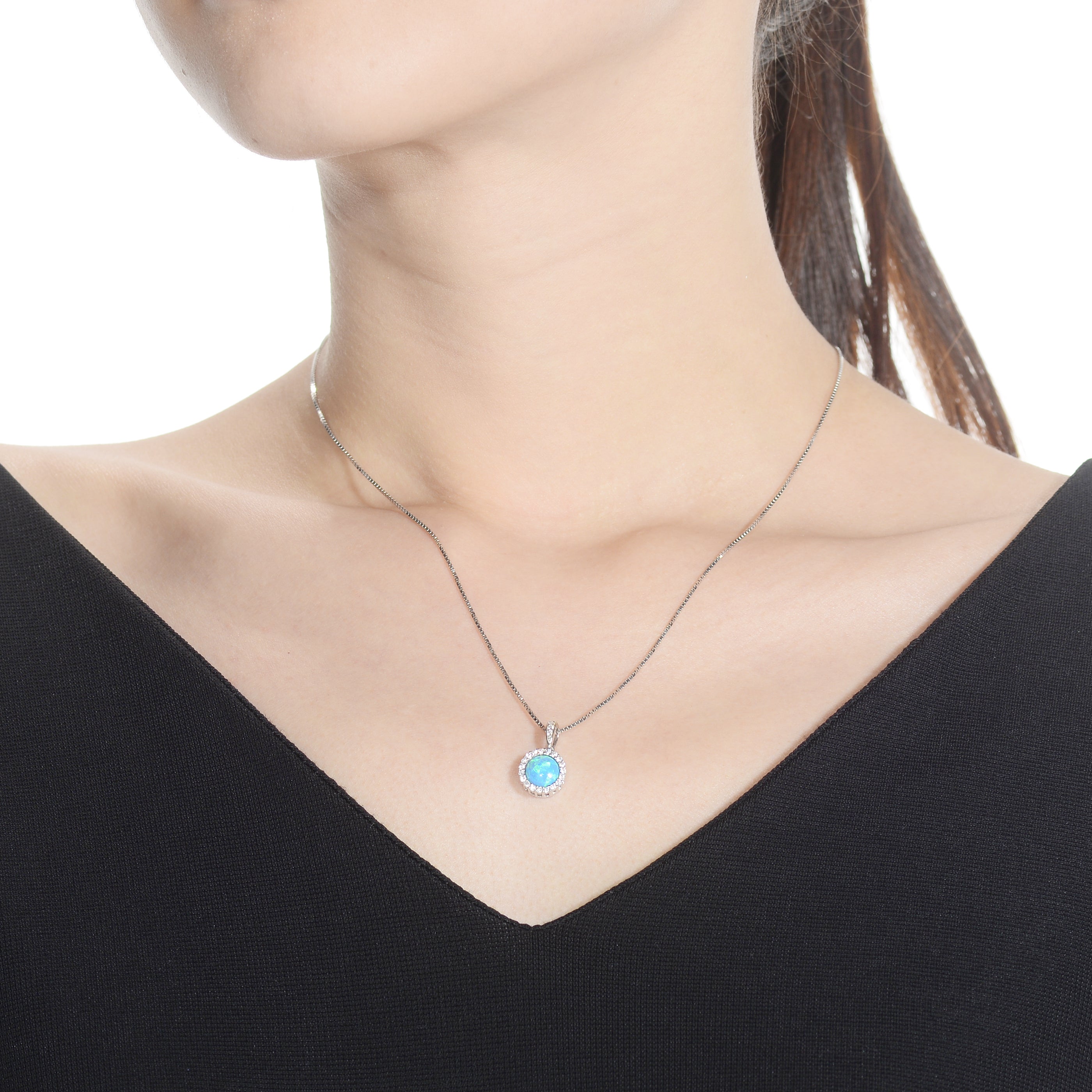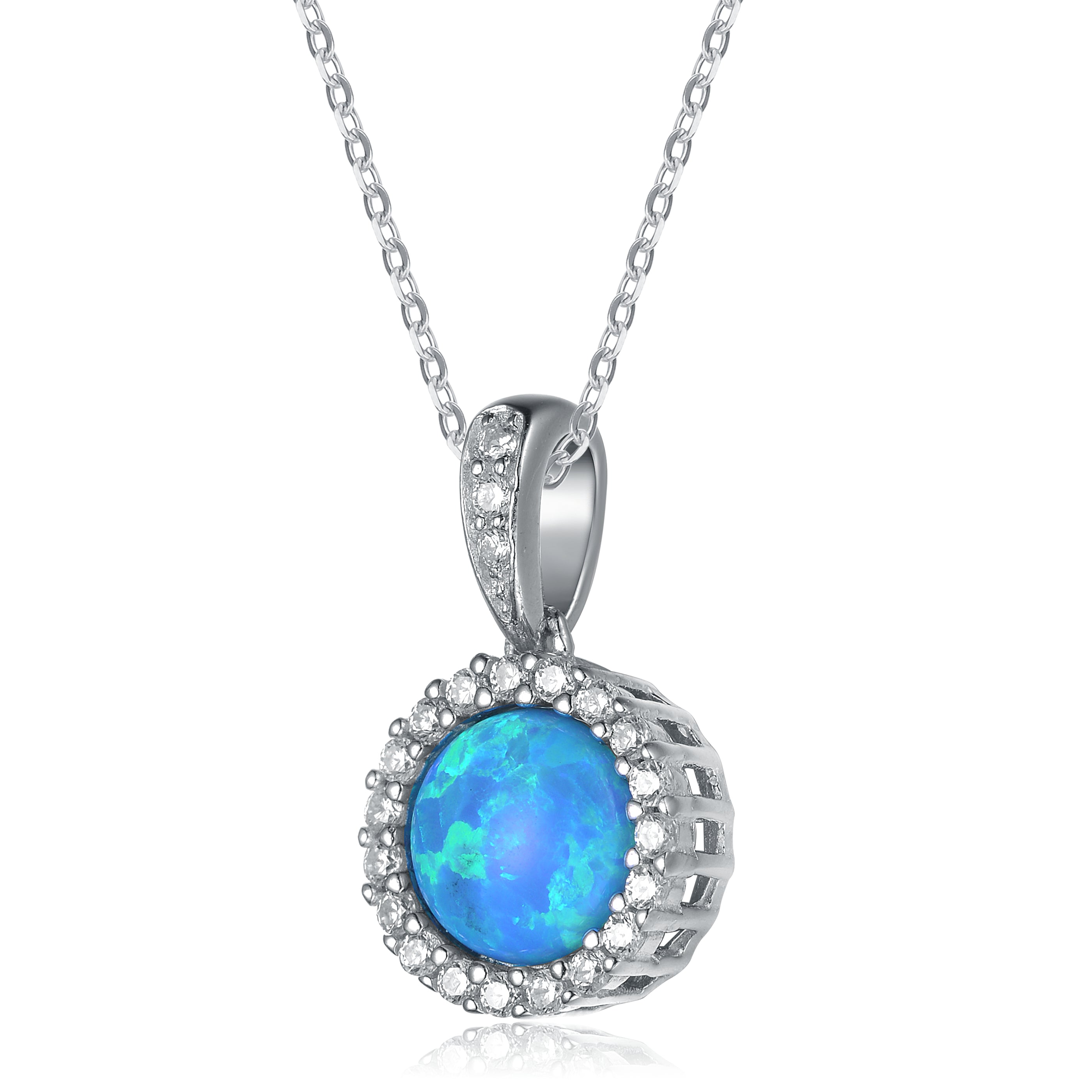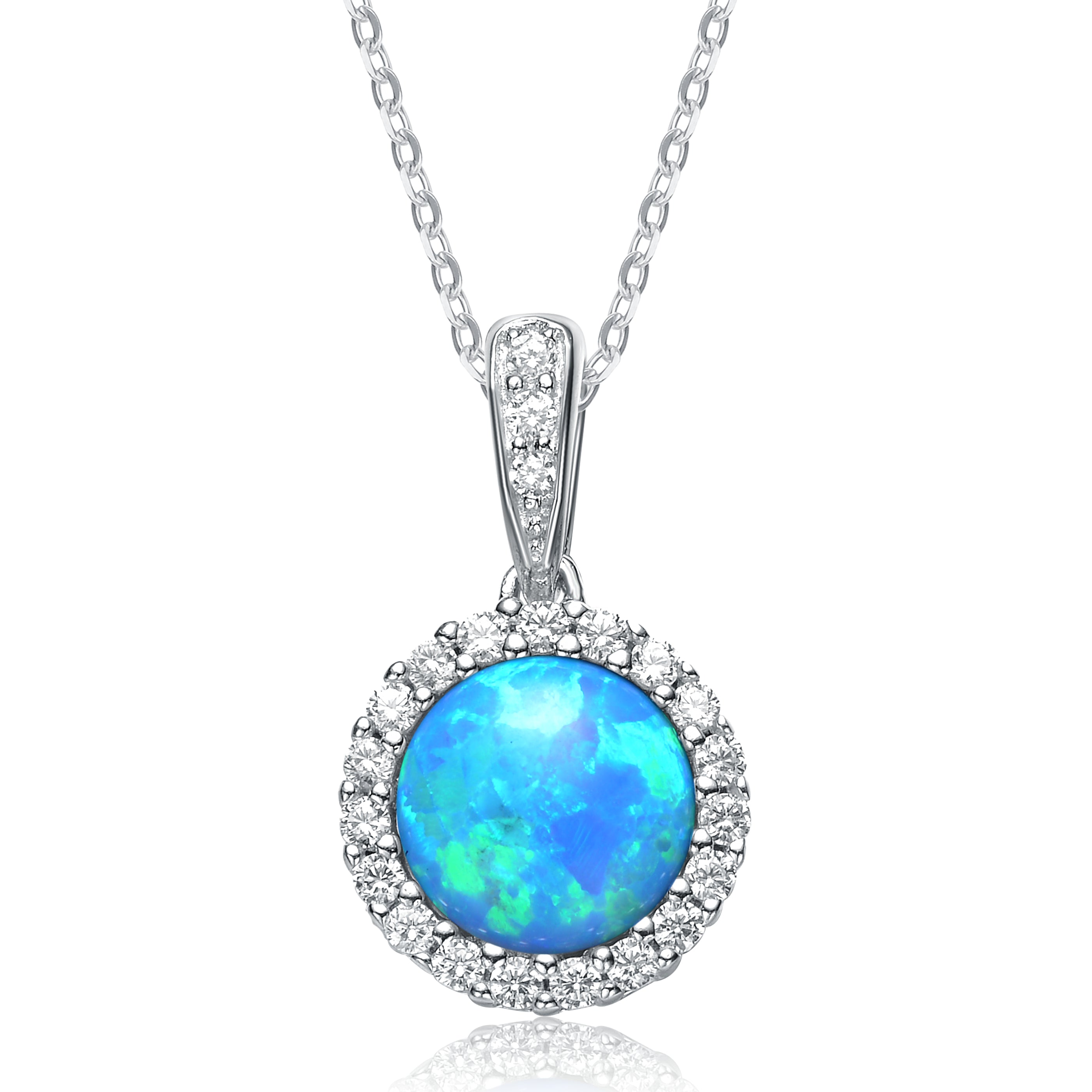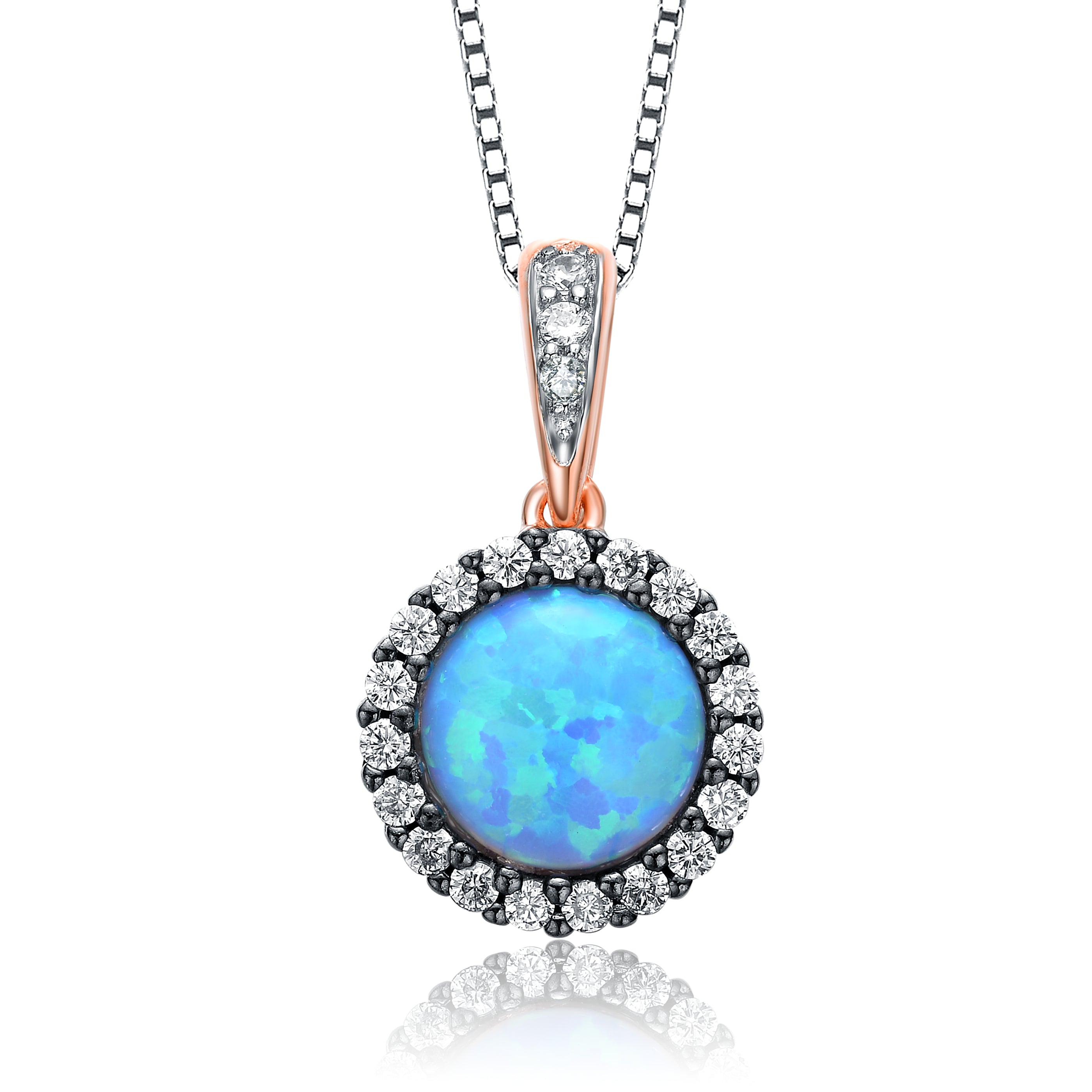 A large round cut opal cubic zirconia with accents of small round cut clear gems beautifully pronged around it. This pendant necklace is made from .925 sterling silver comes with 18 inches cable chain secured with spring ring. Available in Rose Gold and Rhodium plattings.