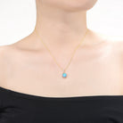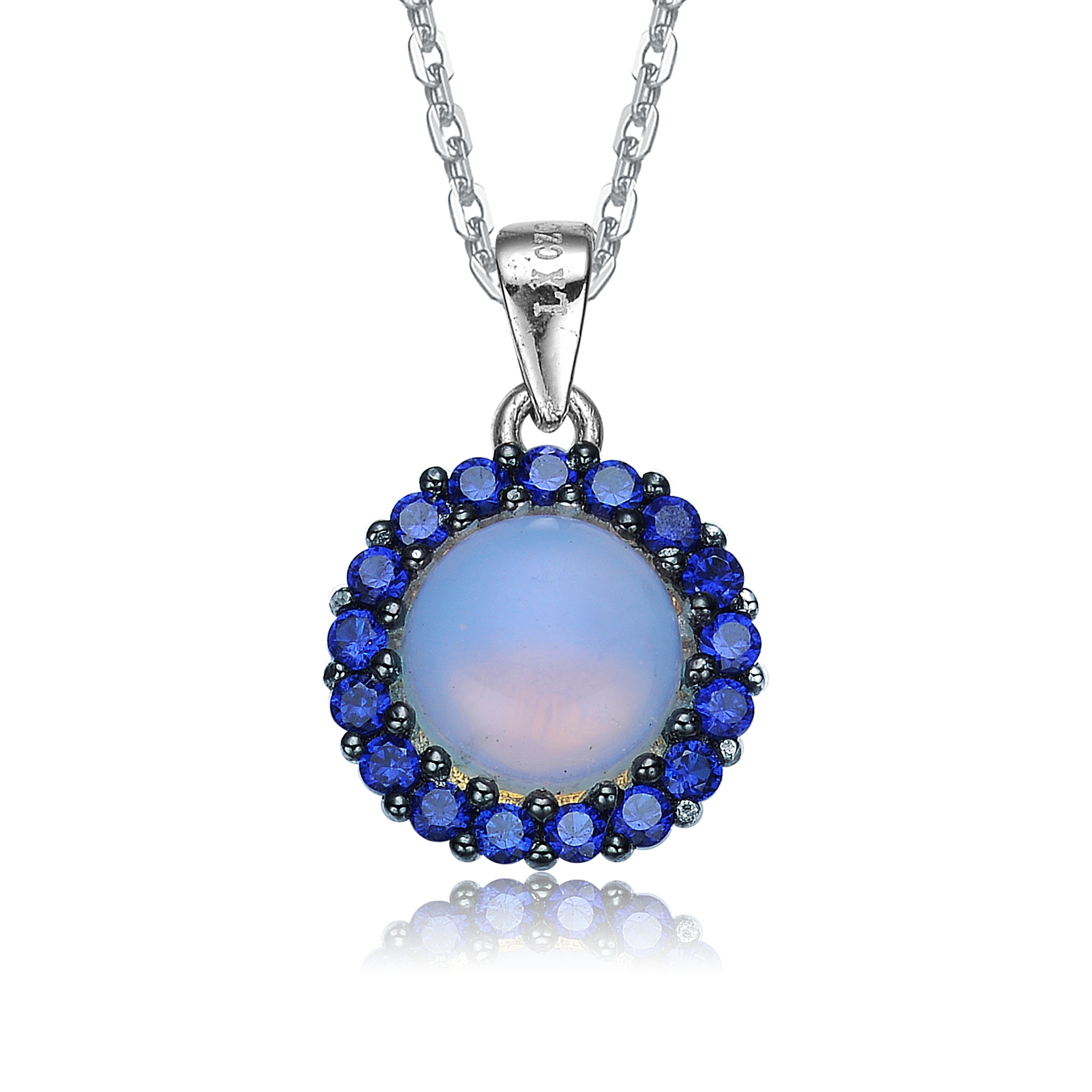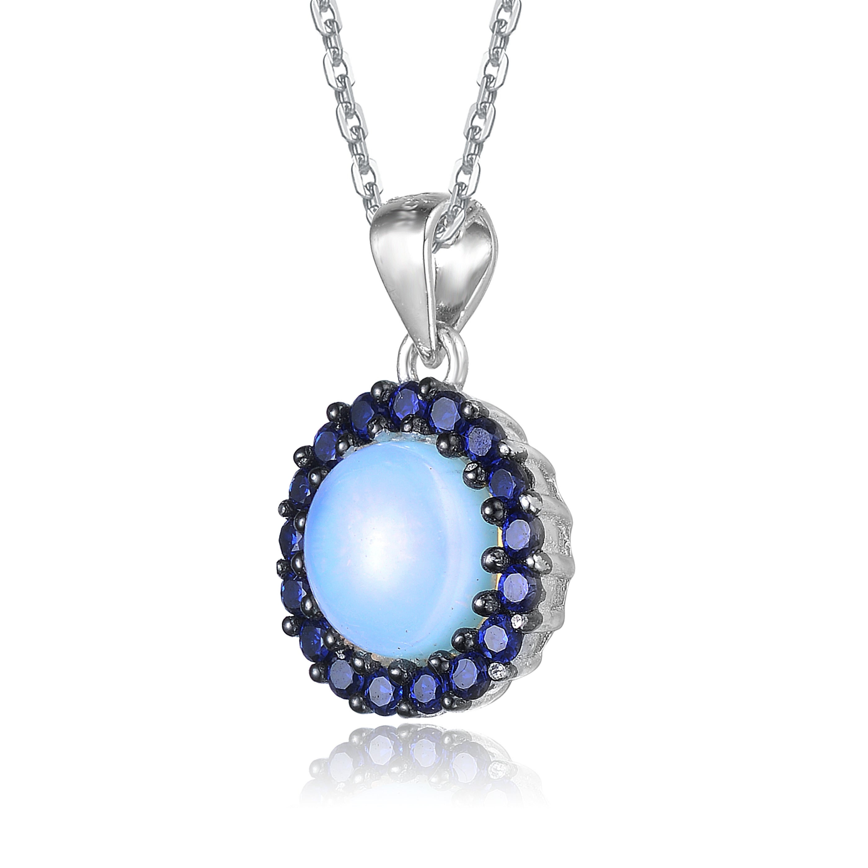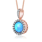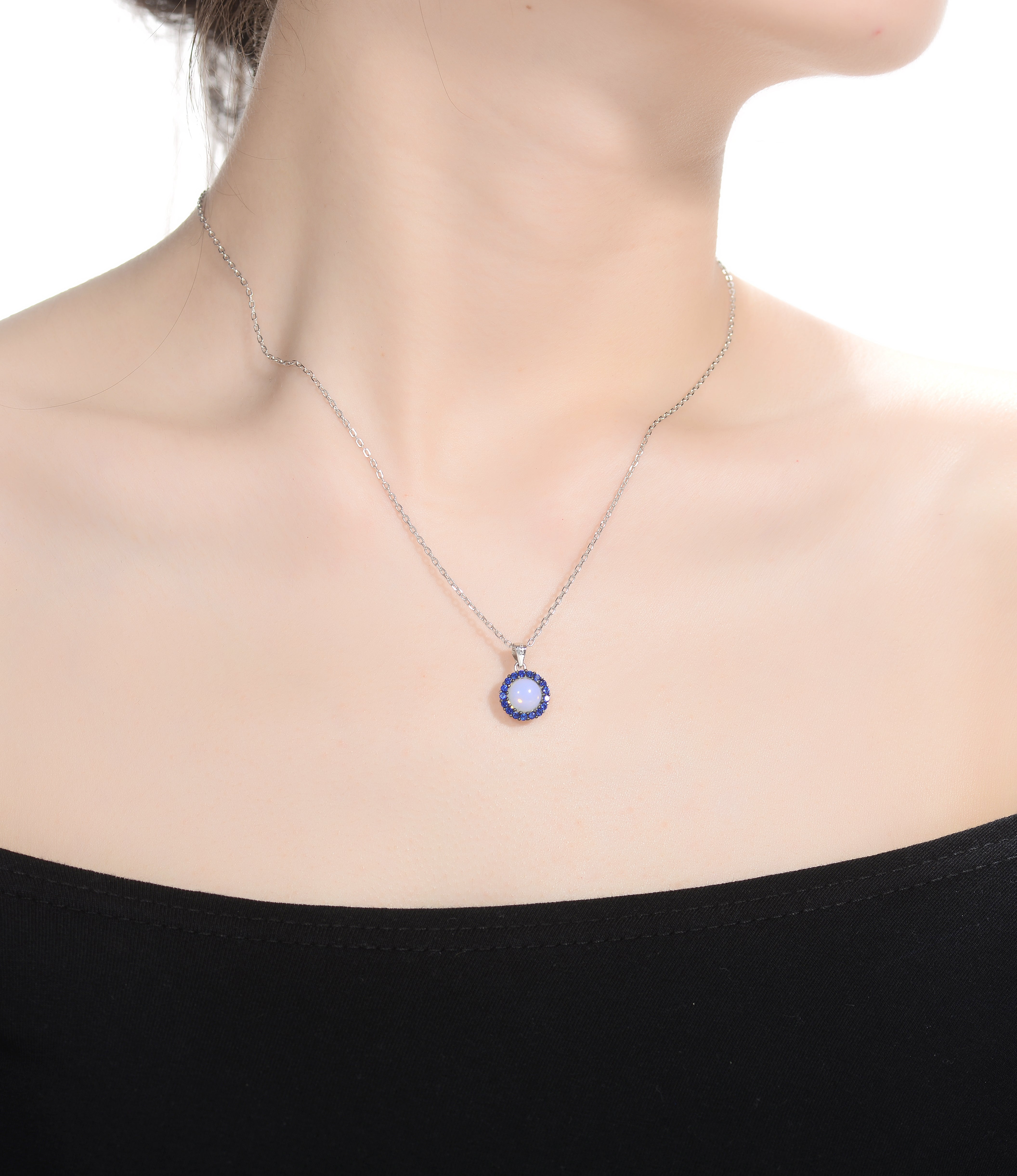 A large round cut opal cubic zirconia with accents of small round cut clear gems beautifully pronged around it. This pendant necklace is made from .925 sterling silver comes with 18 inches cable chain secured with spring ring. Available in Rose Gold and Rhodium plattings.