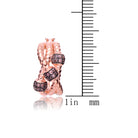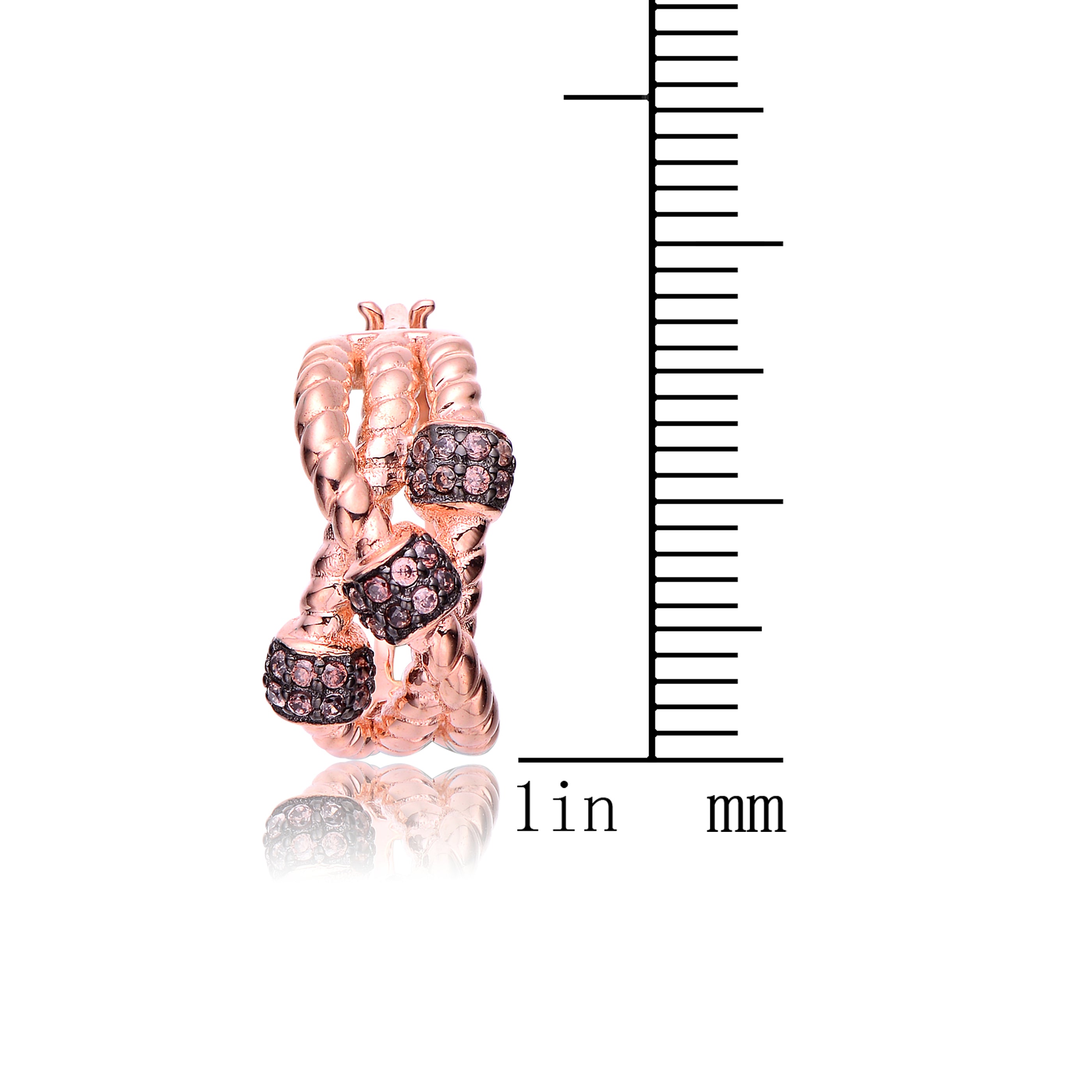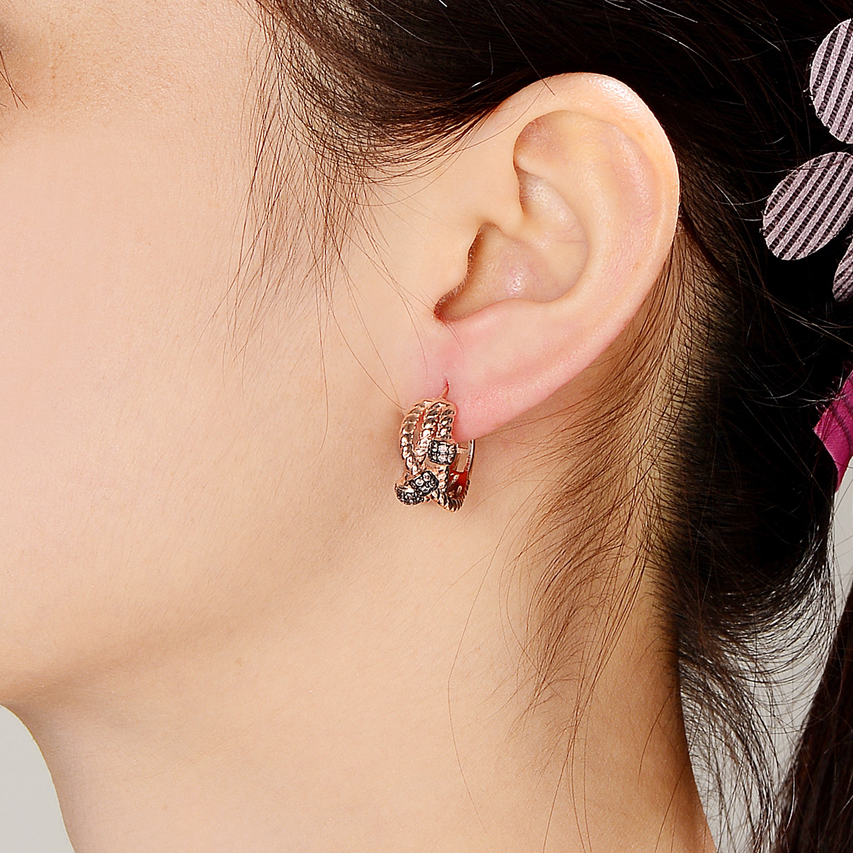 These gold overlay earrings display an elaborate pattern accented by dark cubic zirconia stones. They’re ideal for wearing to any business casual event.
