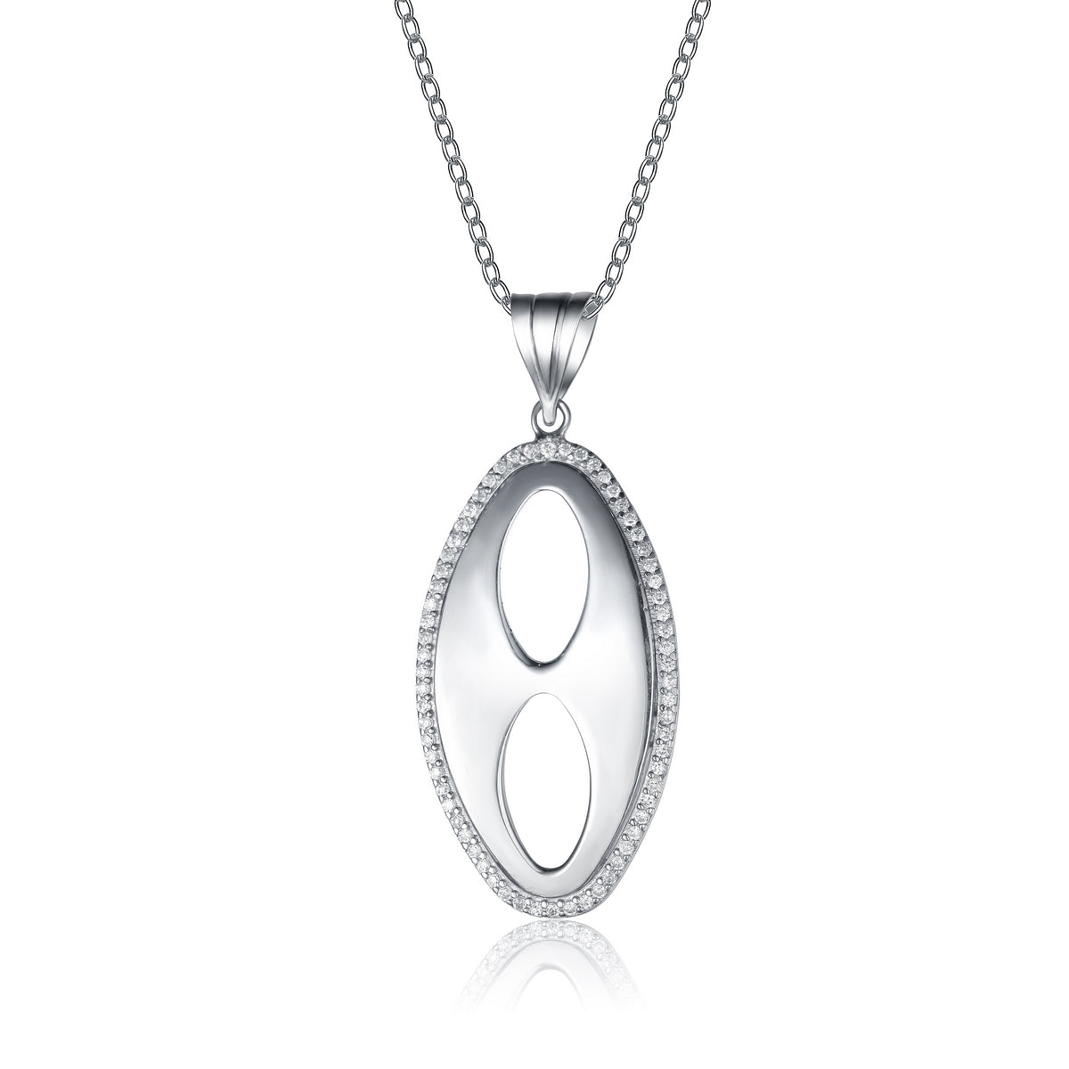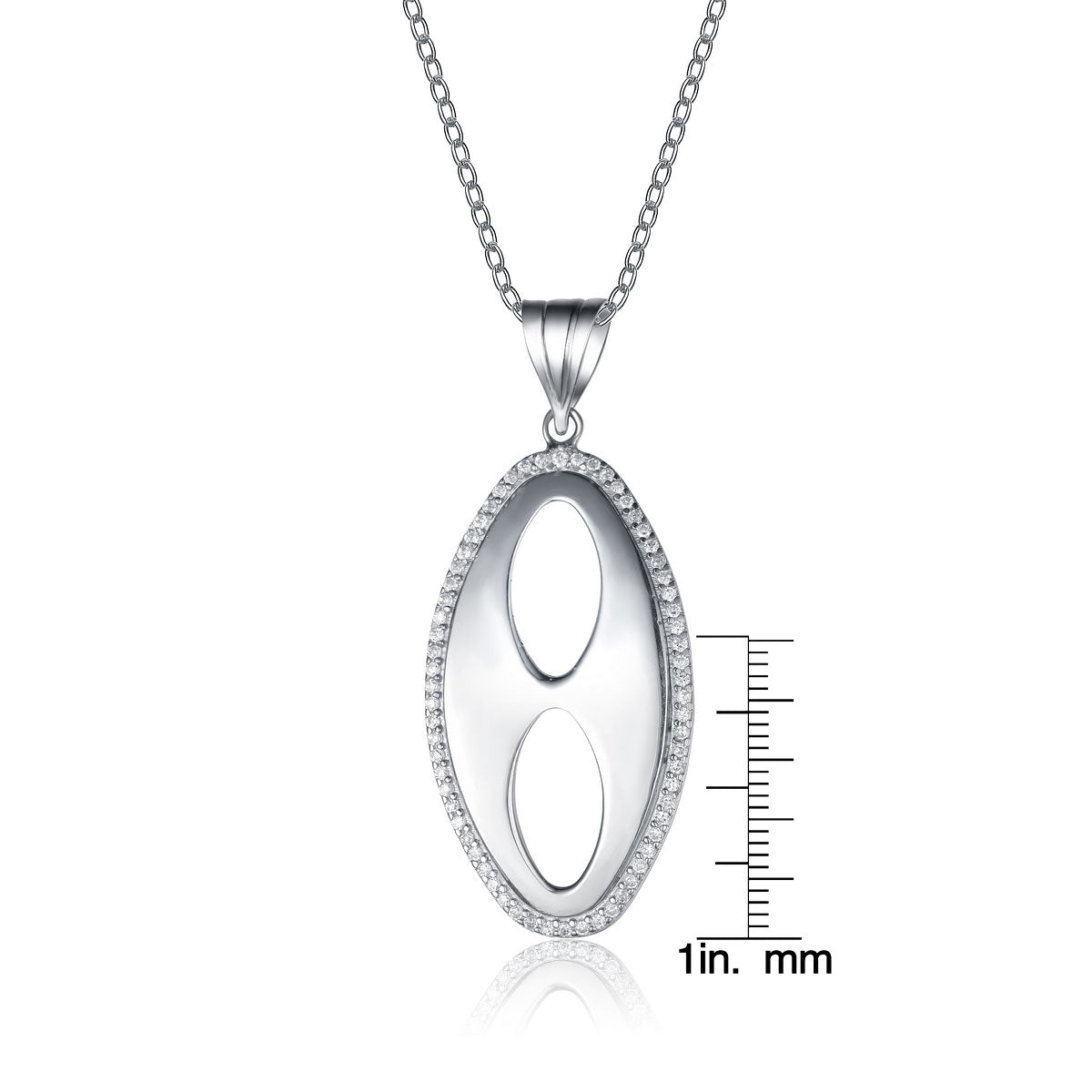 Bold yet sleek, this oval pendant features a unique design. With a satin finish and a CZ border this sterling silver piece is truly spectacular. It comes with an 18 in. chain and has a spring ring closure.