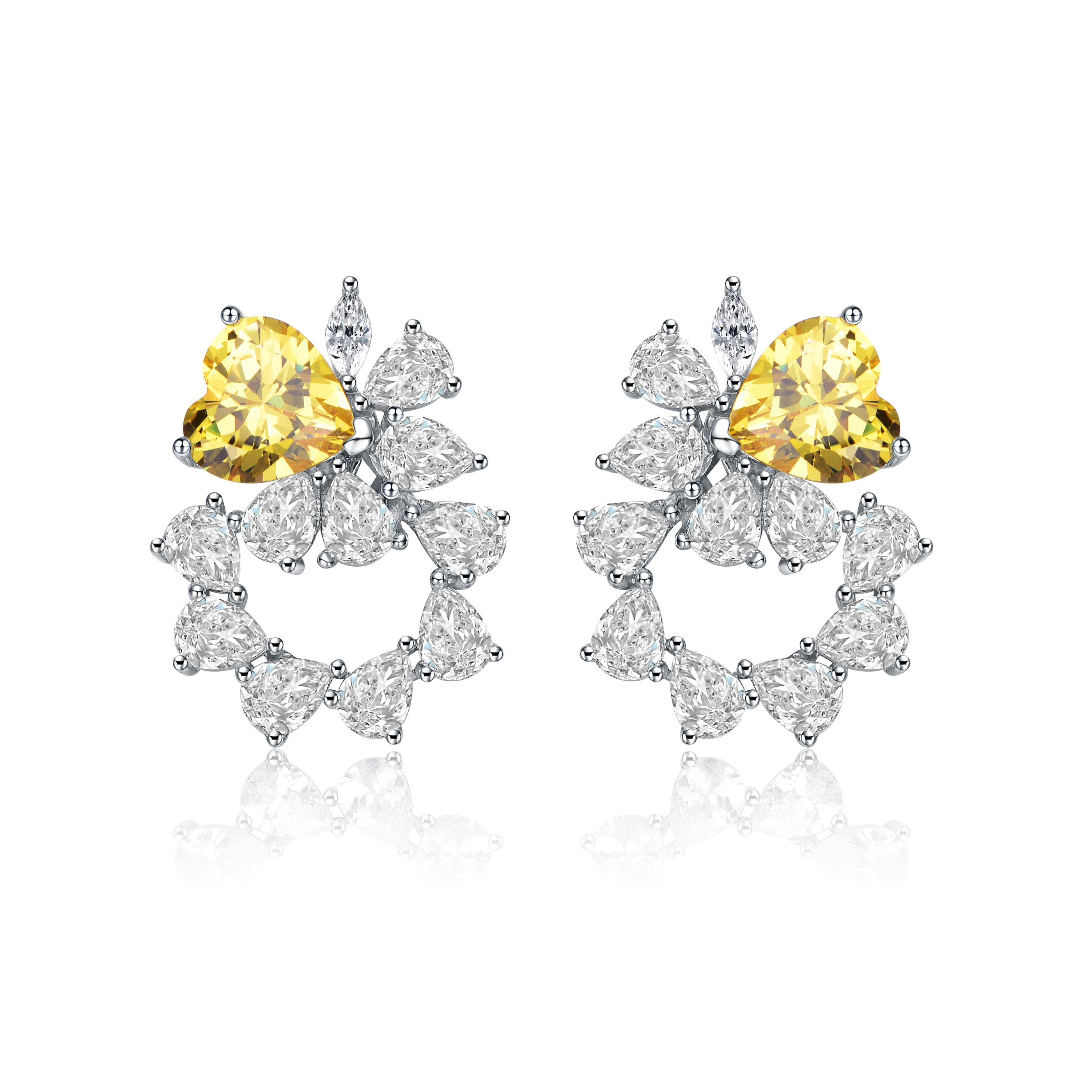 Stylish Sterling Silver Rhodium Plated Yellow Cubic Zirconia Floral Stud Earrings. This elegant pair of earrings features interesting floral design made out of silver frame, and small clear round and pear cubic zirconia stones set in prong setting are set and accented with yellow heart shaped cubic zirconia stone. Crafted of Sterling Silver with Rhodium Plating and it is secured with butterfly closure. Perfect piece of jewelry for stylish combinations. This item also makes a sensational gift.