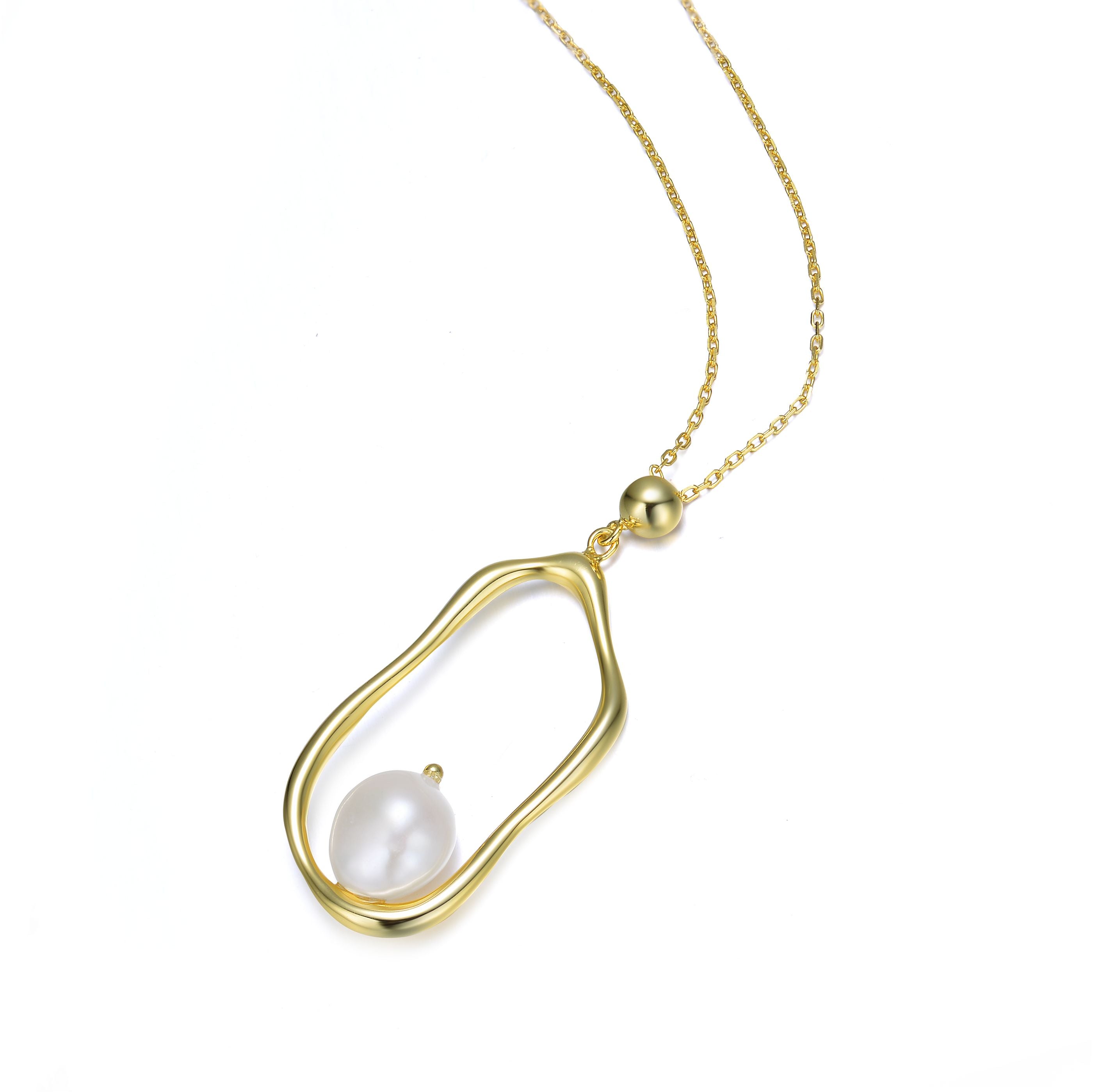 Elegant Sterling Silver with Gold Plating and Freshwater Pearl Halo Necklace. This beautiful necklace boasts of a curvy oval gold plated metal halo pendant that has a piece of Freshwater pearl that sit at the core center arc area of it. Crafted in .925 Sterling Silver, the jewelry is secured with a spring clasp. This jewelry is perfect for a formal event. It is also a great present for a special ocassion.