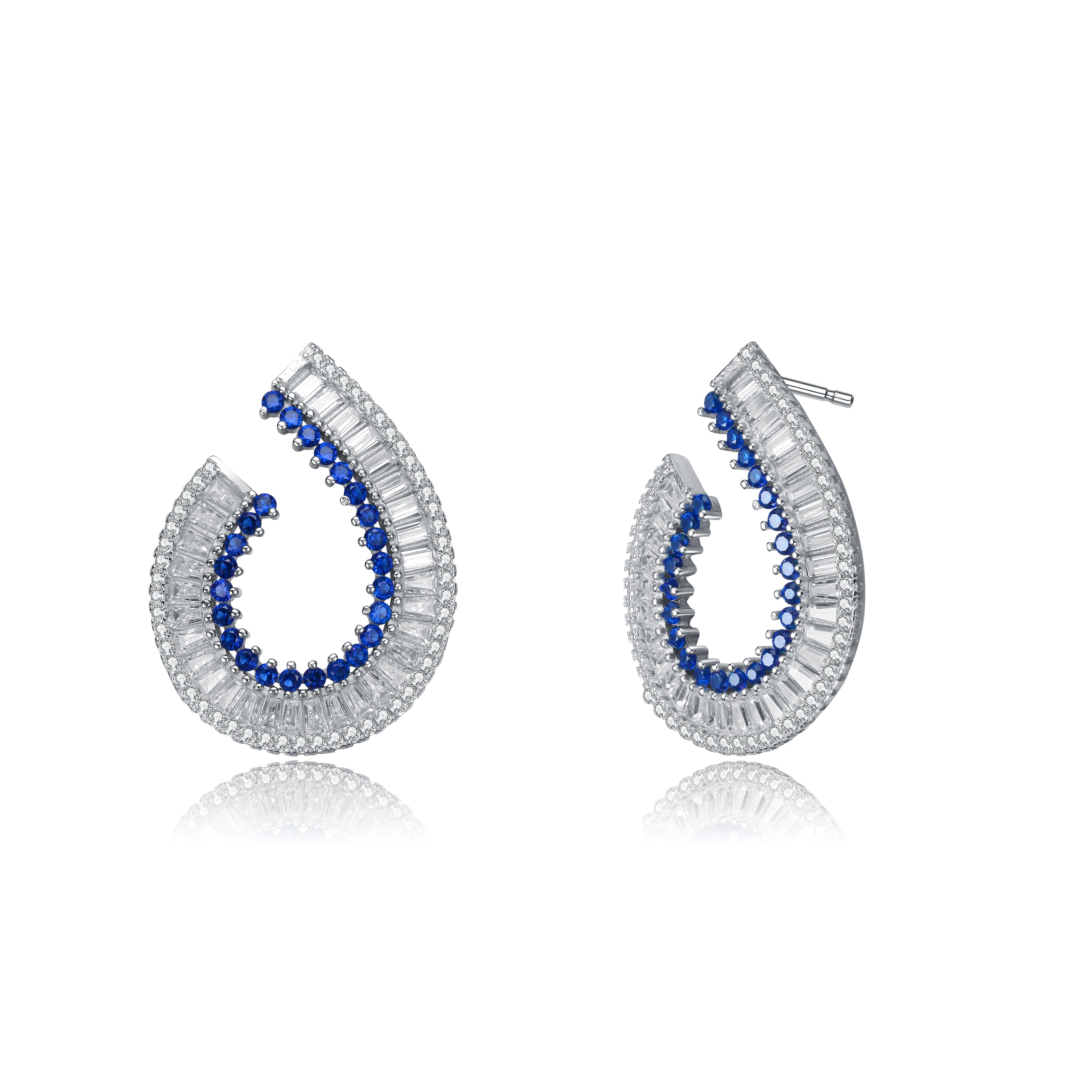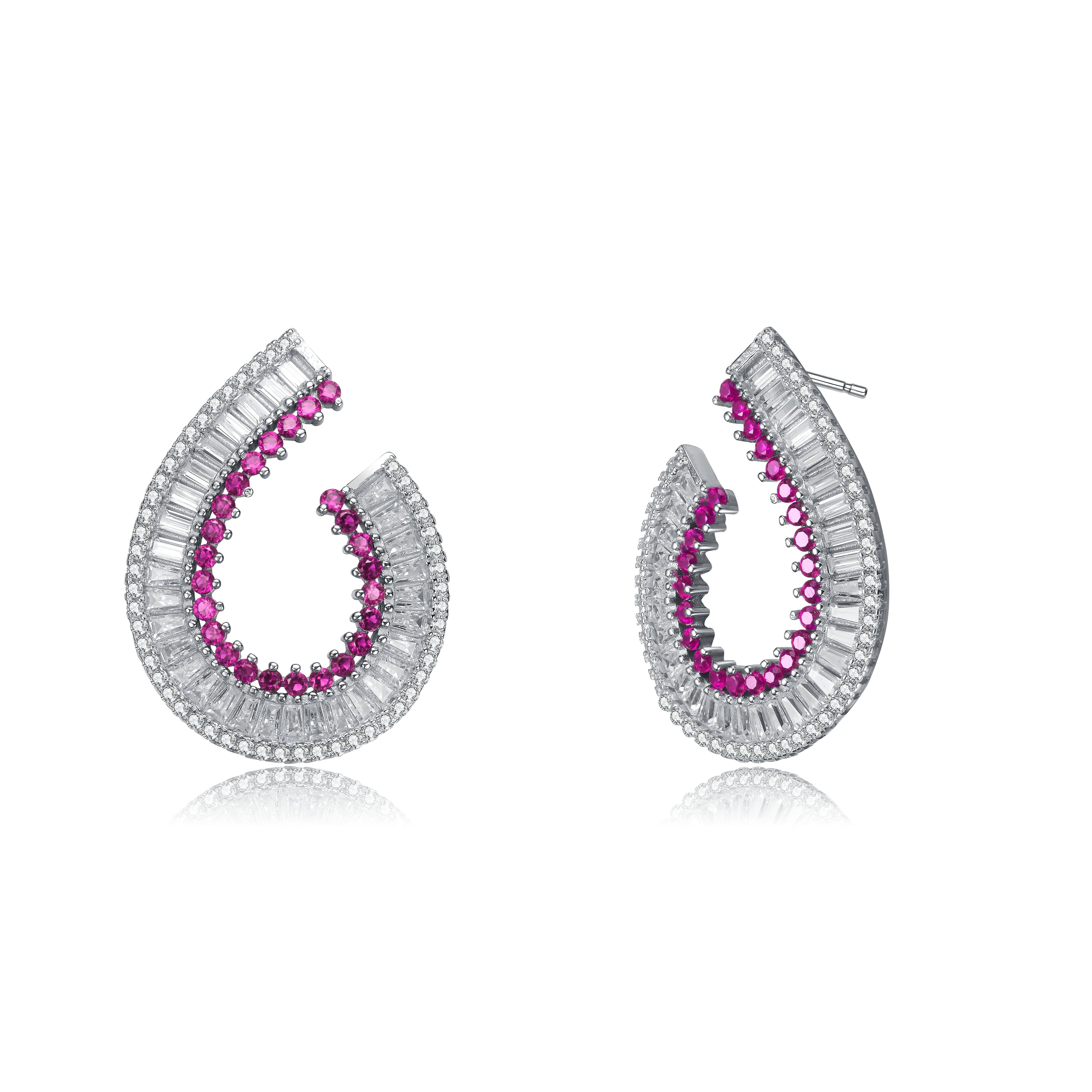 These exquisite earrings feature a teardrop design, meticulously crafted from sterling silver. The outer edge is adorned with a row of sparkling clear cubic zirconia stones that beautifully frame the inner curve, which is lined with radiant ruby-colored cubic zirconia gems. The contrast between the vivid ruby hue and the dazzling white of the cubic zirconia creates an eye-catching piece of jewelry that exudes elegance and sophistication. Perfect for adding a touch of glamour to any outfit, these earrings are sure to make a statement. Ideal for both special occasions and everyday elegance, they are a must-have addition to any jewelry collection.