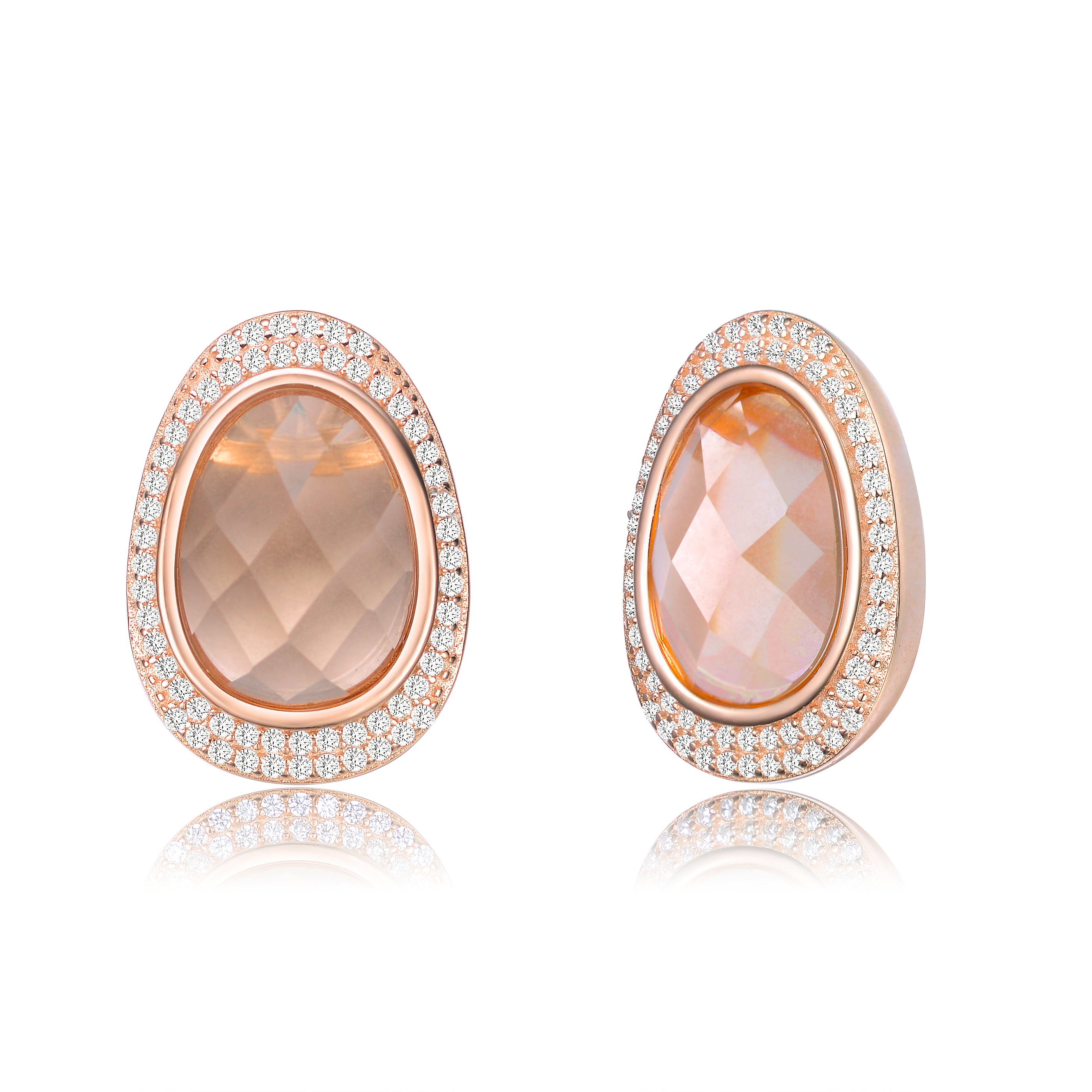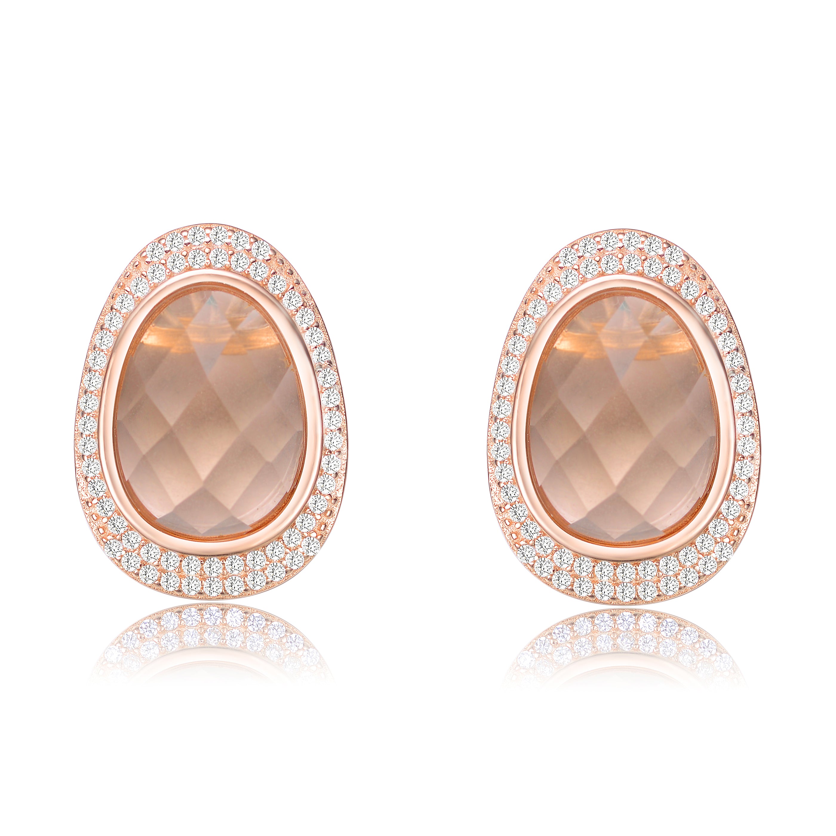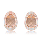 Oval shaped accented stud earring with light peach cubic zirconia center piece and white cubic zirconia on a rose gold plated .925 sterling silver, a simple yet elegant earring that will surely make you feel special and influential.