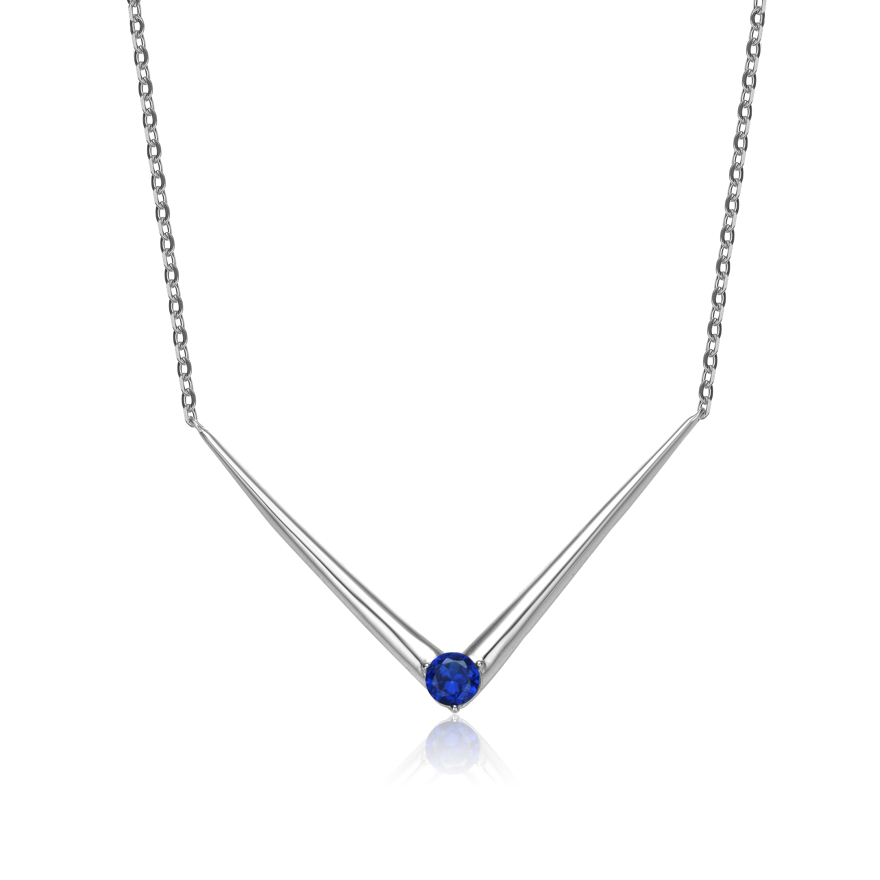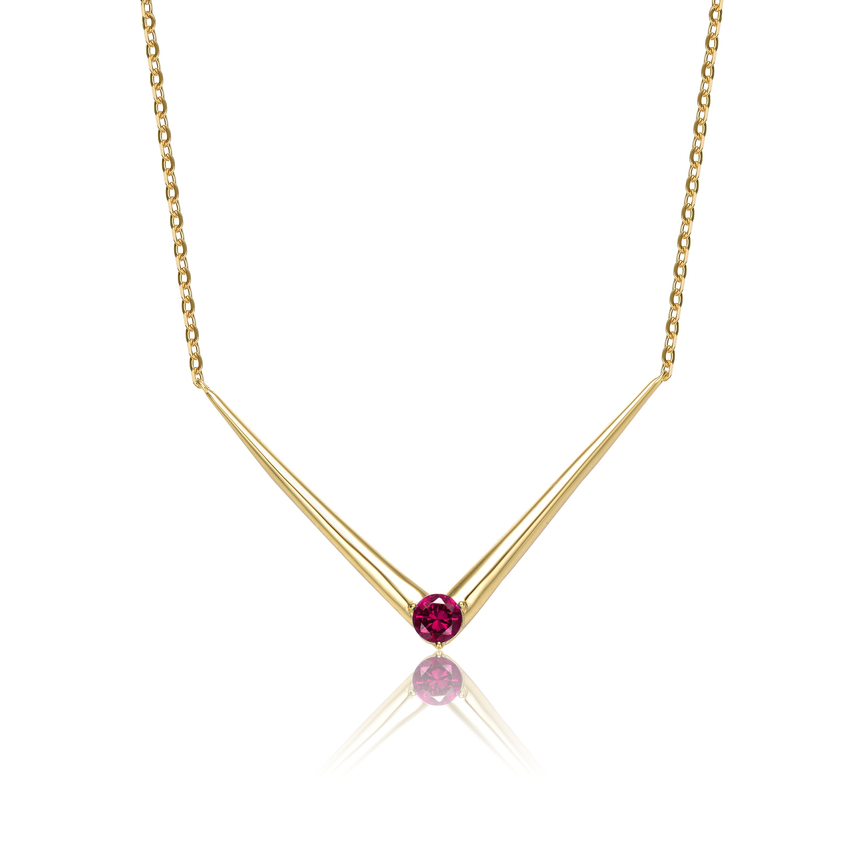 This 14k yellow gold plated sterling silver necklace features a sparkling round brilliant cut cubic zirconia prong set on the center of a chevron pendant. The pendant is connected to a cable chain, finished with a lobster clasp. Give this versatile layering necklace as a gift to any loved one. Available in different stone color options.