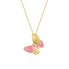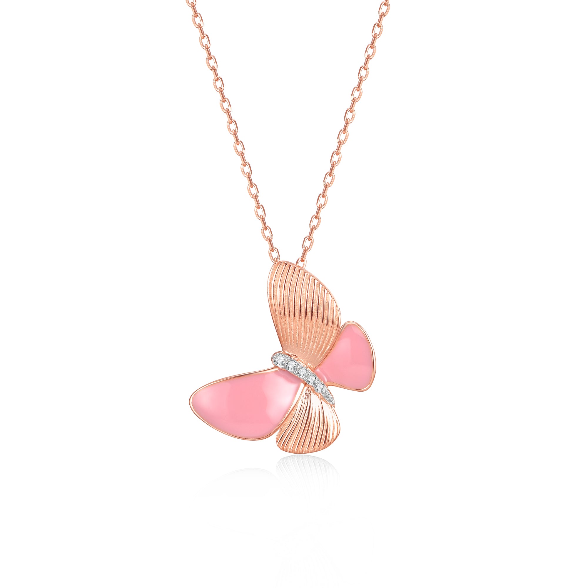Add this sweet 14k gold plated sterling silver necklace to your Children's bespoke collection of keepsakes. Sparkling round brilliant cut cubic zirconias set in the center of the butterfly complemented the shiny pink enamel wings. A delicate chain with a secure lobster clasp finishes this enchanting design.