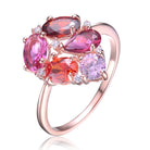 Elegant Sterling Silver with Rose Gold Plated Cubic Zirconia Coctail Ring. The ring features interesting pear shaped design accented by large oval and pear shaped ruby, pink and orange cubic zirconia stones in the center and small round cubic zirconia stones. Crafted of Sterling Silver with Rose Gold plating and it is available in sizes 6,7,8. Makes a great gift as well.
