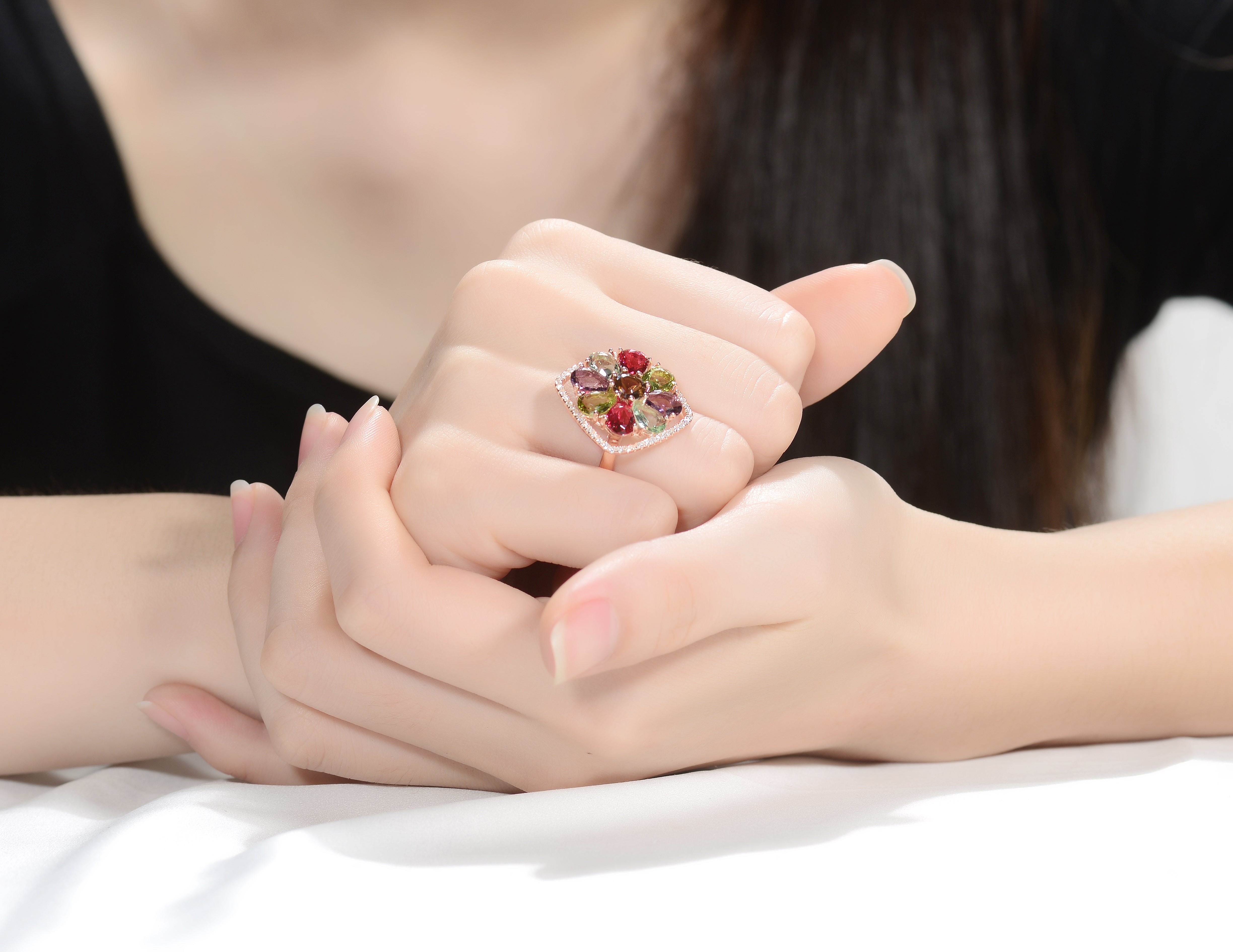 Colorful Cubic Zirconia in a flower form makes this ring adorable and eye catching. This ring features several pear Cubic Zirconia in various colors that surround a single brown round Cubic Zirconia in the center to form a flower piece. The flower shape is also haloed with clear round Cubic Zirconia giving it an added sparkle. This ring is set in Sterling silver with Rose Gold plated and has a size 6,7,8 band.