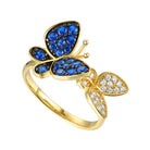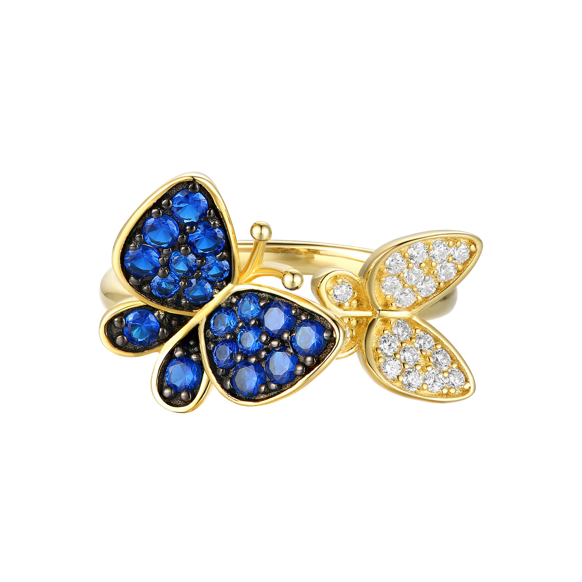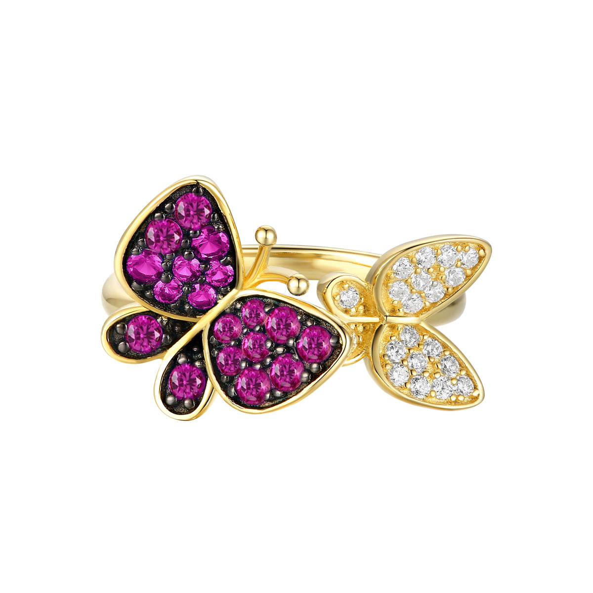 Add a playful touch of elegance to your jewelry collection with this charming butterfly stacking ring. Two delicately crafted butterflies are adorned with sparkling round brilliant cut cubic zirconia stones in a refined French pavé setting, creating a radiant and whimsical look. Designed with a slim, comfortable band, this ring is crafted from .925 sterling silver with 14K yellow gold plating for lasting shine and style.