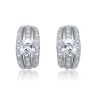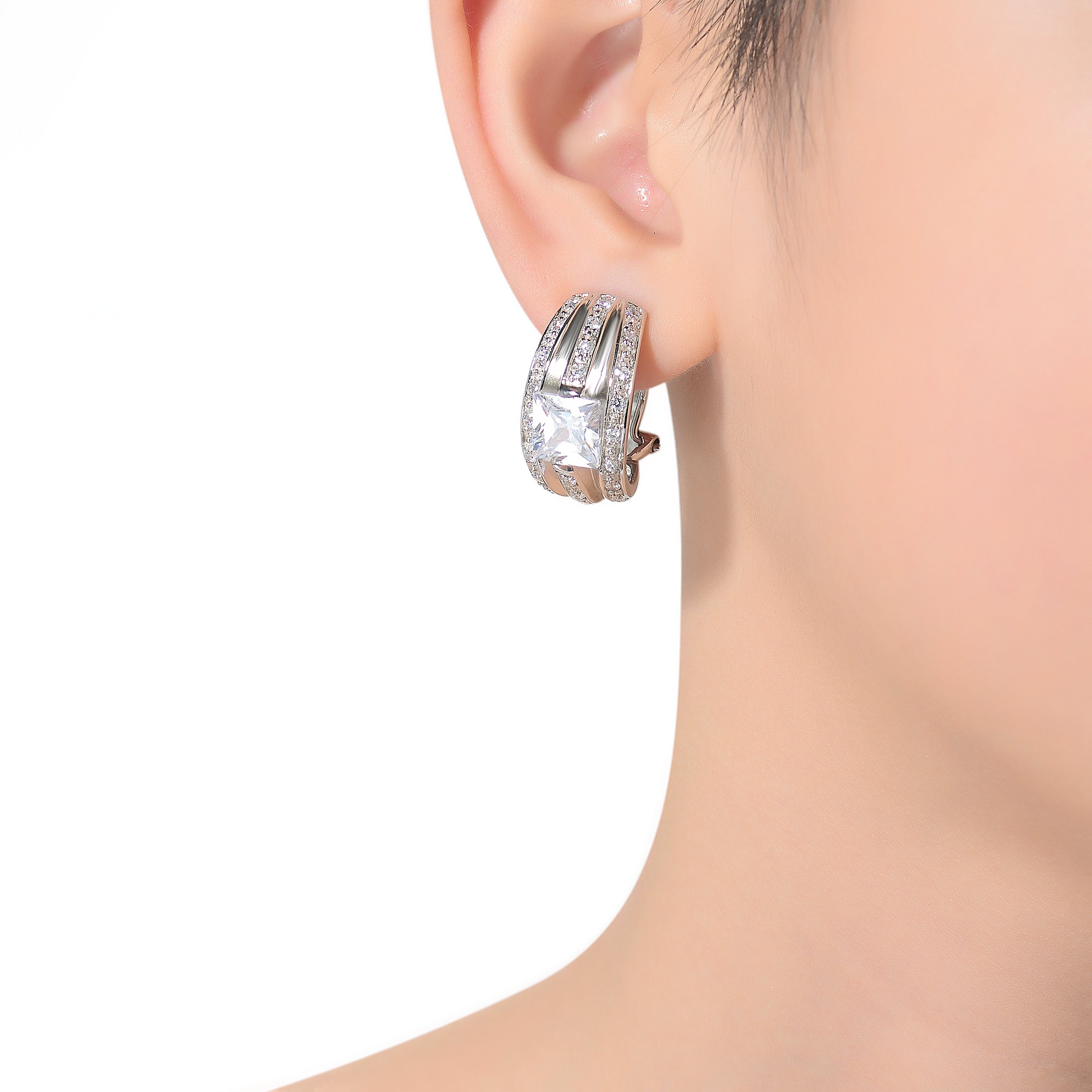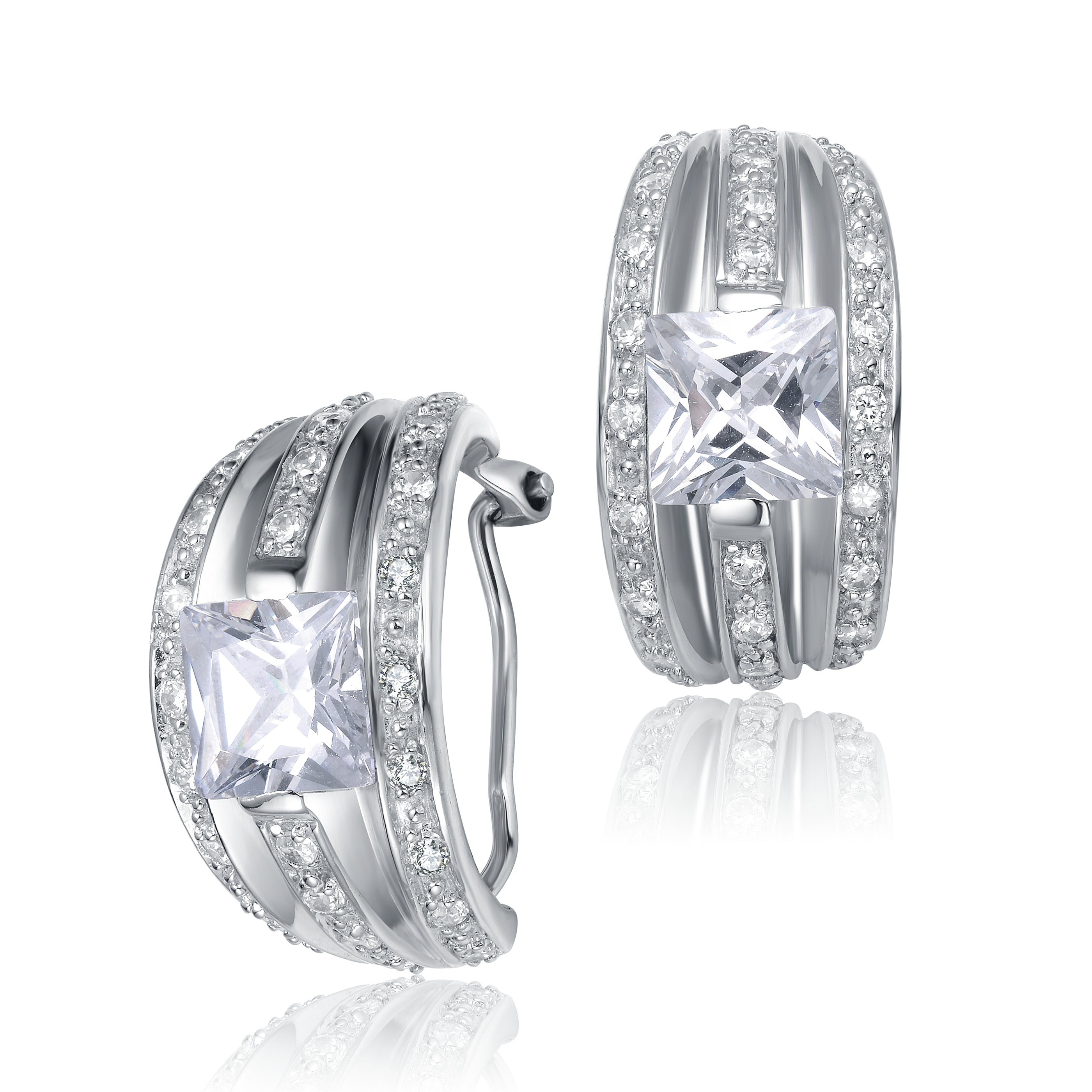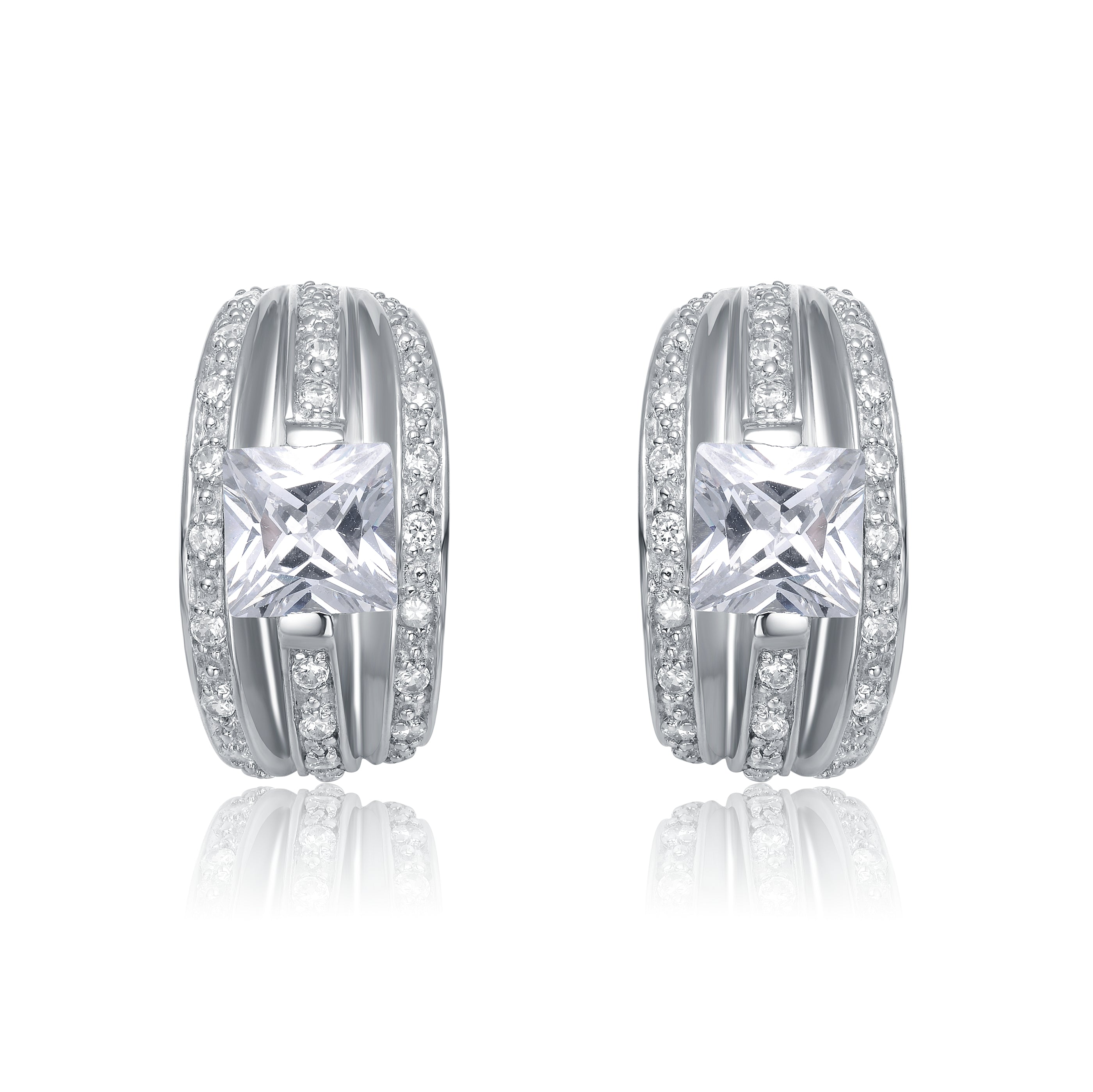 These exquisite hoop earrings feature a rhodium-plated sterling silver construction, providing a durable and tarnish-resistant finish. The design showcases a prominent princess-cut cubic zirconia centerpiece, flanked by rows of smaller, pavé-set cubic zirconia that enhance the sparkle and allure. The hinged snap closure ensures secure wear. Perfect for adding a touch of sophistication to any outfit, these earrings are an ideal choice for those who appreciate the beauty of fine jewelry without the high cost of diamonds.