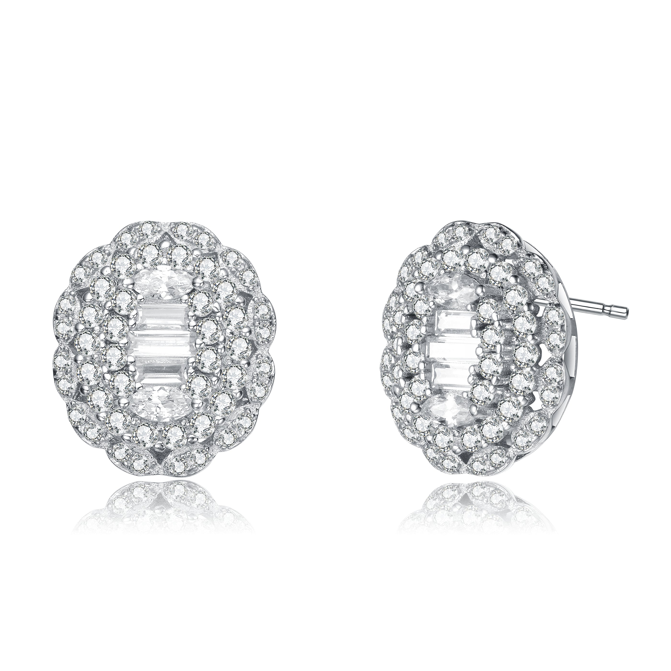 These exquisite stud earrings feature a rhodium-plated sterling silver construction, providing a durable and tarnish-resistant finish. The design showcases a central rectangular cubic zirconia, flanked by smaller round cubic zirconias that create a sparkling halo effect. The brilliance of the stones offers a luxurious look, making these earrings an ideal accessory for both formal occasions and everyday elegance. Add a touch of sophistication to your jewelry collection with these stunning earrings.