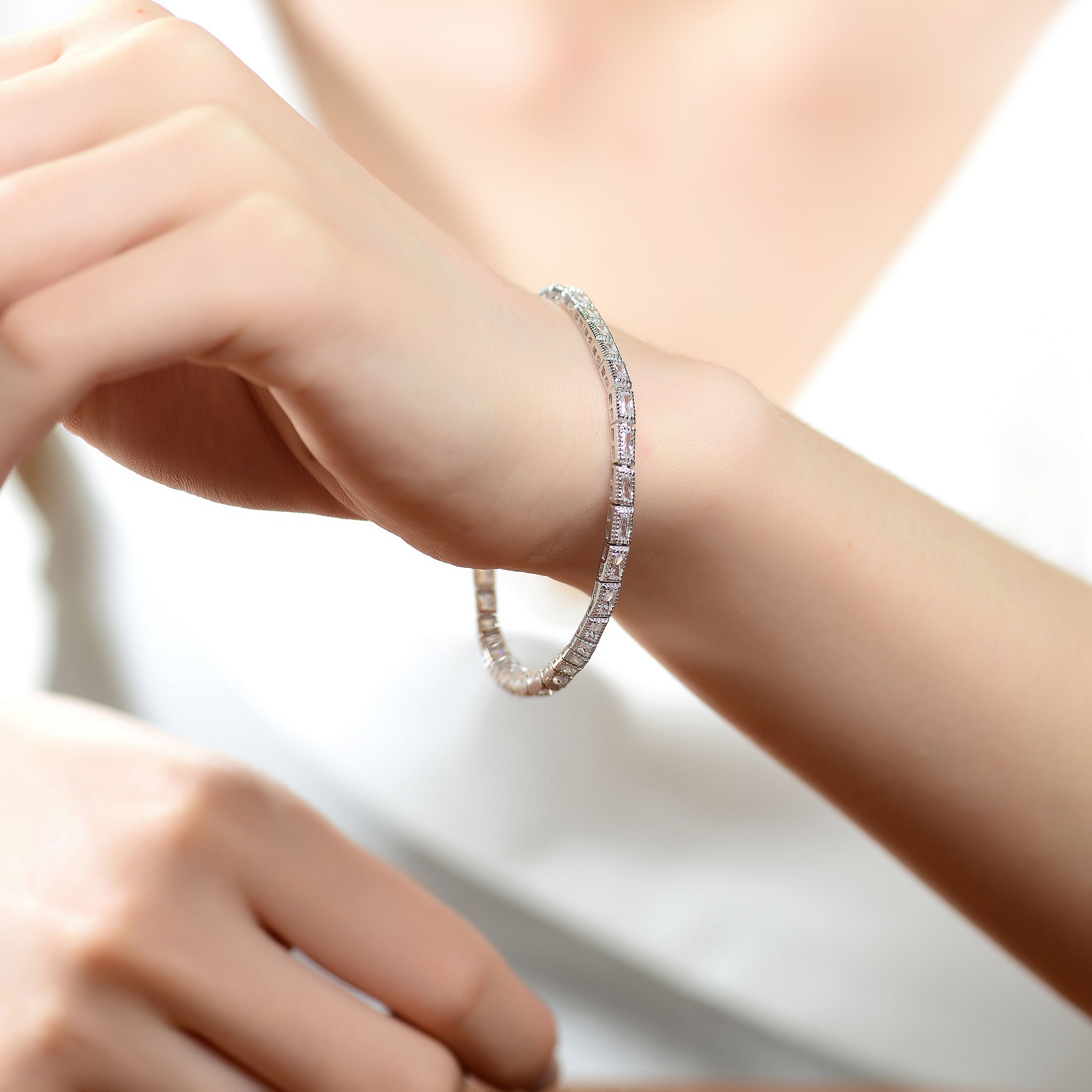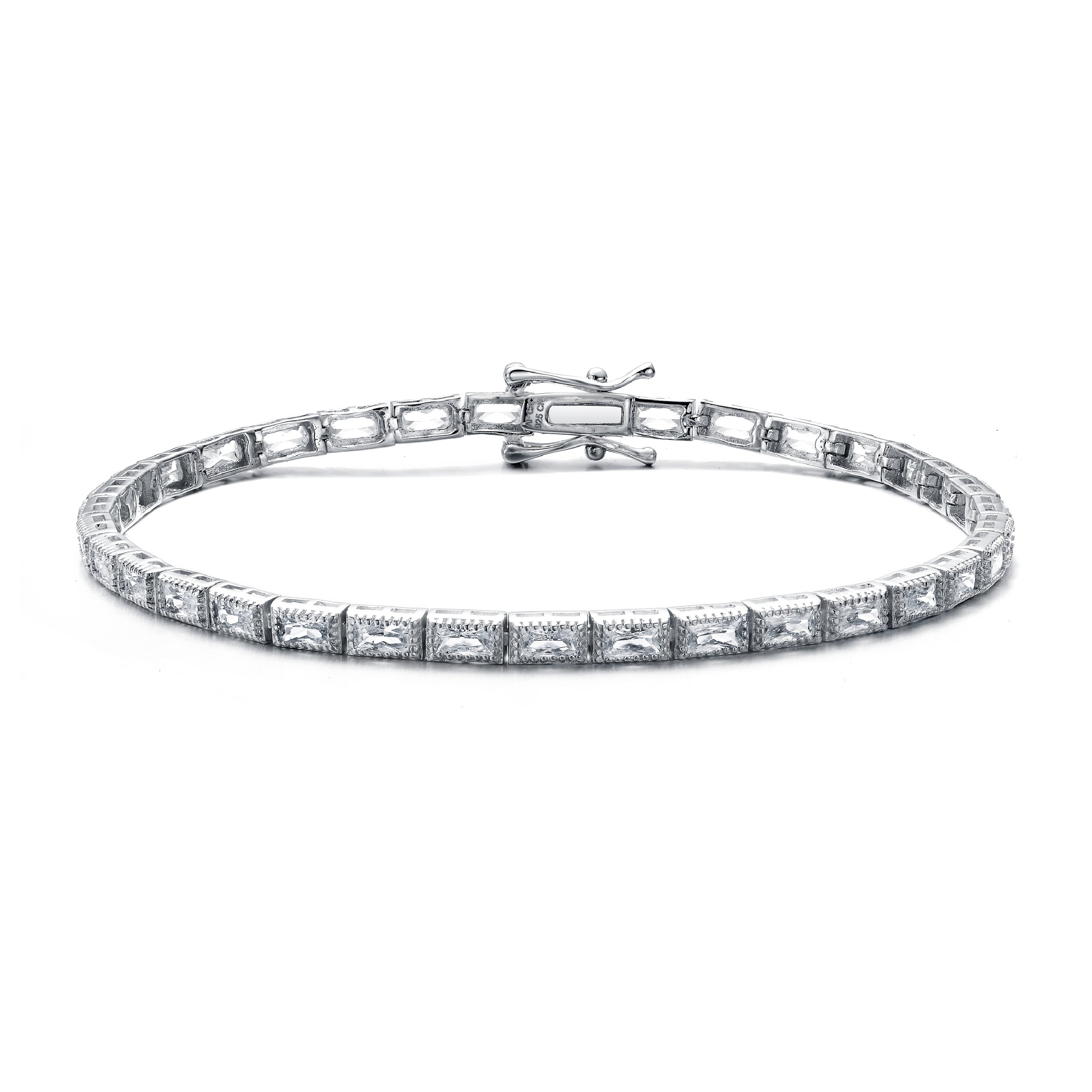 Wear it anytime! This vintage-style tennis bracelet shimmers with baguette-cut cubic zirconias bezel set in milgrain rectangular links. A hidden box clasp and two figure eight safeties keep this beautiful bracelet secure, all crafted in a durable rhodium-plated sterling silver finish.