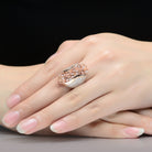 Features 2 rows of pronged morganite cubic zirconia accents in the middle and paved clear gemstones on both sides beautifully placed in the setting. This ring is made from .925 sterling silver plated with rose gold.