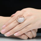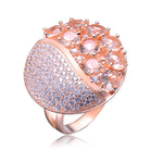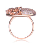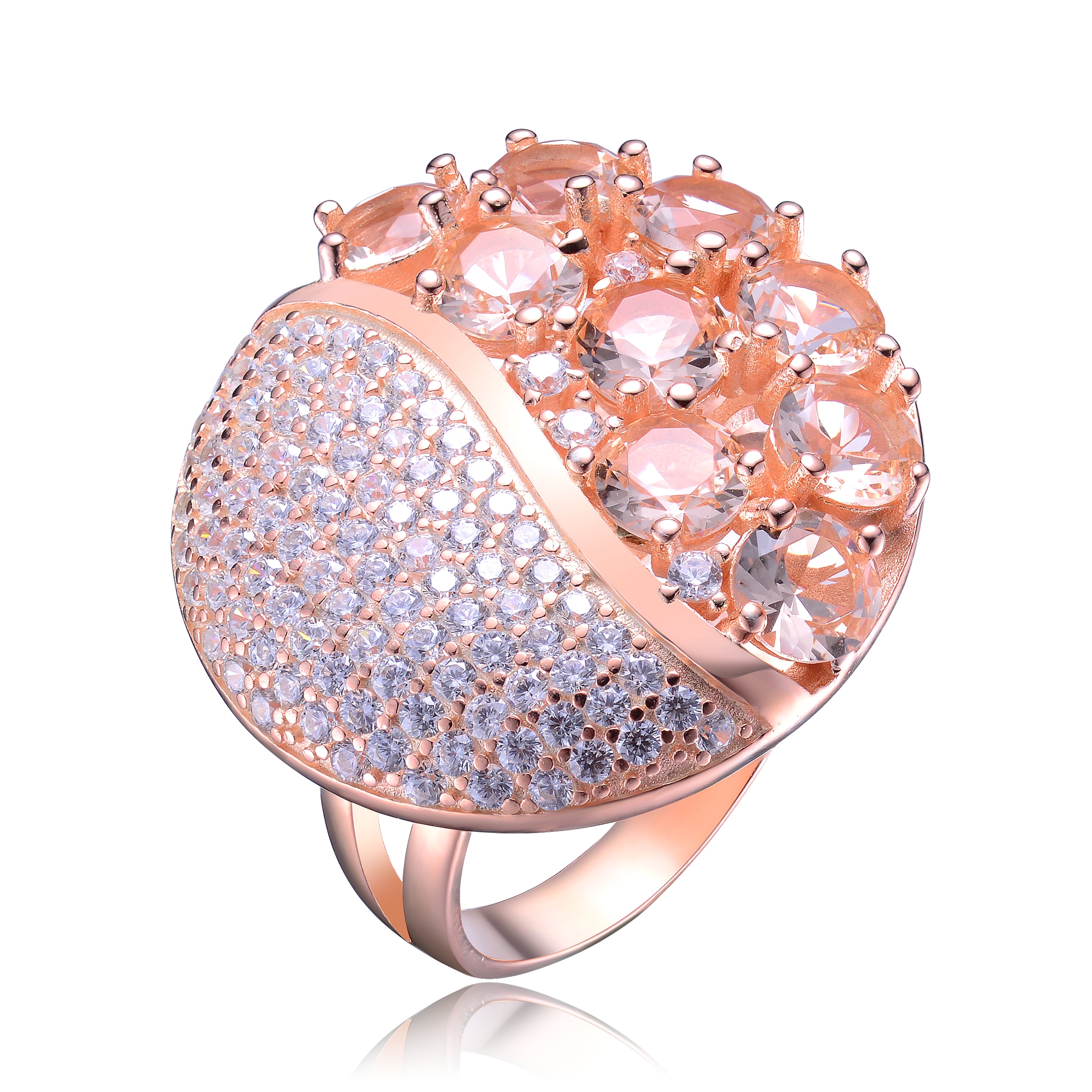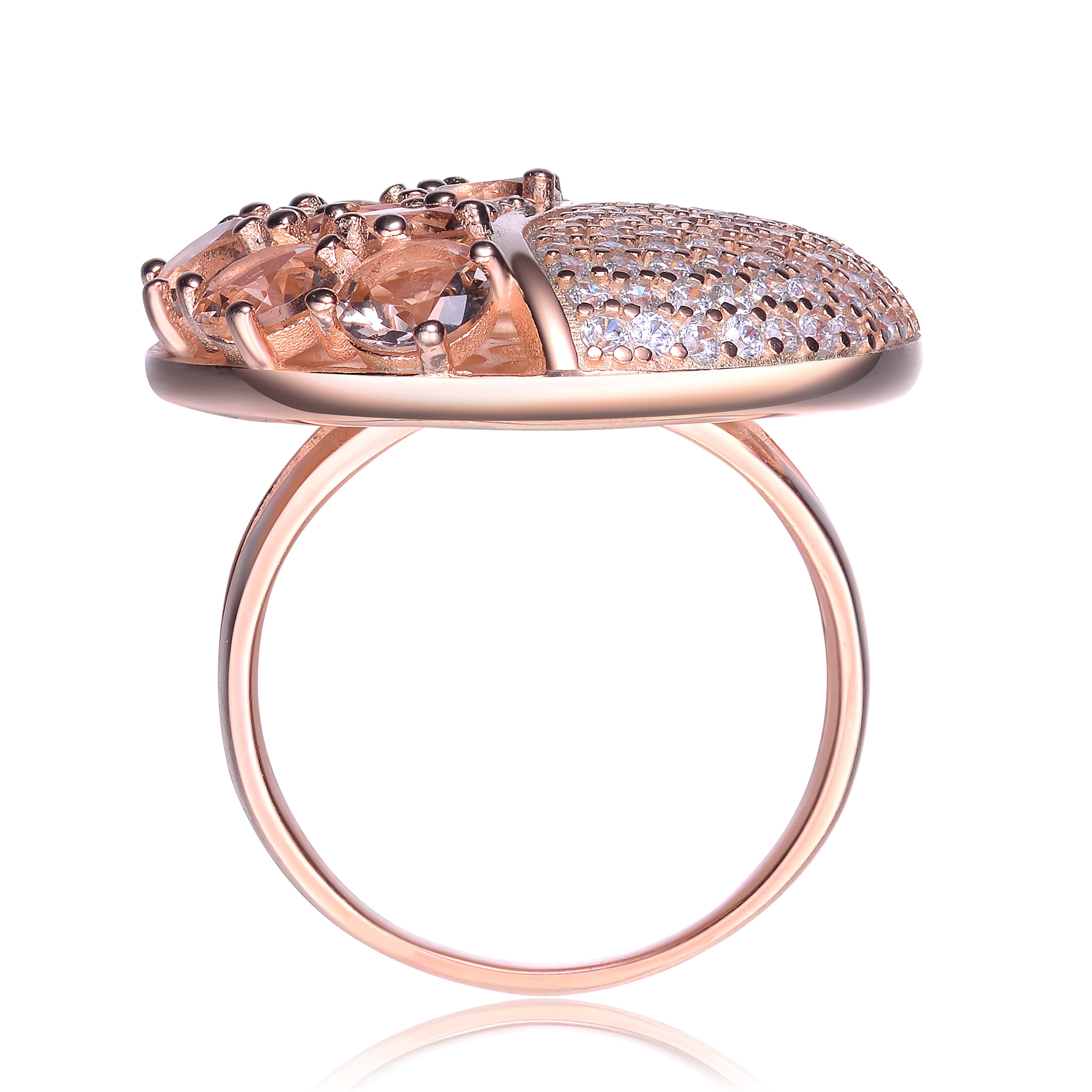 Yin yang inspired design feature paved clear cubic zirconia and the half features pronged of mid size morganite cubic zirconia gemstone beautifully placed in the setting. This ring is made from .925 sterling silver plated with rose gold. Ring size 6,7&8.