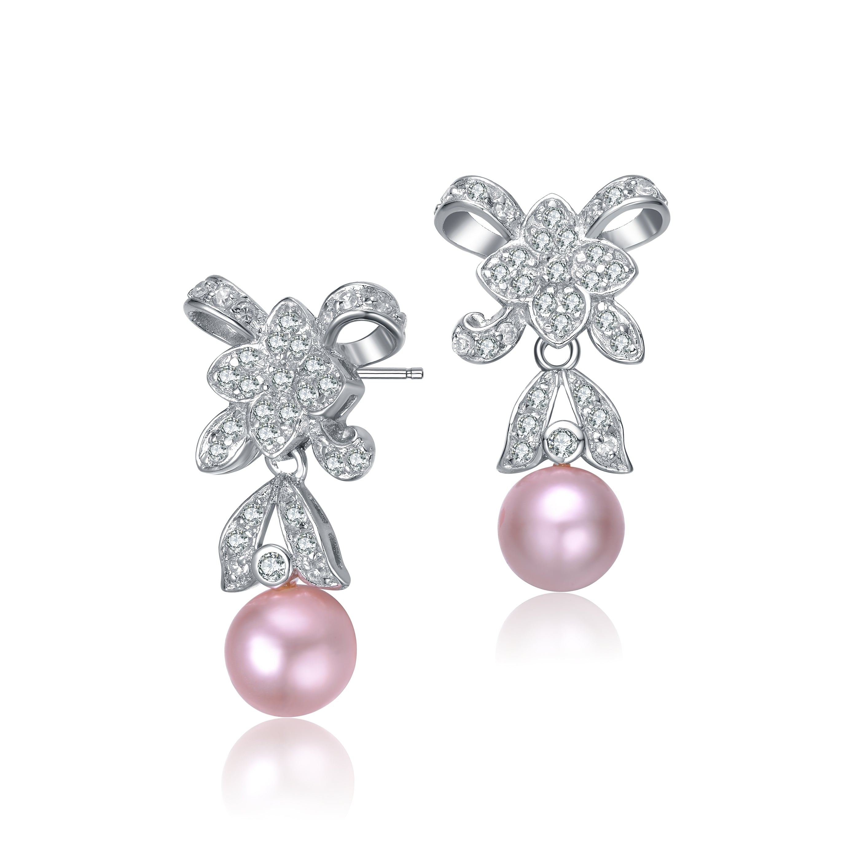 These romantic sterling silver earrings are fit for a princess. They feature clear cubic zirconia stones With a pink Pearl Hanging down.