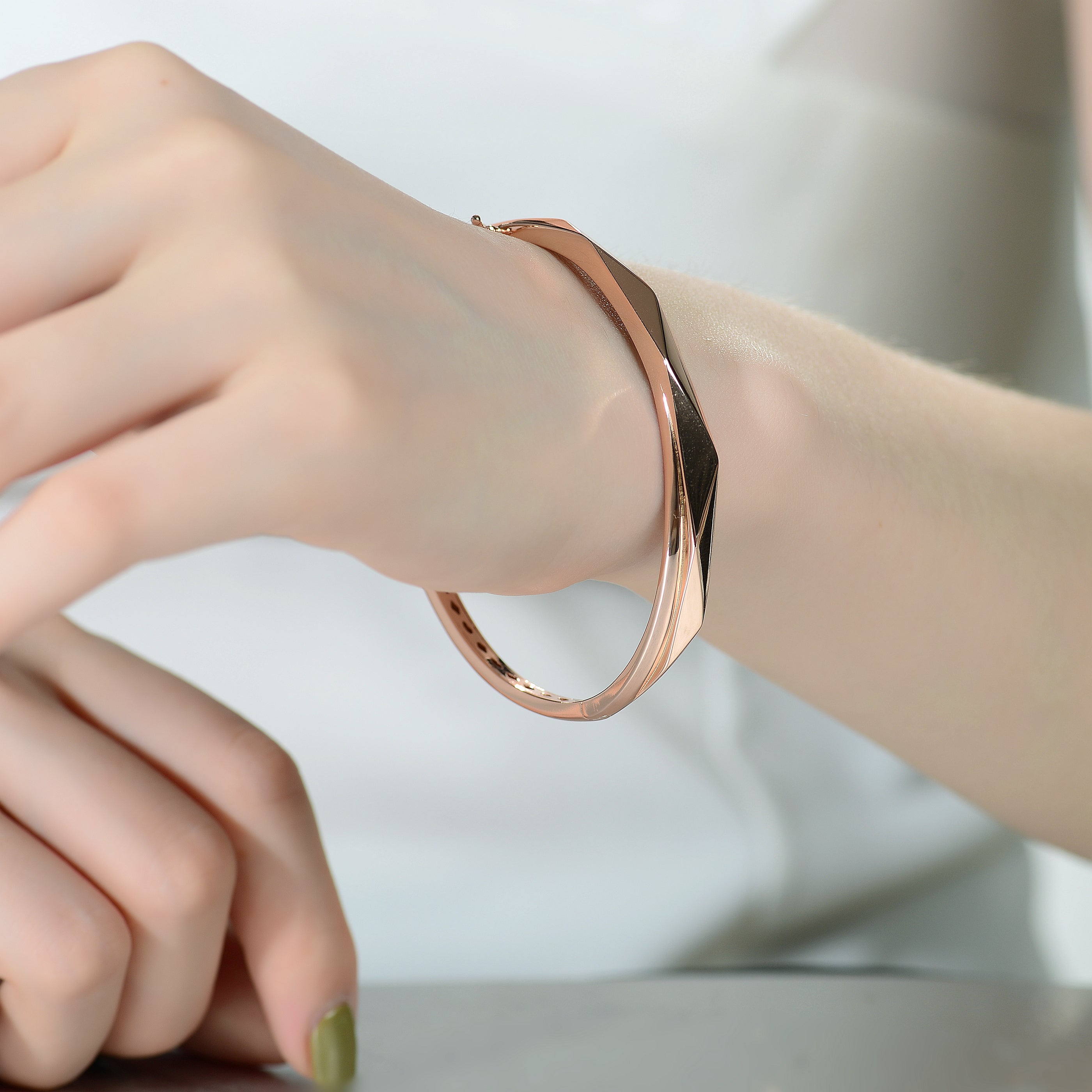 Vintage Sterling Silver with Rose Gold Plating Bangle Bracelet. This bracelet features patterns on the surface of the metal, both on the inside and forepart areas. Crafted of .925 Sterling Silver, the jewelry is secured with an invisible clasp. This piece is perfect on a semi-formal dress.