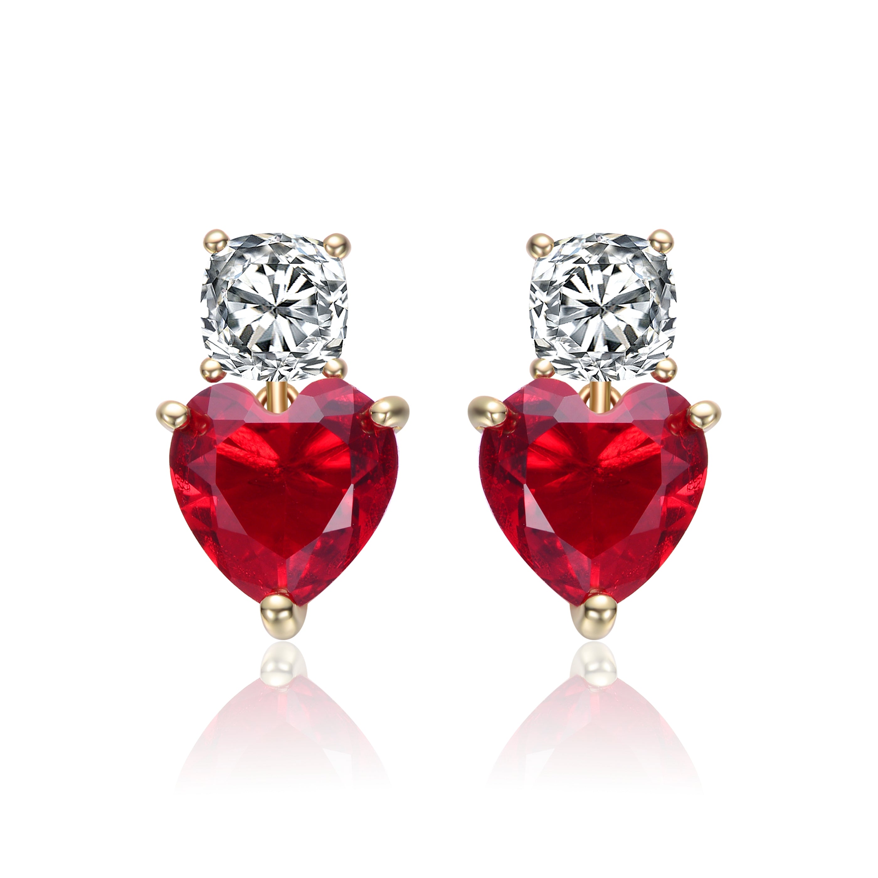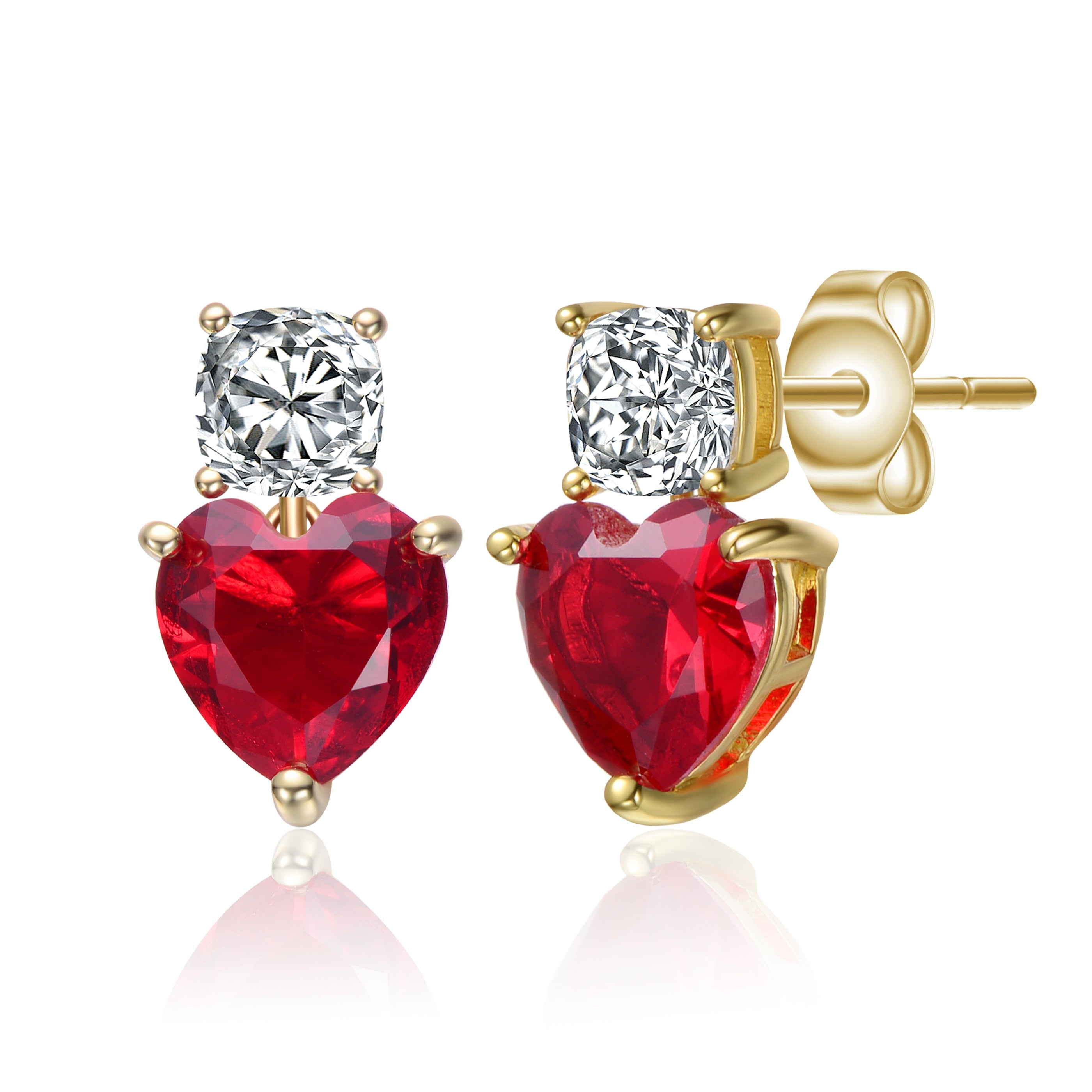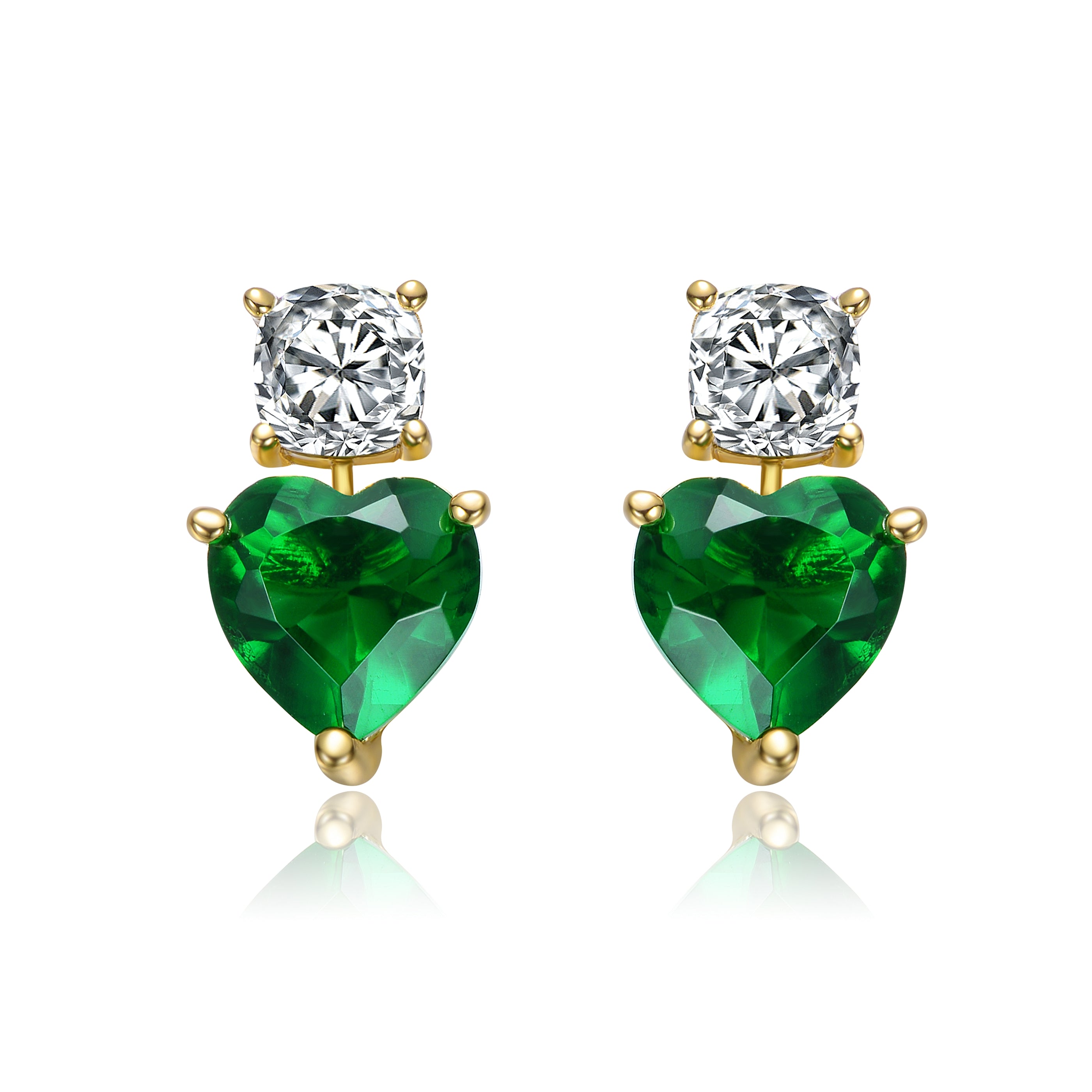 Sterling Silver 14k Gold Plated with Colored Cubic Zirconia Two-Stone Heart Earrings. Add the super-sweetness of hearts to your jewelry collection with these 14k gold plated earrings, featuring heart-shaped green cubic zirconia on the bottom complemented by round brilliant cut white cubic zirconia on the top. Butterfly backs keep these two-stone earring secure, making them effortless to place on and remove when worn. Give these pretty earrings to any loved on an anniversary, birthday, or holiday, or gift yourself a cute little treat.
