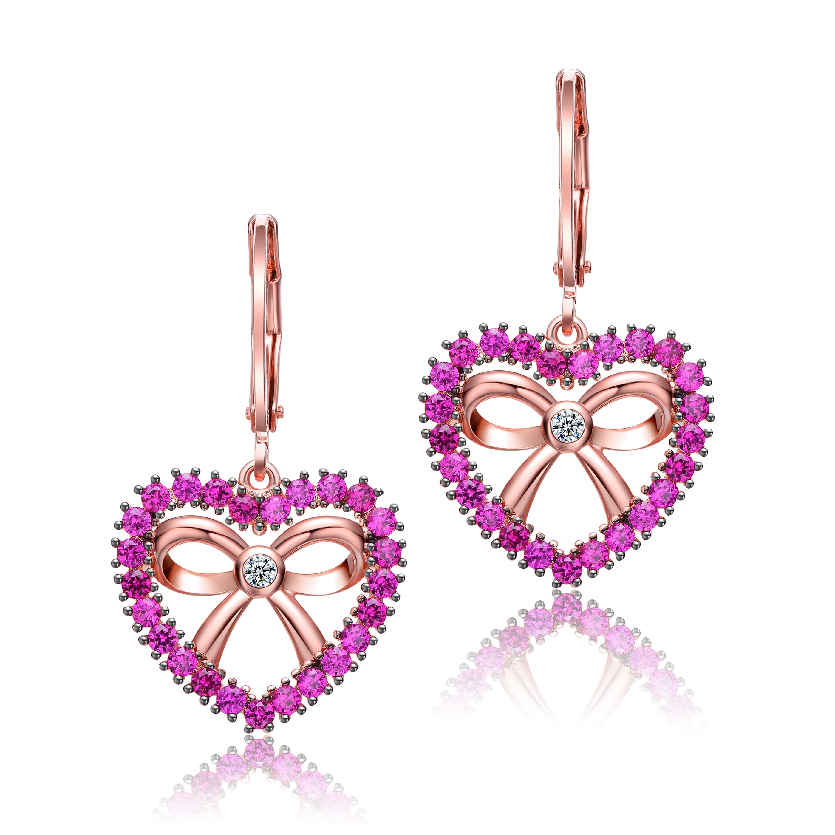 Stylish Sterling Silver with 18K Rose Gold Plated Leverback Earrings. This pair features interesting design that consists of a bowtie within a heart. The heart is made out of ruby red Cubic Zirconia stones set in four prong setting and bowtie's core is accented by clear round Cubic Zirconia stone. Made out of Sterling Silver with 18K Rose Gold Plating and secures with a leverback. This item makes a great gift as well.