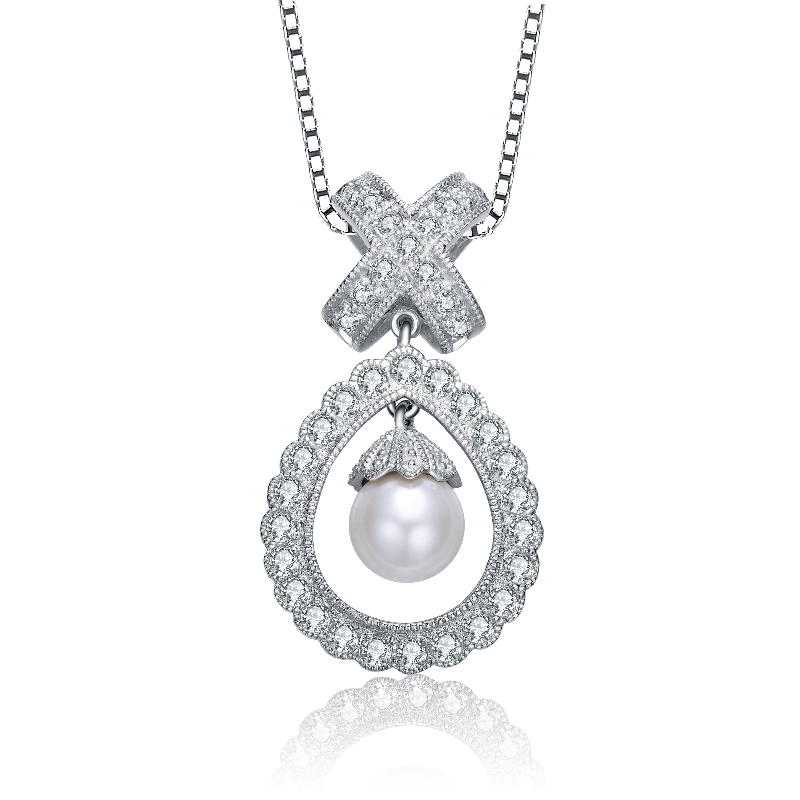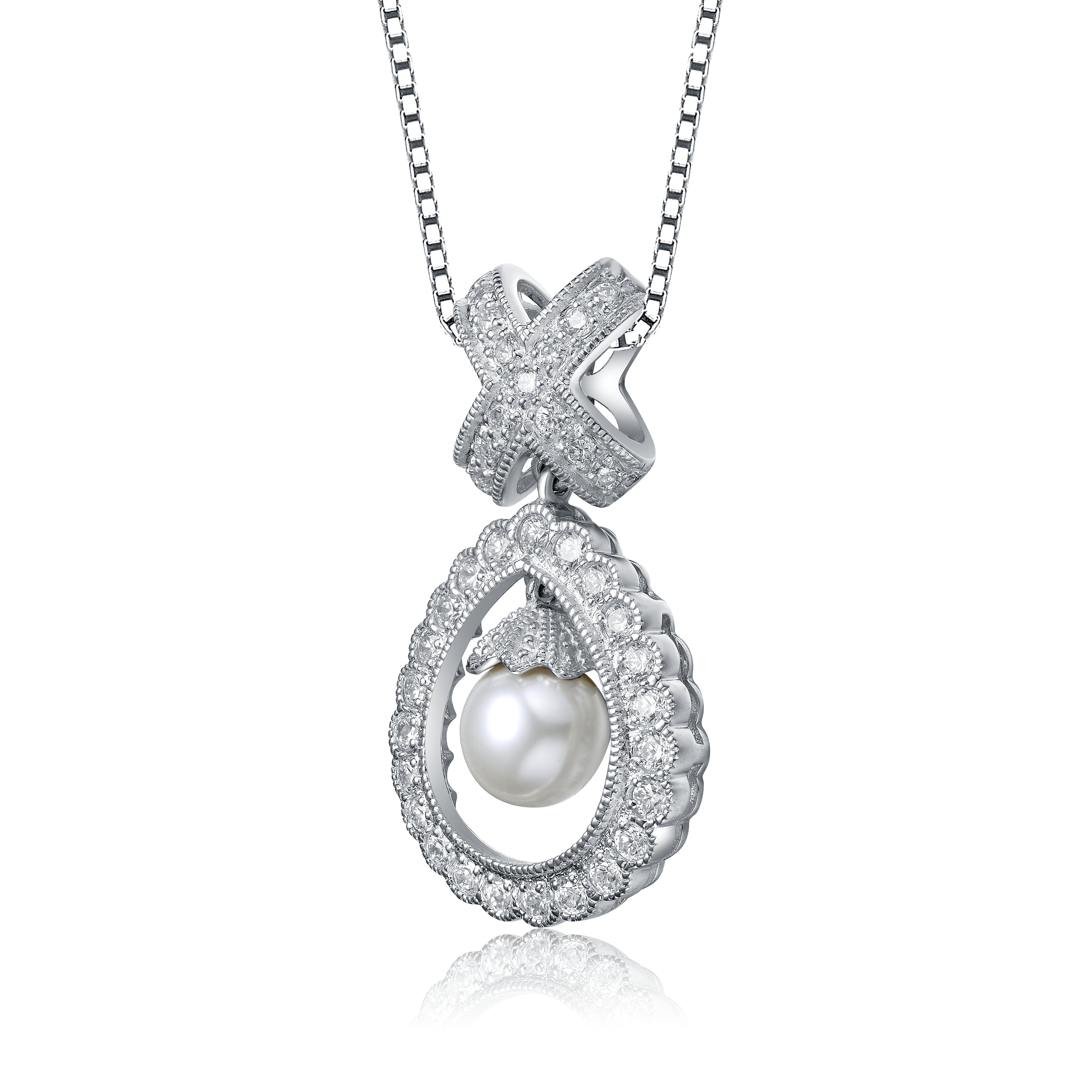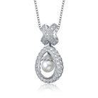 This sophisticated pendant features a lustrous pearl set within an oval frame adorned with sparkling cubic zirconia stones. Above the oval, a cubic zirconia-encrusted cross adds a touch of grace, all suspended from a sterling silver chain with link detailing. The combination of the radiant pearl and the shimmering cubic zirconias creates a striking contrast, making this piece an exquisite addition to any jewelry collection.