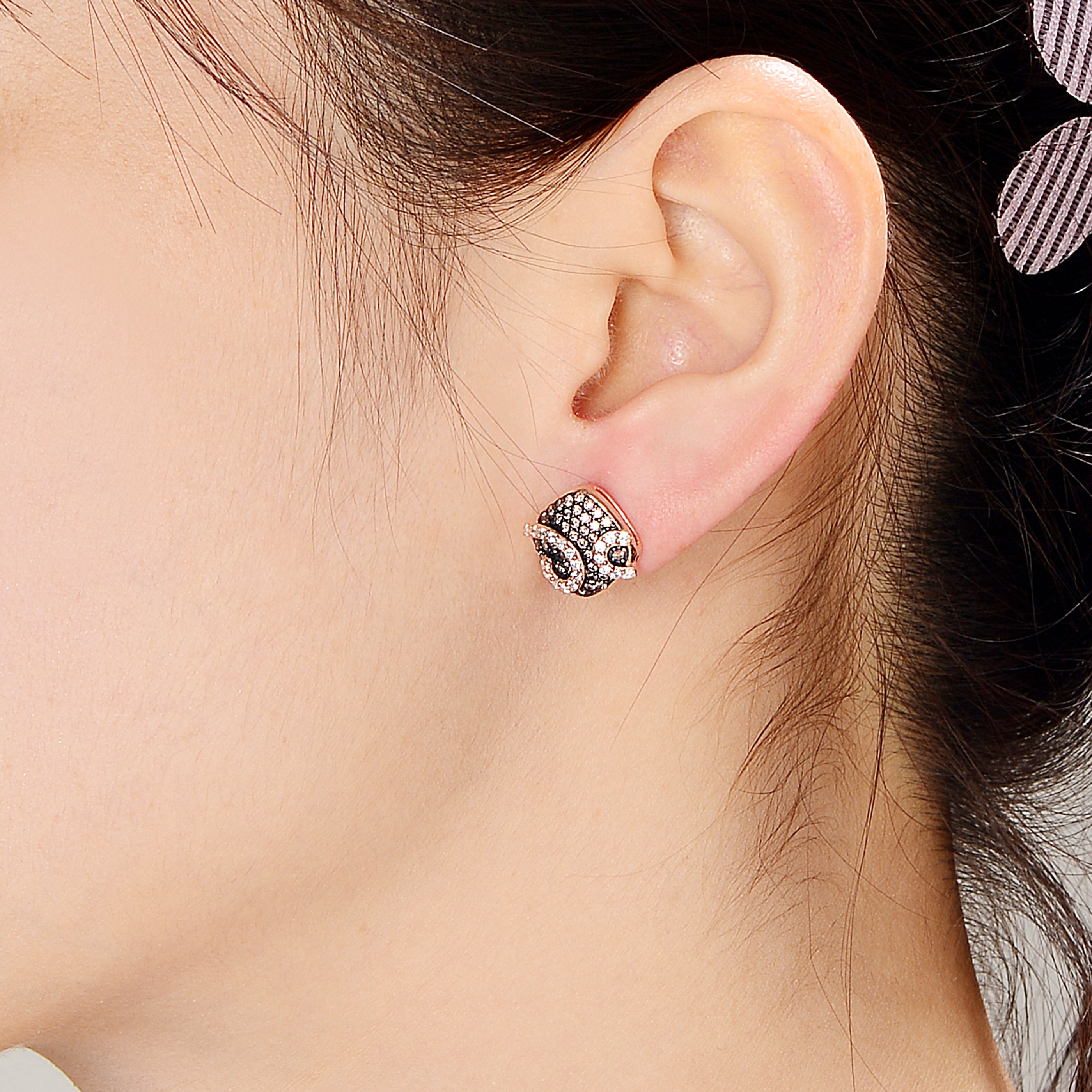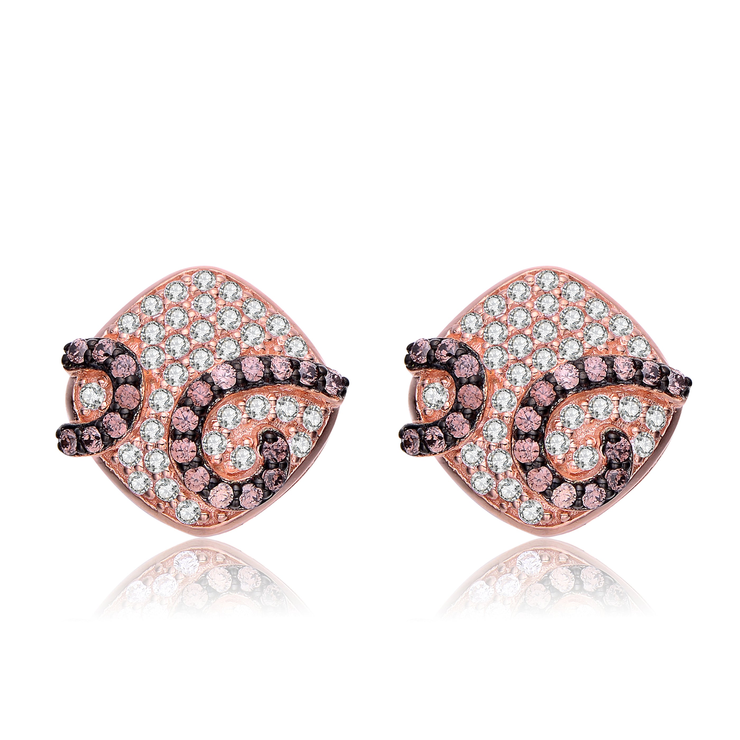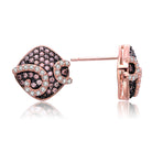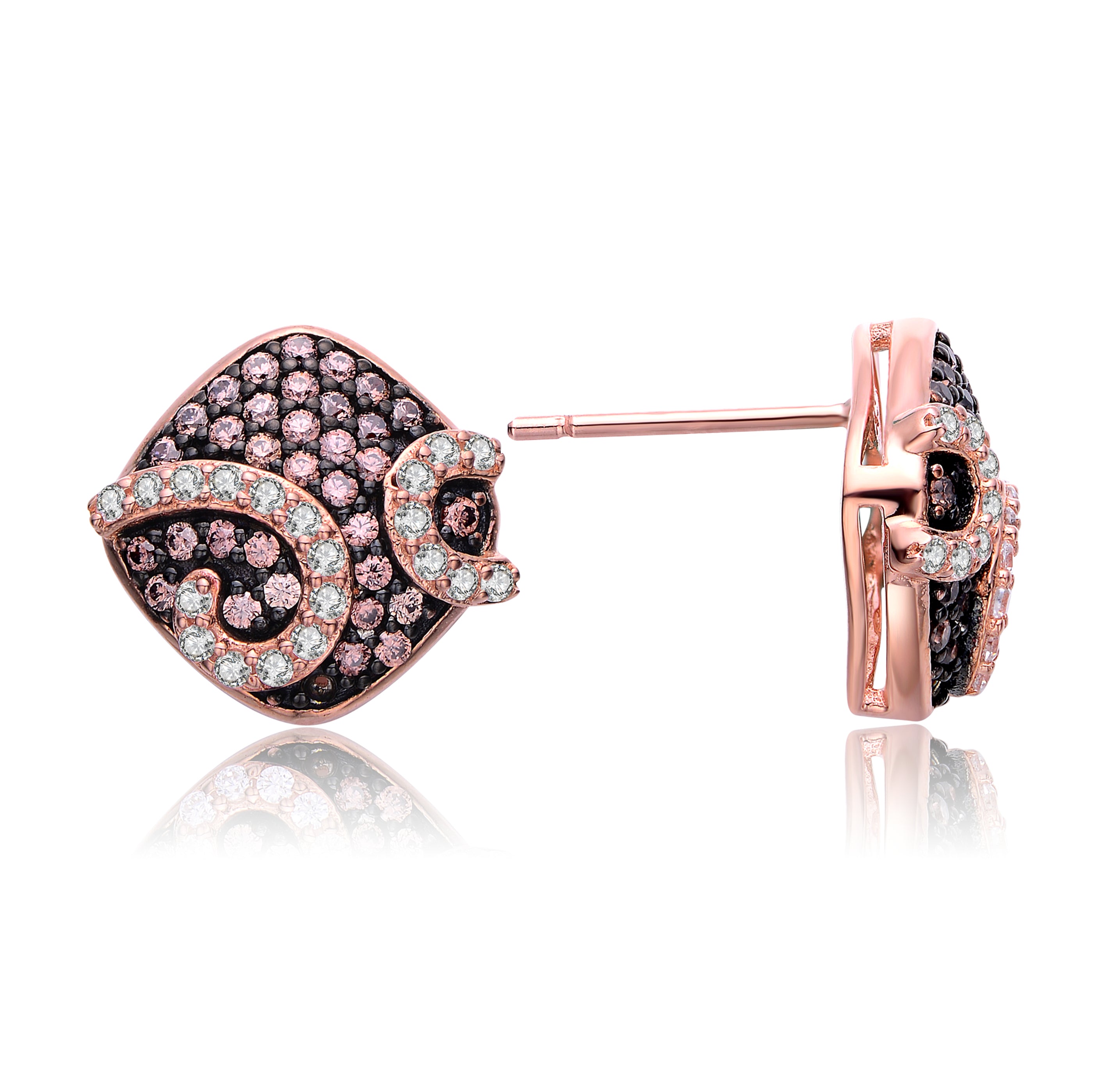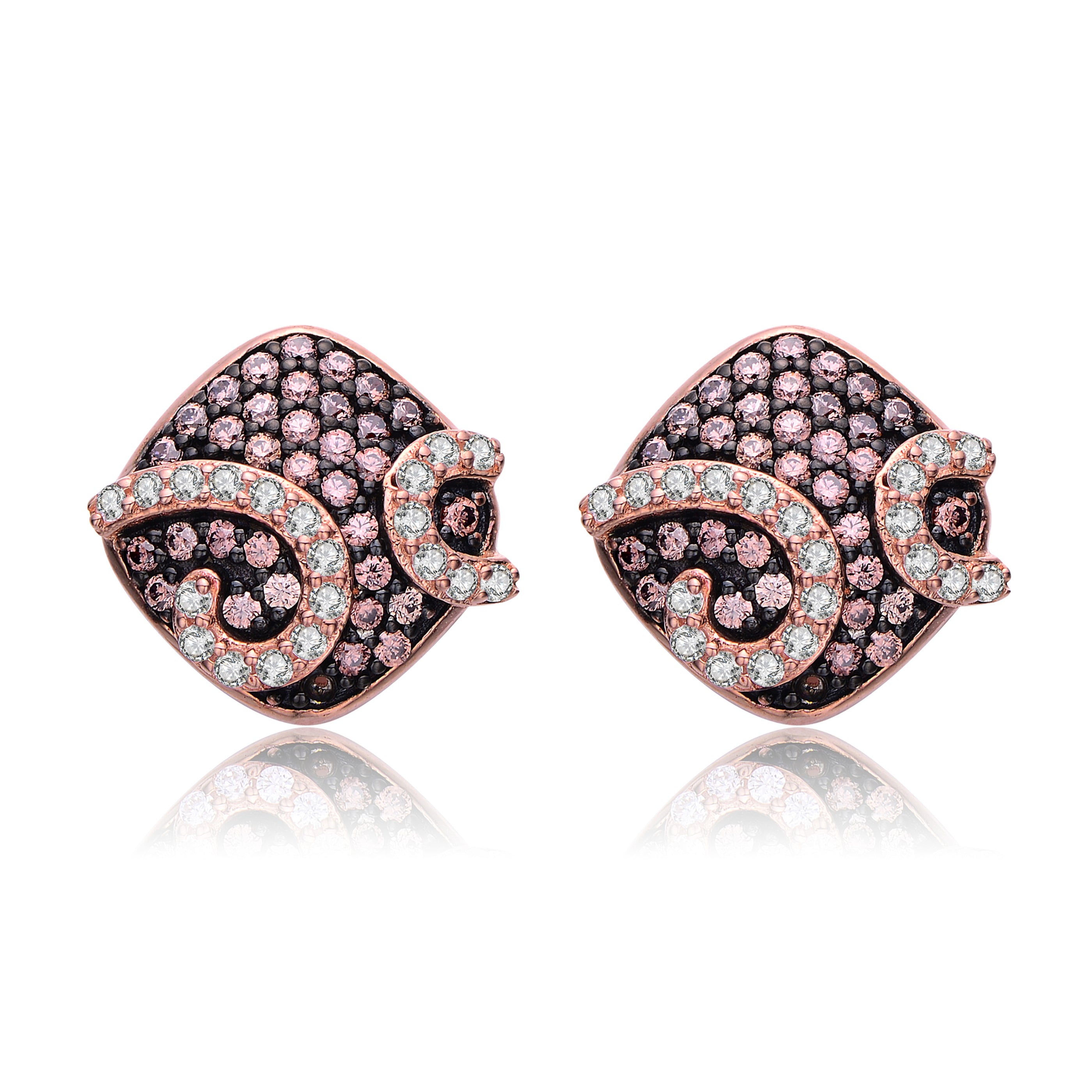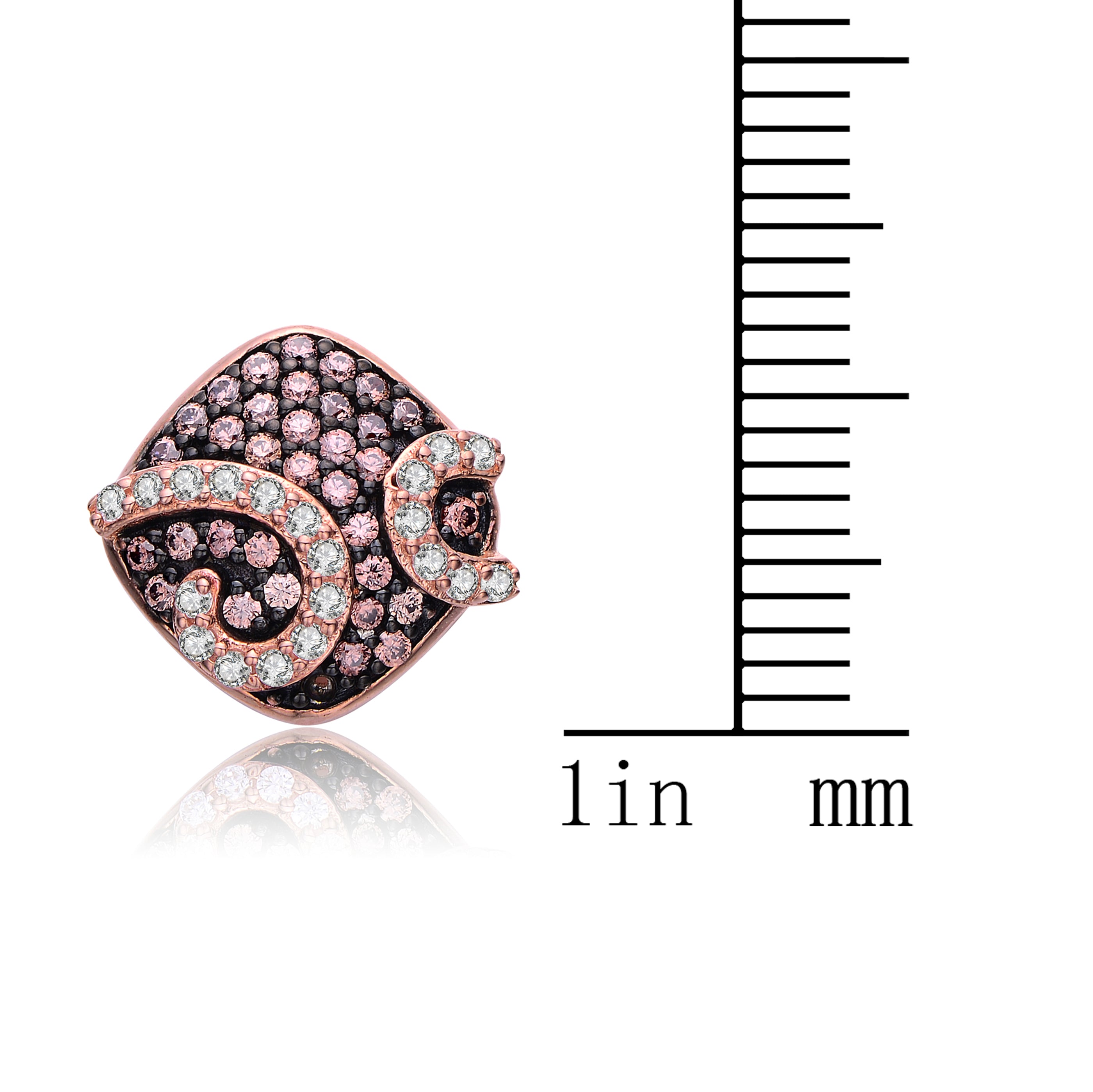 Sterling Silver 18K Rose Gold overlay button earrings are fantastic for any collector. Swirl shape design on these button stud earrings. They also feature pave clear and dark cubic zirconia stones that are sure to sparkle. Butterfly backs keep these earrings in place. Also available in black plating.