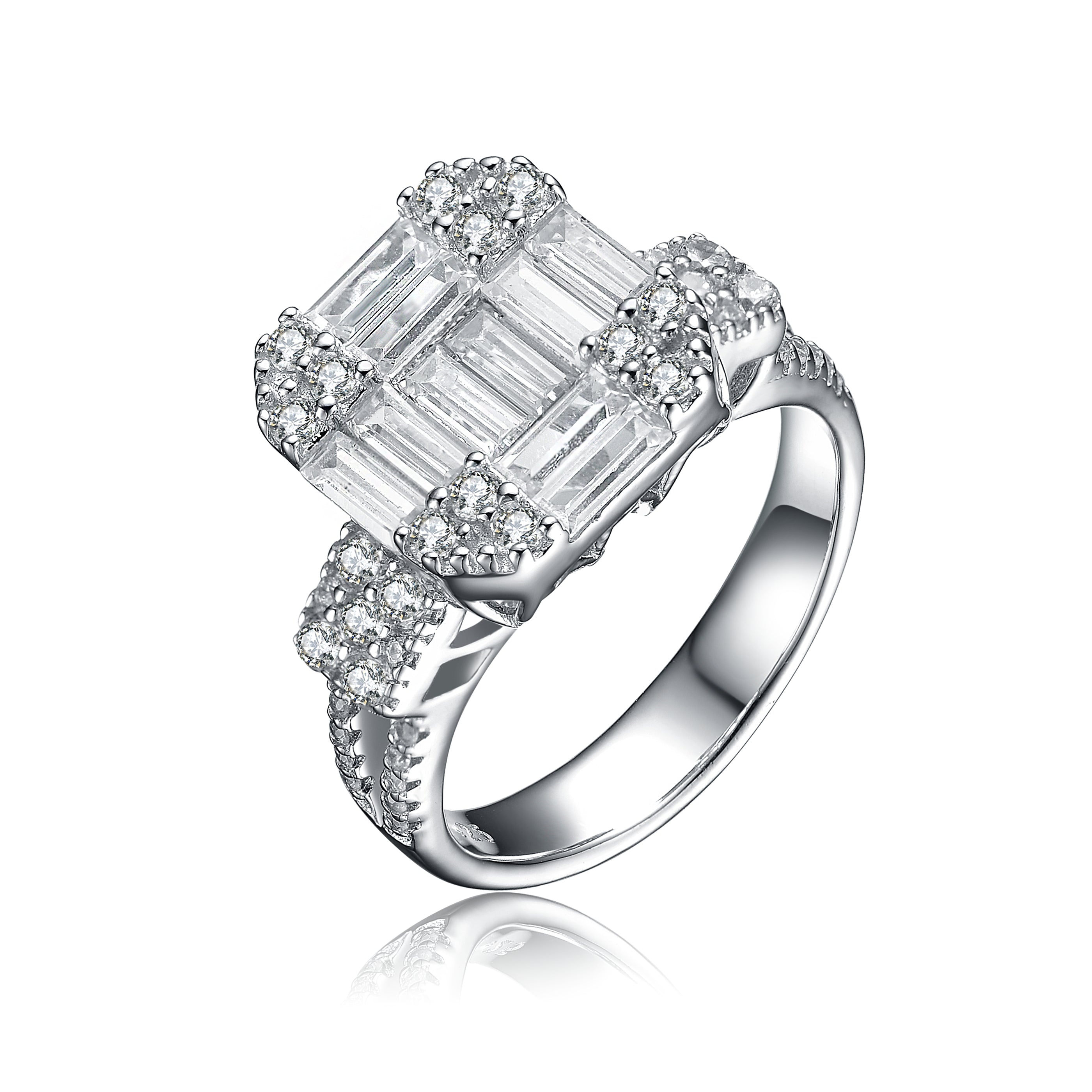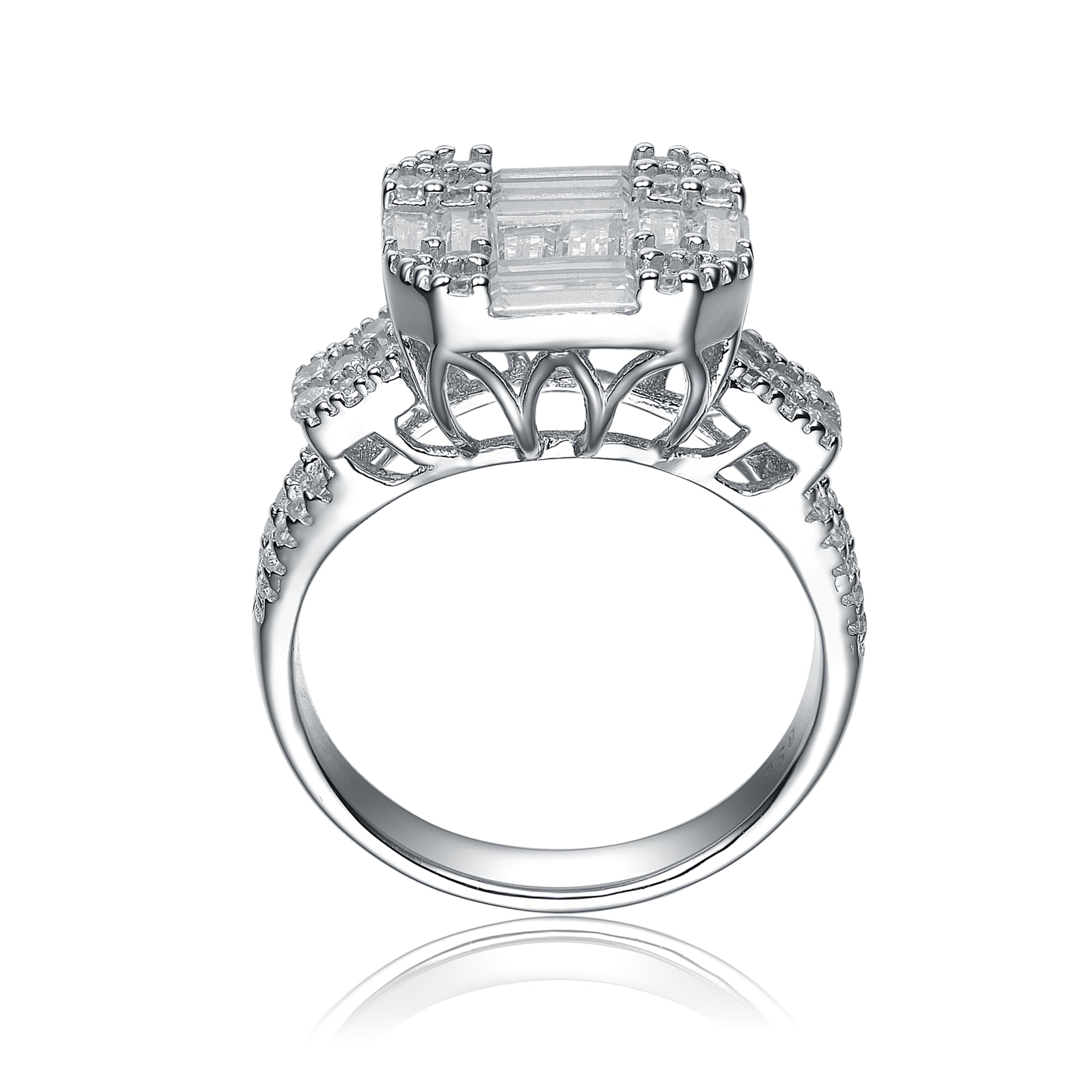 A superior clear emerald-cut cubic zirconia solitaire is the heart of this ring. It’s complemented by two more cubic zirconias for double sparkle.