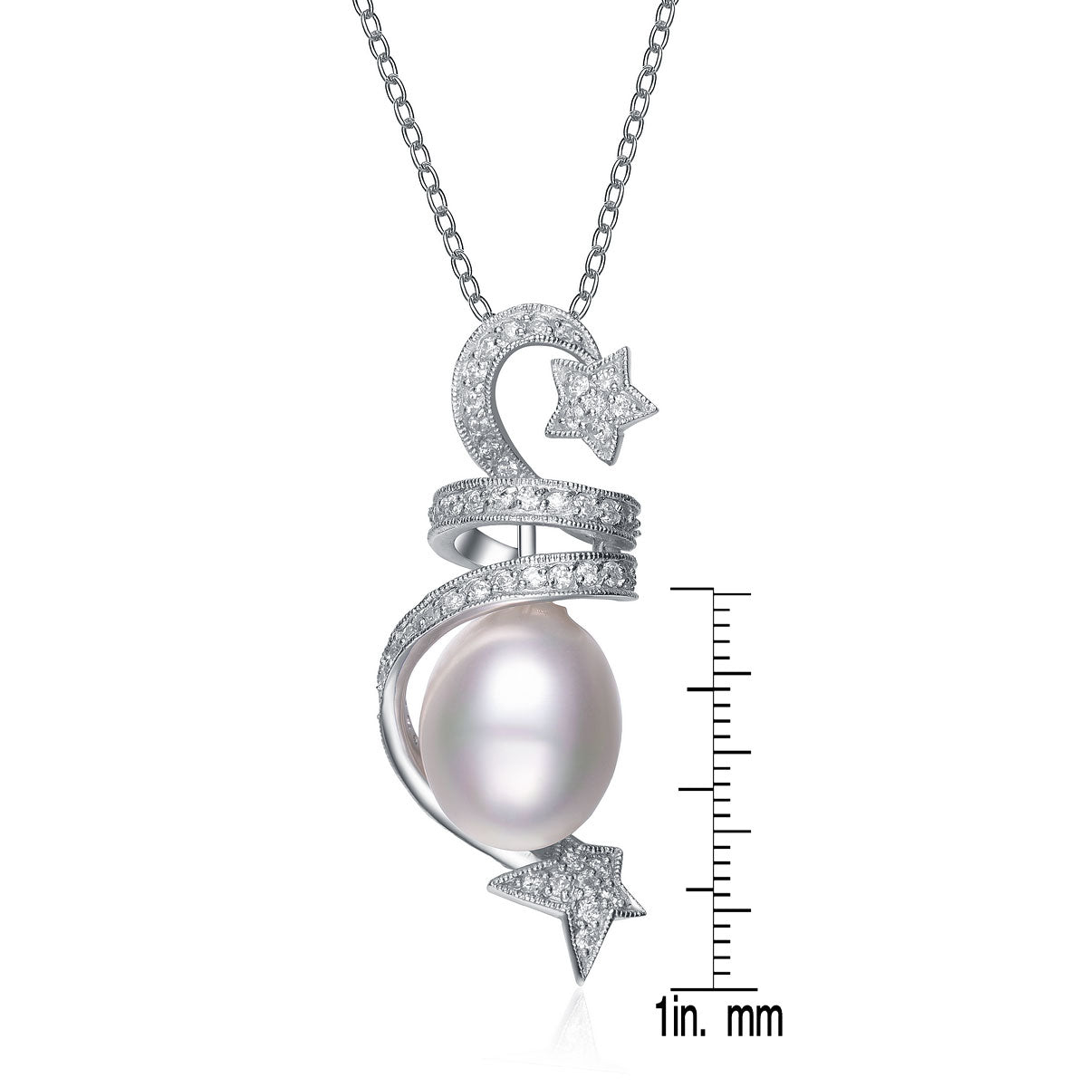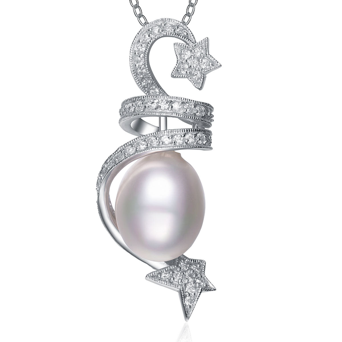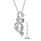A pink pearl is at the core of this delightful sterling silver necklace. It is further wrapped by a star ribbon of clear cubic zirconia stones.